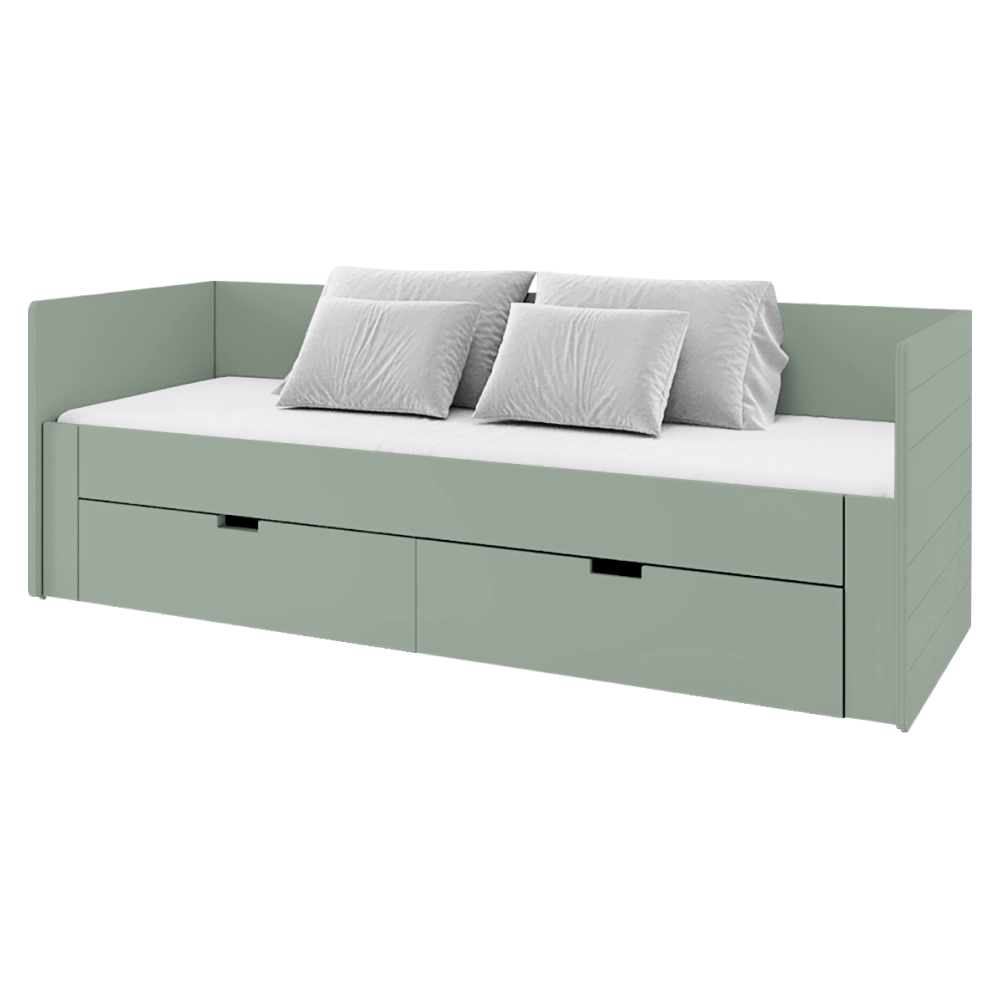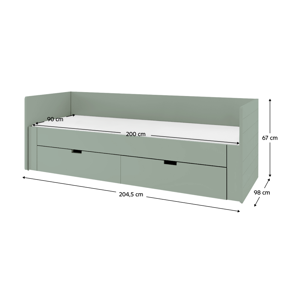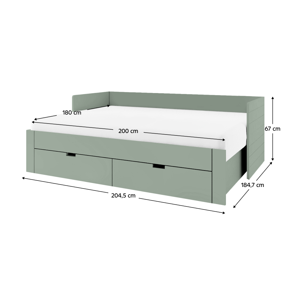 Material: lemn compozit/imitaţie MDF (PAL presat la suprafaţă) Culoare: verde-gri Dimensiuni (Lxlxh): 98/184,7x204,5x67 cm Suprafaţa de dormit (Lxl): 90x200 cm Suprafaţa de dormit după desfăşurare (Lxl): 180x200 cm Grosimea materialului lemn compozit: 1,6-2,2 cm Grosimea materialului MDF: 2,2 cm Înălţimea frontalei din faţă de la podea: 39 cm Introducerea saltelei de la somieră până la laterală: 9 cm Spaţiu de depozitare Două sertare Dimensiunea sertarului interior (Lxlxh): 85x53,5x17 cm Portanţa sertarului: 5 kg Portanţă per persoană: 90 kg Livrat cu somieră somiera conţine lamele de pin Livrat fără saltea Recomandăm achiziţionarea unei saltele cu dimensiunea 90/180x200 Recomandăm achiziţionarea unei saltele suplimentare cu dimensiunea 90x200 De asemenea, saltea pliabilă potrivită 90/180x200 cm Înălţimea recomandată a saltelei: min. 12 cm Produs slovac de calitate Livrat dezasamblat