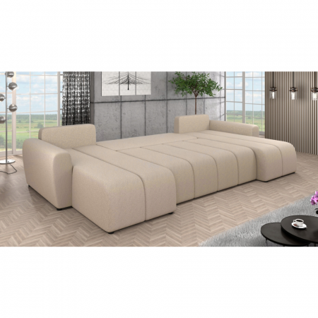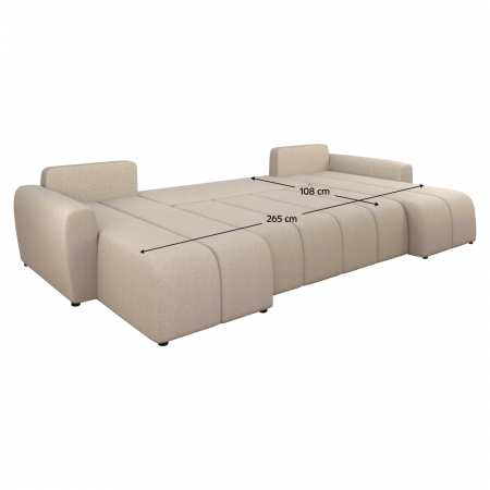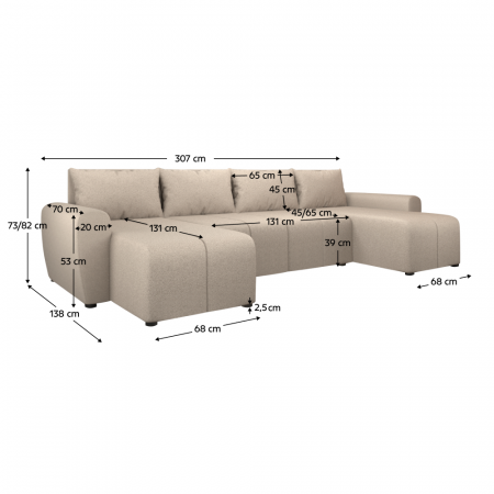 Material: ţesătură Soro 21 Rezistenţa ţesăturii la frecare conform testului Martindale: 90 000 de cicluri de frecare Culoare: bej Dimensiuni (lxAxh): 307x138/138x73/82 cm Extensibilă Suprafaţa pentru dormit (lxL): 108x265 cm Înălţimea părţii de şezut: 39 cm Adâncimea părţii de şezut: 45/65 cm Lăţimea părţii de şezut: 131 cm Cu picioare Material picioare: plastic Culoare picioare: neagră Înălţimea compartimentului inferior de la podea: 2,5 cm Umplutură: Spumă PUR T28 Design universal În formă de U Se colţ Cu spaţiu de depozitare Livrat cu perne Dimensiuni ale pernei spătarului (lxh): 65x45 cm Decorativ matlasat Livrat dezasamblat