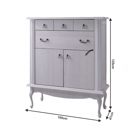 Material: DTD laminat/muchii ABS Culoare: pin alb Dimensiuni (LxGxÎ): 105x47x125 cm Înălţimea spaţiului inferior de la podea: 25 cm Grosimea materialului: 30 mm Patru sertare Efect 3D Mânere din metal Picioare din lemn Muchii ABS Stil baroc