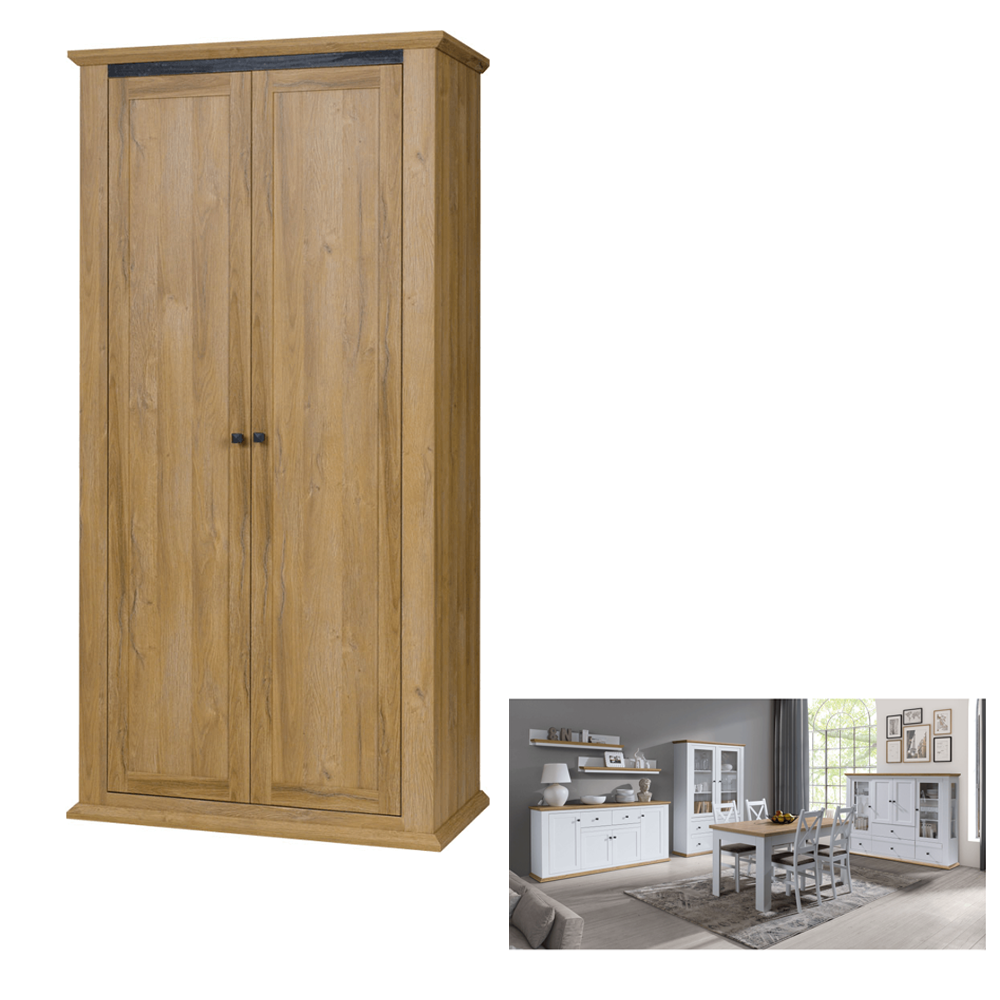 Material: DTD laminat/muchii ABS Culoare: alb/stejar grand Dimensiuni (LxGxÎ): 100x54x200 cm Grosimea materialului: 40 mm Două uşi Cu parte pentru umeraşe Cu bară pentru umeraşe Cu poliţe Cu efect 3D Elegant În stil provensal Mânere din metal Furnizat nemontat