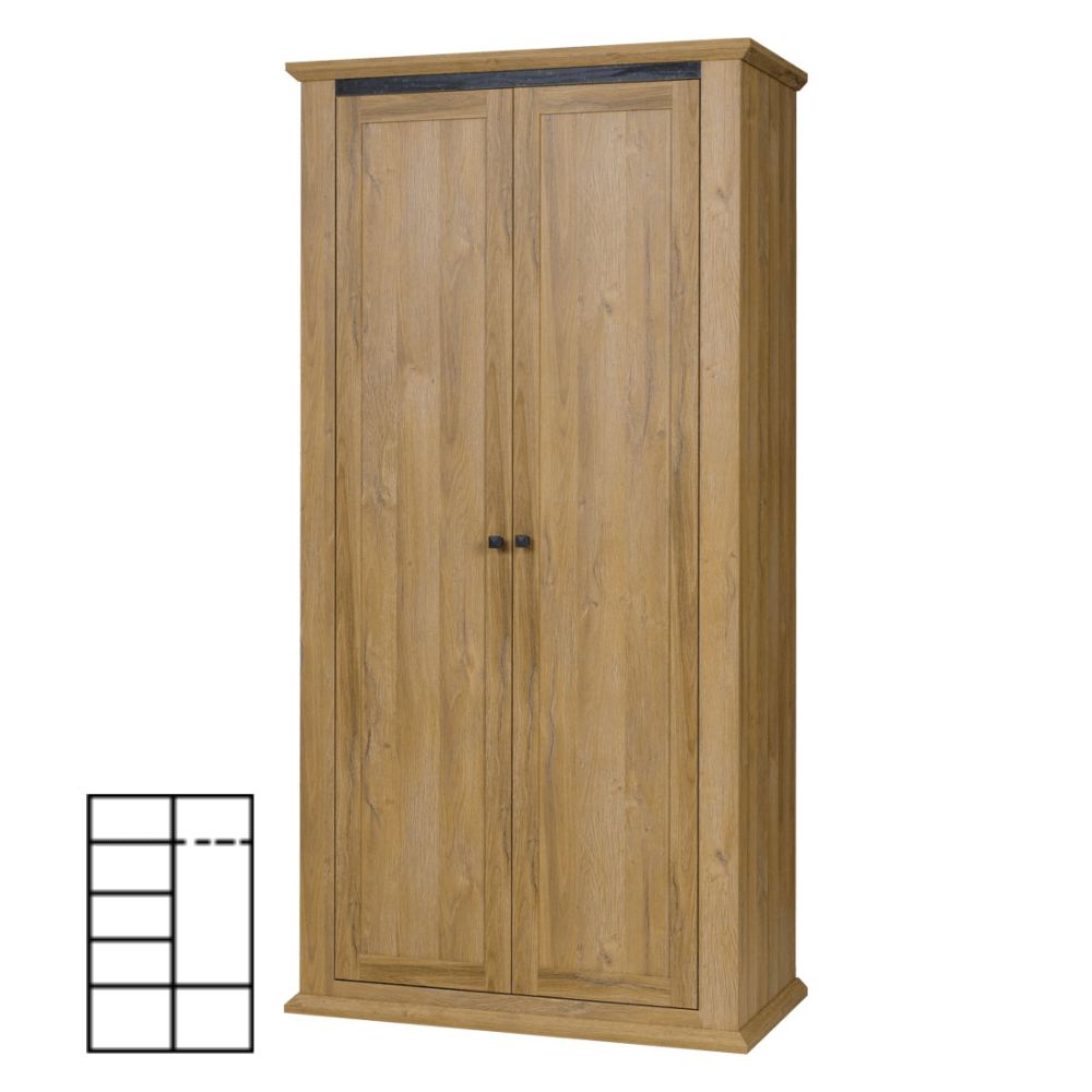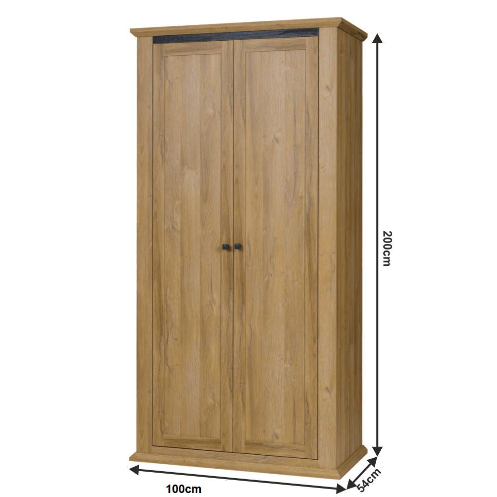 Material: DTD laminat/muchii ABS Culoare: stejar grand Dimensiuni (LxGxÎ): 100x54x200 cm Grosimea materialului: 40 mm Două uşi Parte pentru umeraşe Cu bară pentru umeraşe Cu poliţe Cu cârlige Cu efect 3D Elegant În stil provensal Furnizat nemontat