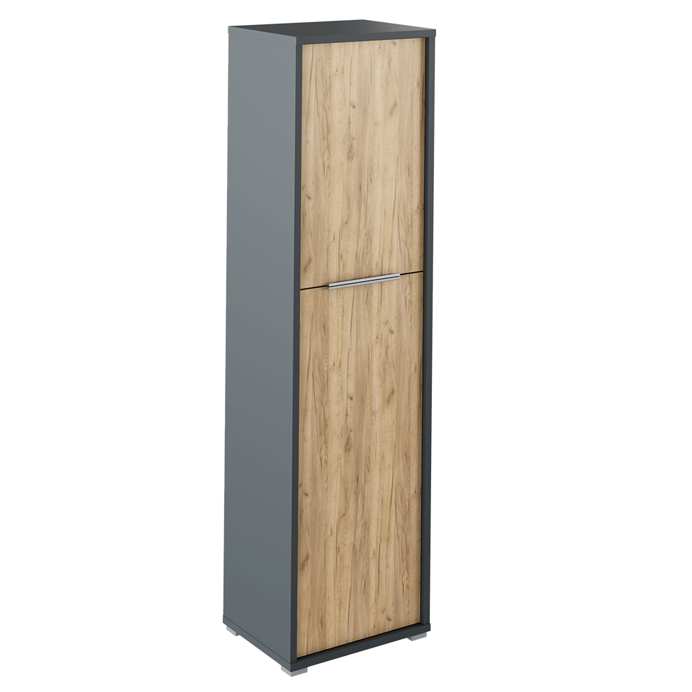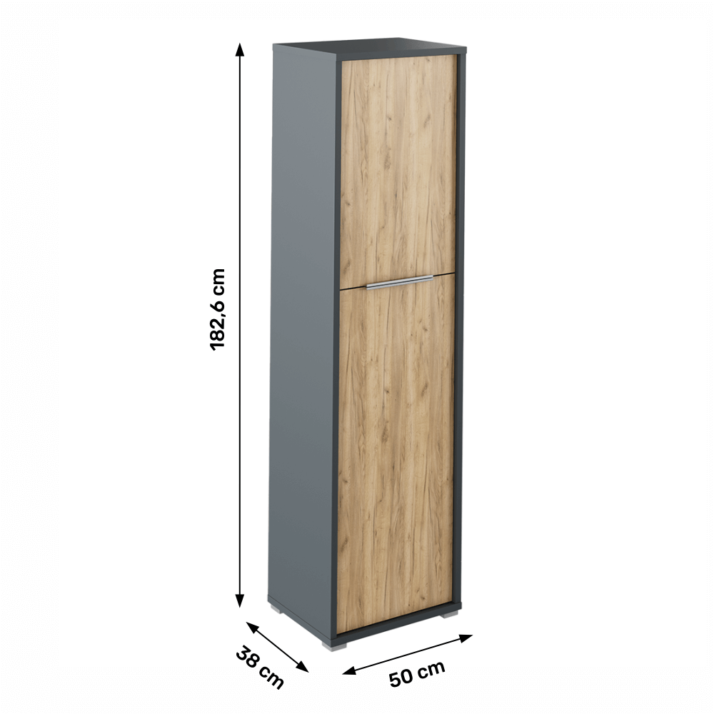 Dulap cu poliţe RIOMA NEW TYP 08 Culoare: grafit/stejar artizanal Material: DTD laminat Dimensiuni (LxGxÎ): 50x38x182,6 cm Grosimea materialului: 16/22 mm Se livrează demontat