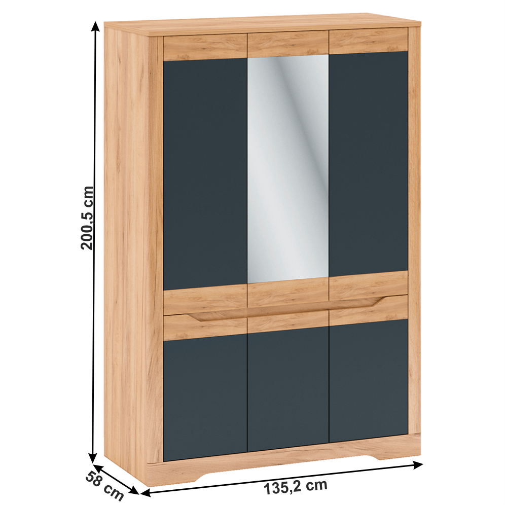"Material: DTD laminat/MDF Culoare: stejar craft auriu/grafit gri Dimensiuni (LxlxÎ): 135,2x58x200,5 cm Grosimea materialului corp: 16 mm Grosimea materialului blatul superior: 22 mm Poliţe Bară pentru umeraşe Oglindă Furnizat nemontat "