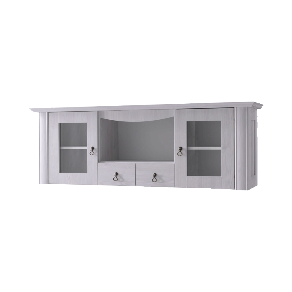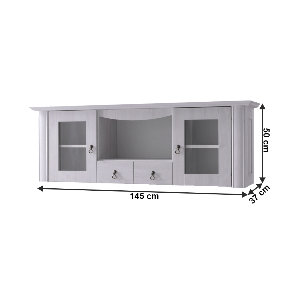 Material: DTD laminat/muchii ABS Culoare: pin alb Dimensiuni (LxGxÎ): 145x37x50 cm Grosimea materialului: 30 mm Două dulapuri Spaţiu deschis Două sertare Efect 3D Mânere din metal Muchii ABS Stil baroc