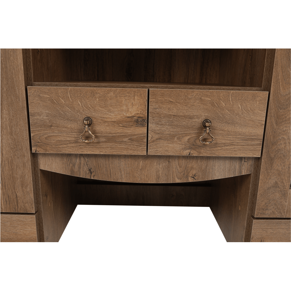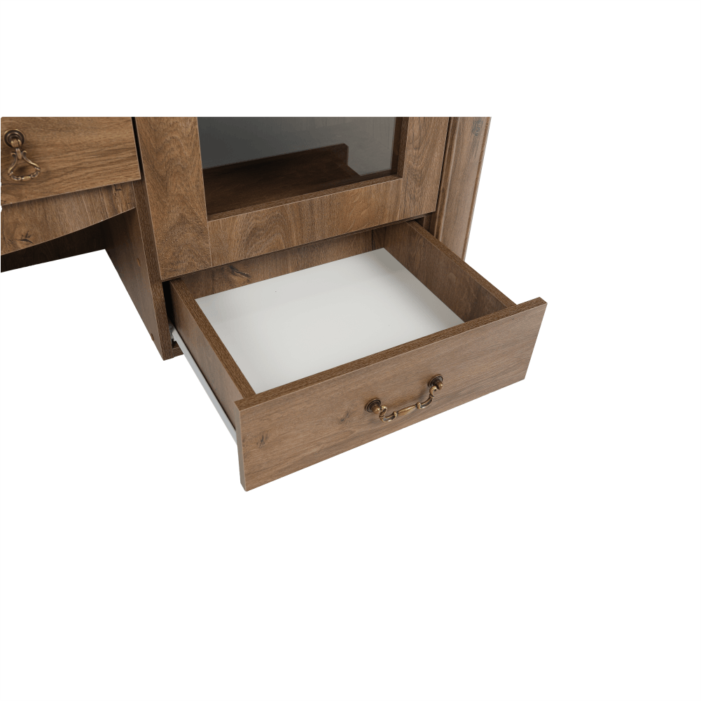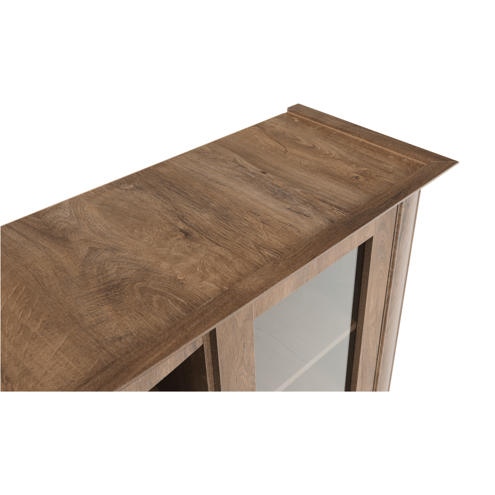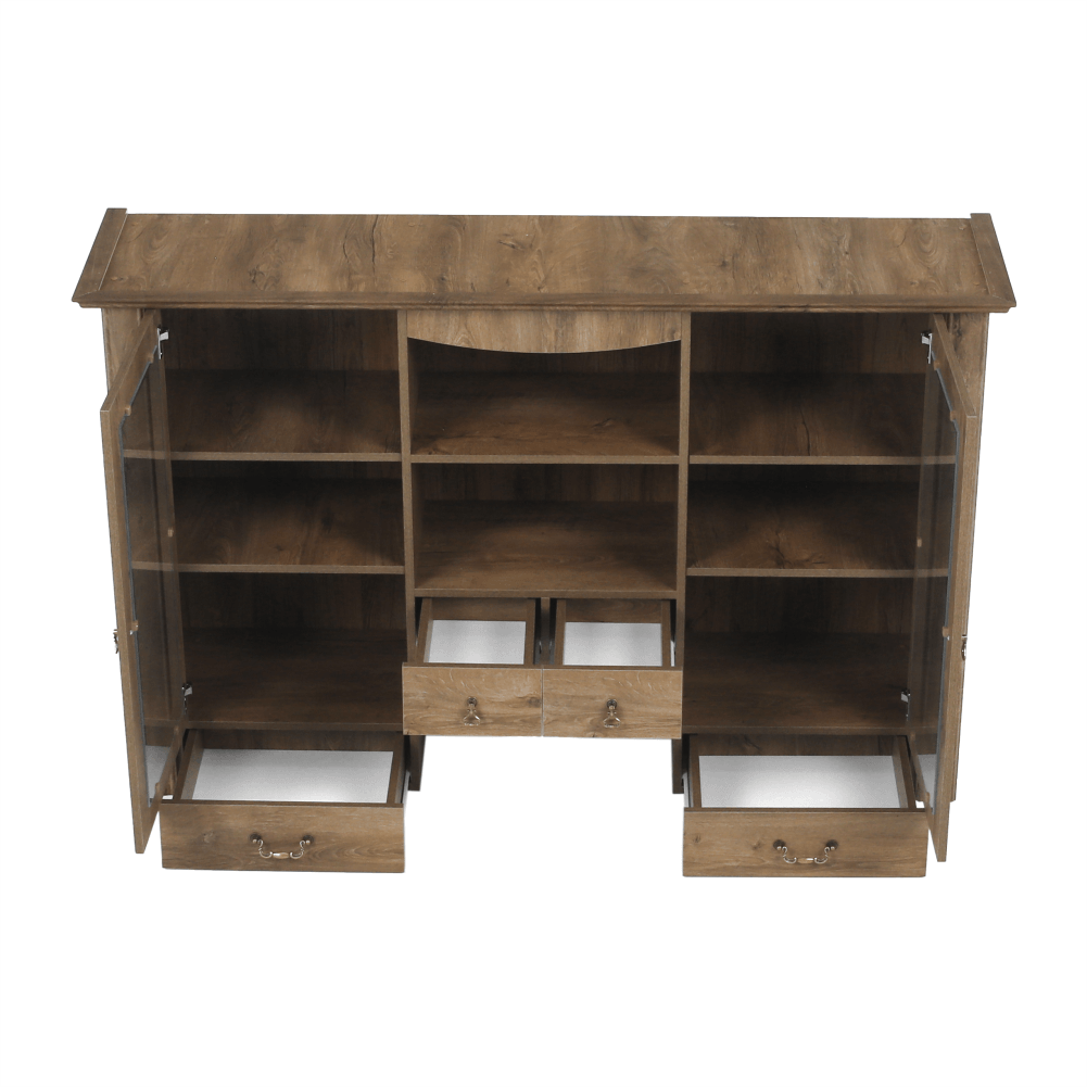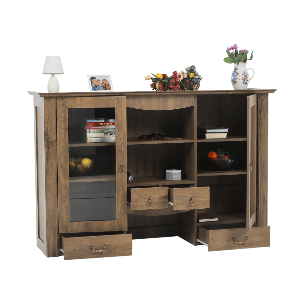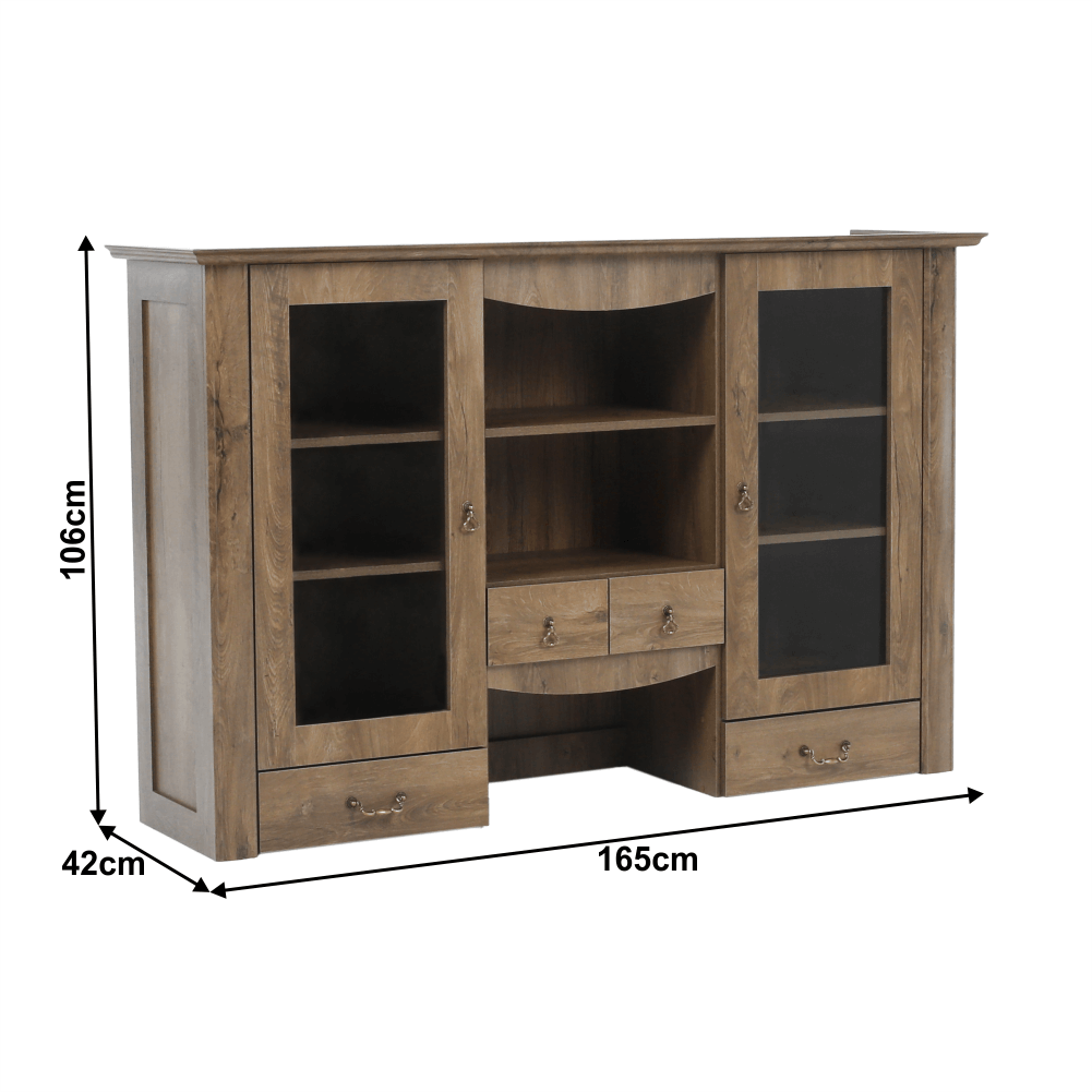 Material: DTD laminat/muchii ABS Culoare: stejar lefkas Dimensiuni (LxGxÎ): 165x42x106 cm Grosimea materialului: 30 mm Două dulapuri Poliţe deschise Patru sertare Efect 3D Mânere din metal Muchii ABS Stil baroc