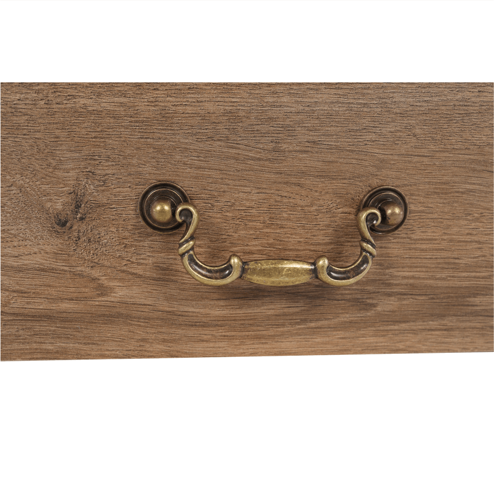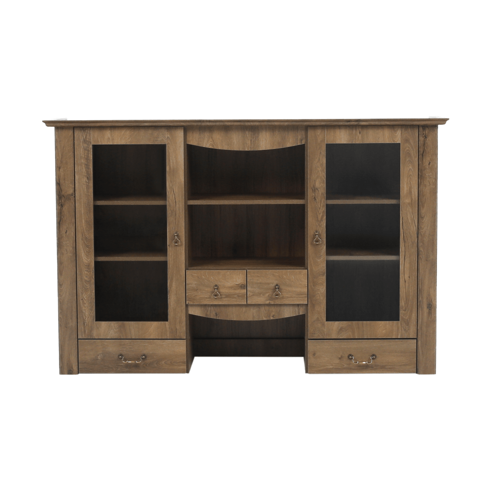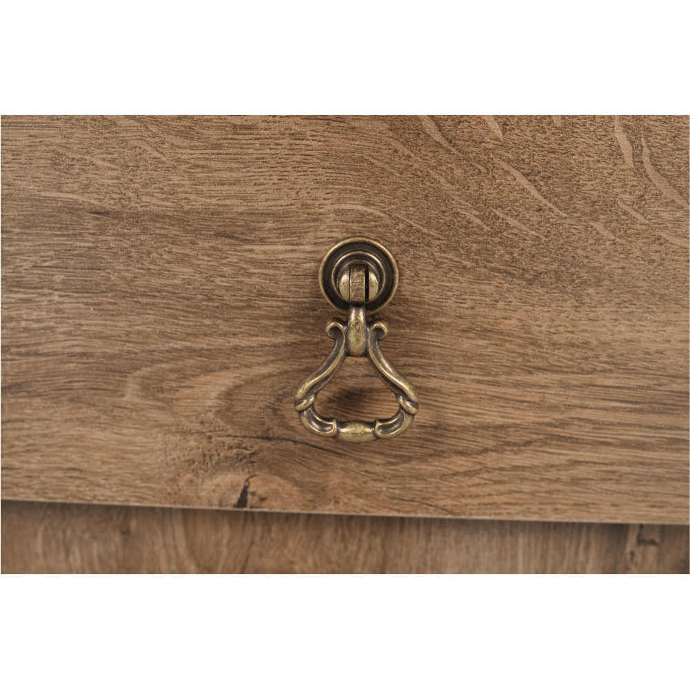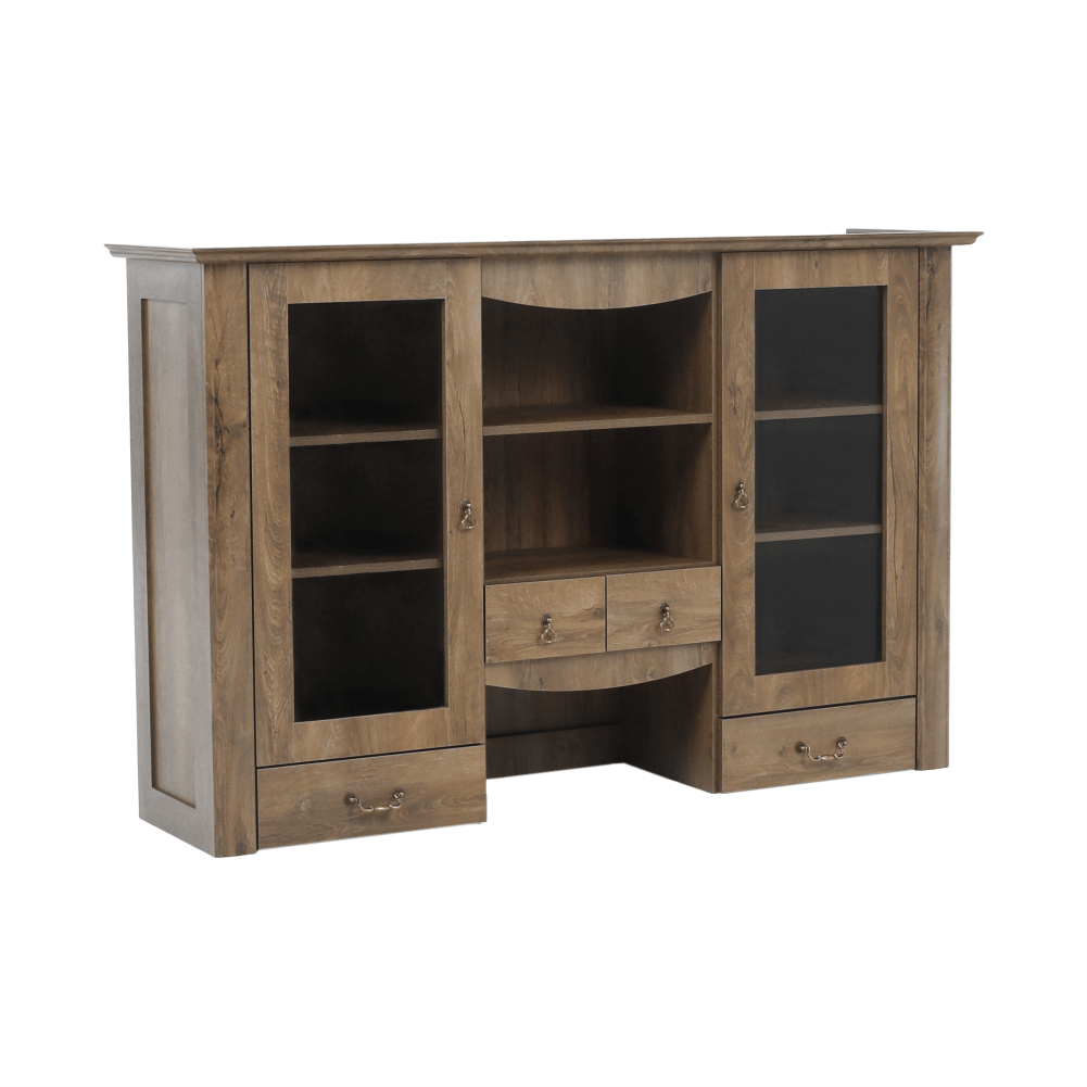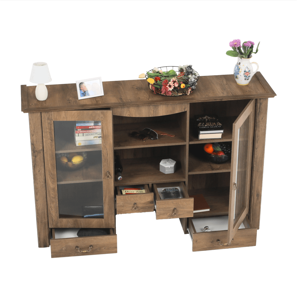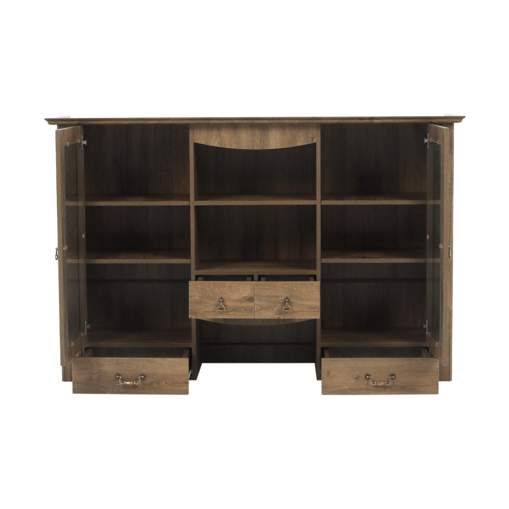 Material: DTD laminat/muchii ABS Culoare: stejar lefkas Dimensiuni (LxGxÎ): 165x42x106 cm Grosimea materialului: 30 mm Două dulapuri Poliţe deschise Patru sertare Efect 3D Mânere din metal Muchii ABS Stil baroc