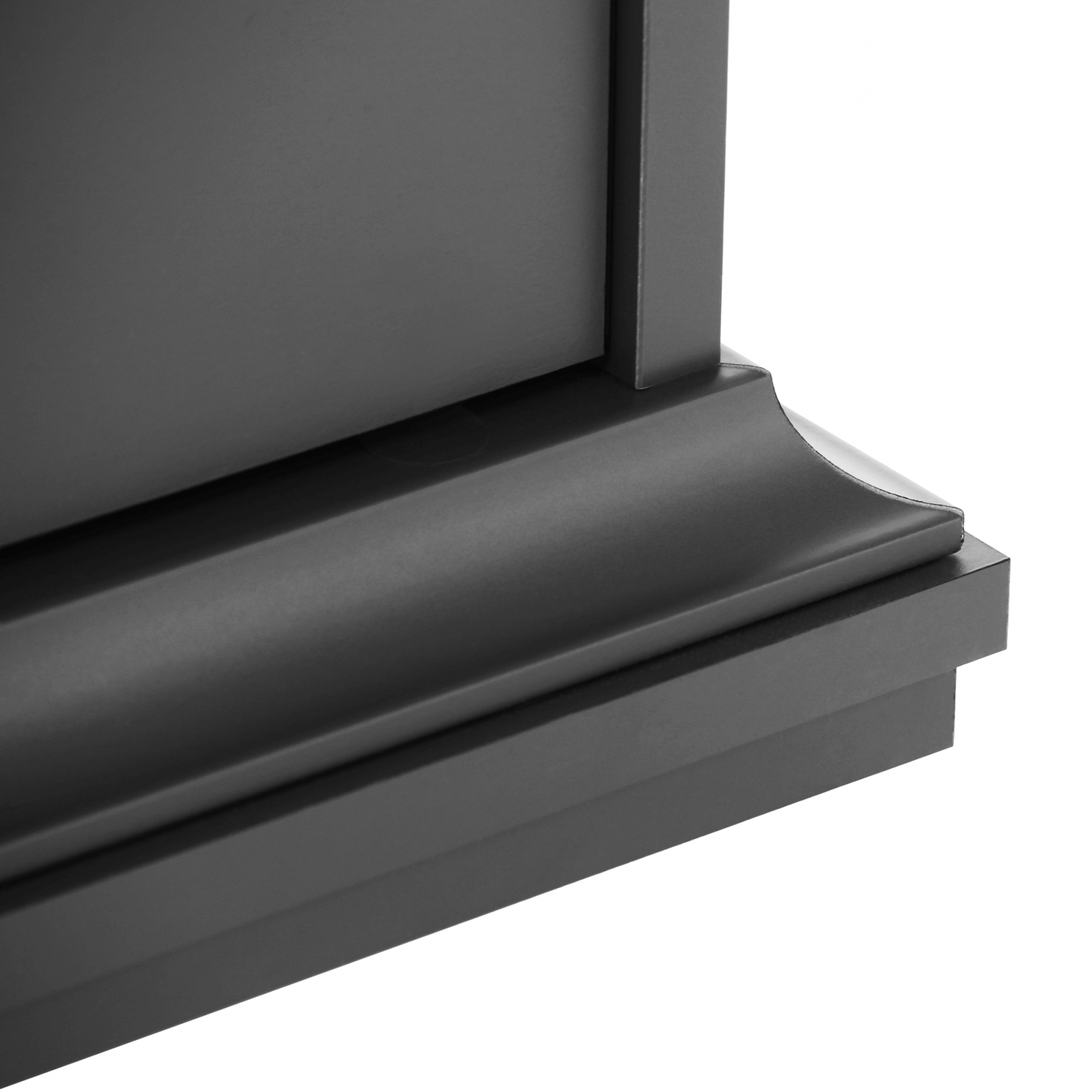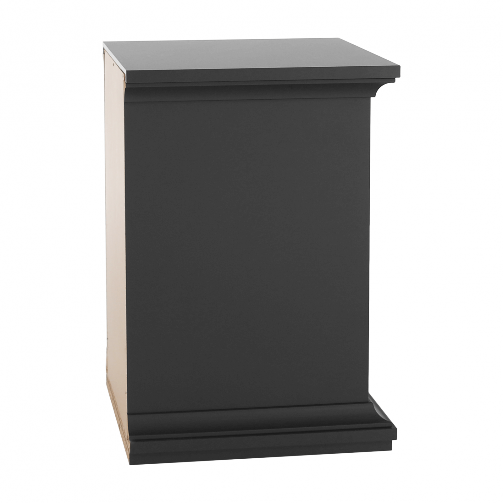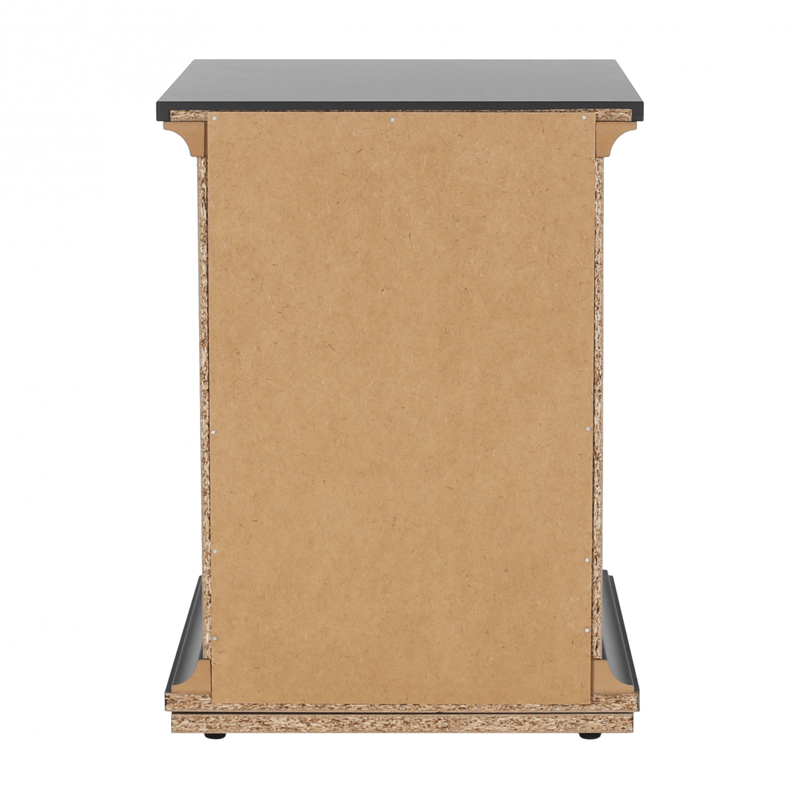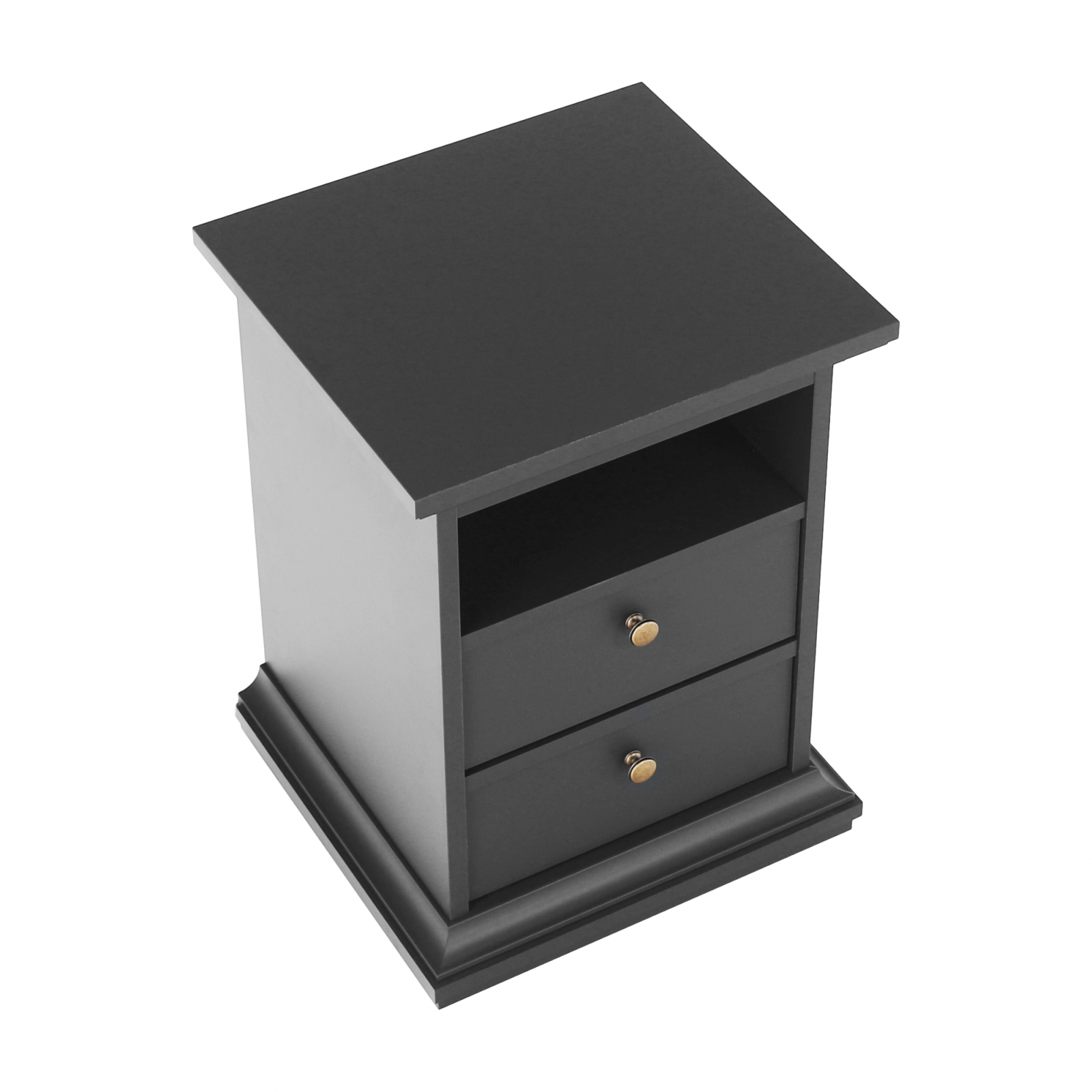 "Material: DTD laminat/MDF lăcuit Culoare: gri Dimensiuni (LxlxÎ): 43,6x40x58,8 cm Grosimea materialului: 18 mm Spaţiu deschis de depozitare Două sertare Mânere din metal Stil provensal Şipci decorative Furnizat nemontat"