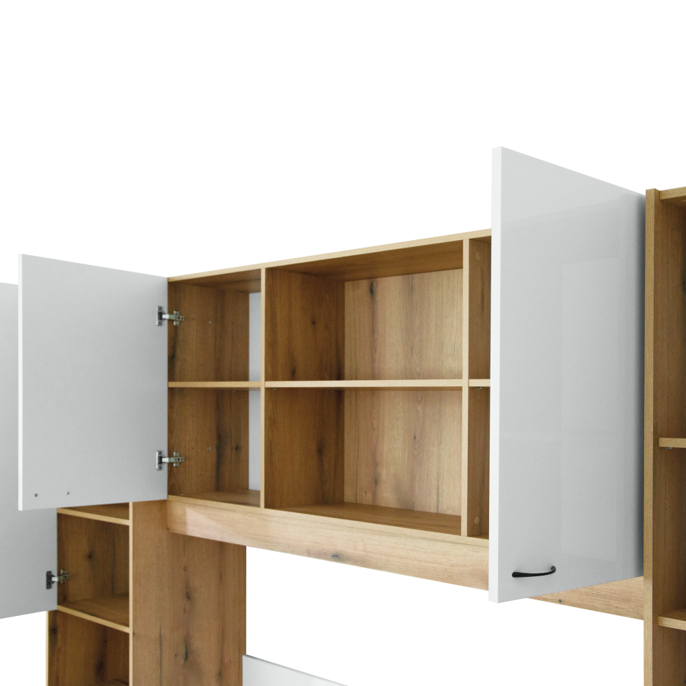 Material: DTD laminat Culoare: stejar/alb luciu înalt HG Dimensiuni (lxAxh): 273x204,5x200,5 cm Grosimea materialului corpului: 1,6 cm Grosimea materialului uşilor: 1,8 cm Pat Dimensiuni pat (lxAxh): 164x204,5x75 cm Suprafaţă de dormit (lxA): 160x200 cm Livrat cu somieră 3 plăci de somieră Înălţimea până la somieră: 22 cm Distanţă între plăcile somierei: 12,5 cm Livrat fără saltea Opţiunea de a cumpăra o saltea suplimentară din oferta noastră Înălţimea minimă recomandată a saltelei: 20 cm Portanţă pe persoană: 100 kg Extensie Dimensiuni extensie (lxAxh): 273x44,5x200,5 cm Spaţiu de depozitare Cu uşi Cu poliţe Portanţă poliţă: max. 10 kg Spaţiu de depozitare deschis Spaţiu de depozitare deschis, potrivit şi ca noptieră Cu mânere Material mâner: metal Culoare mâner: negru Recomandăm fixarea pe perete Practic Design modern Livrat dezasamblat