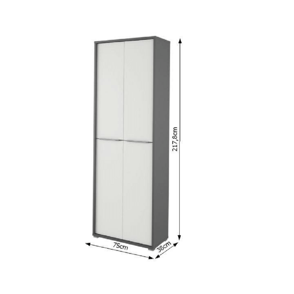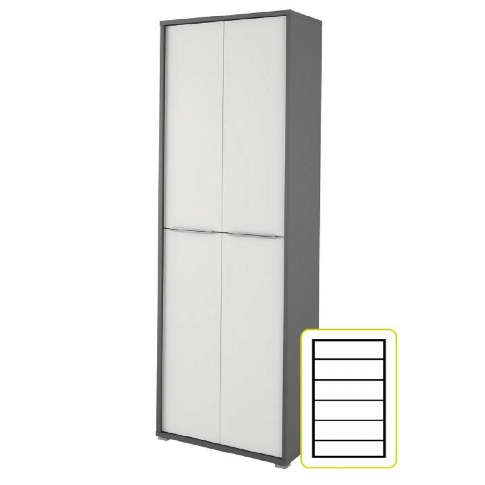 Dulap înalt cu rafturi RIOMA NEW TYP 05 Este potrivit pentru mobilarea biroului, sălilor de şcoală sau sălilor de şedinţe, Material: PAL melaminat, grosimea laminatului 22 mm. Culoare: grafit/alb, Dimensiuni (LxAxH): 75x217,8x38 cm. Grosimea materialului: 16/22 mm Puteţi asorta piese individuale în funcţie de dorinţele dvs. Se livrează demontat.