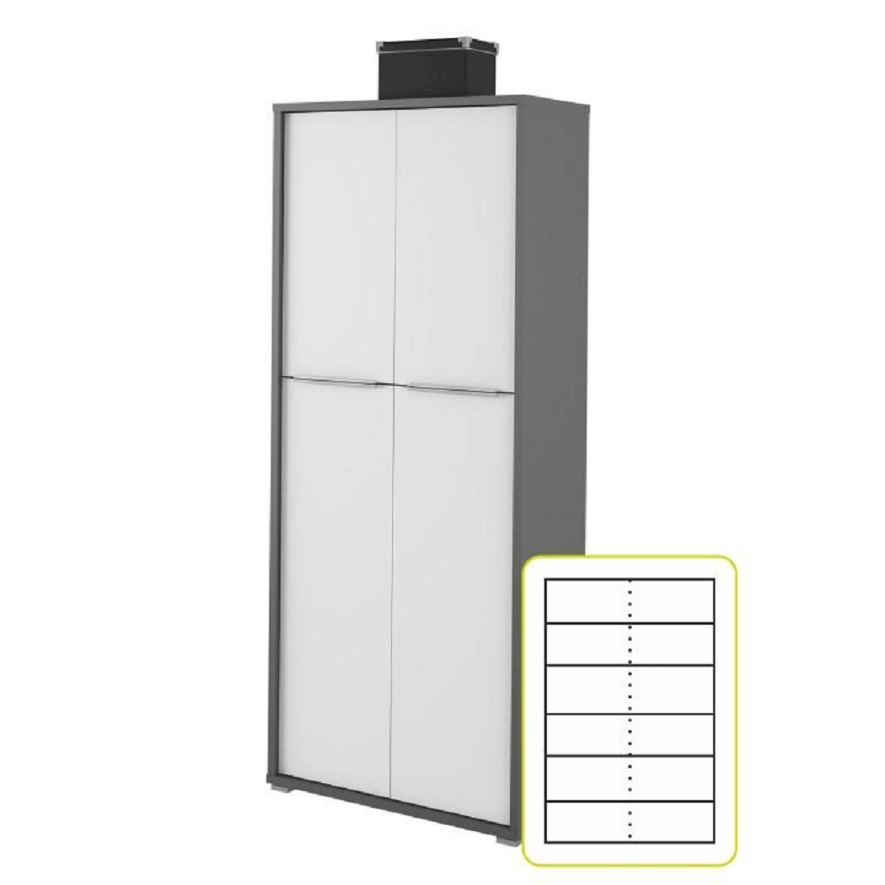 Dulap cu rafturi RIOMA NEW TYP 07 Este potrivit pentru amenajarea biroului, şedinţe şcolare sau săli de întâlnire, Material: PAL melaminat, grosimea laminatului 22 mm. Culoare: grafit/alb, Dimensiuni (LxAxH): 75x182,6x38 cm. Grosimea materialului: 16/22 mm Puteţi asorta piese individuale în funcţie de dorinţele dvs. Se livrează demontat.