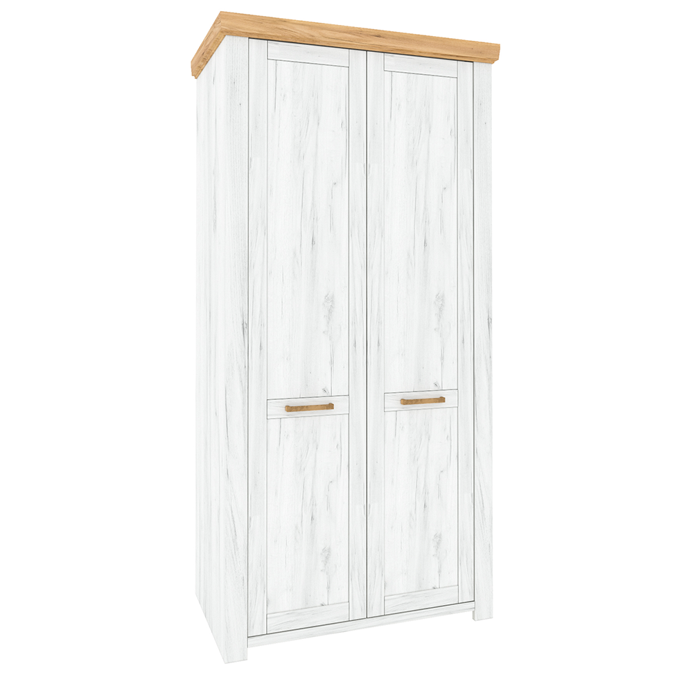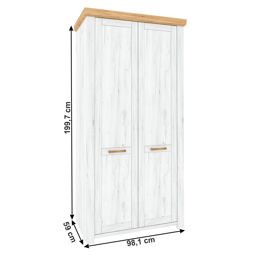 "Material: DTD laminat/MDF Culoare: stejar craft auriu/stejar craft alb Dimensiuni (LxlxÎ): 98,1x59x199,7 cm Grosimea materialului corp: 16 mm Grosimea materialului blatul superior: 22 mm Grosimea materialului uşă: 19 mm Înălţimea spaţiului inferior de la podea 4,2 cm Două uşi Bară pentru umeraşe Poliţe Furnizat nemontat"