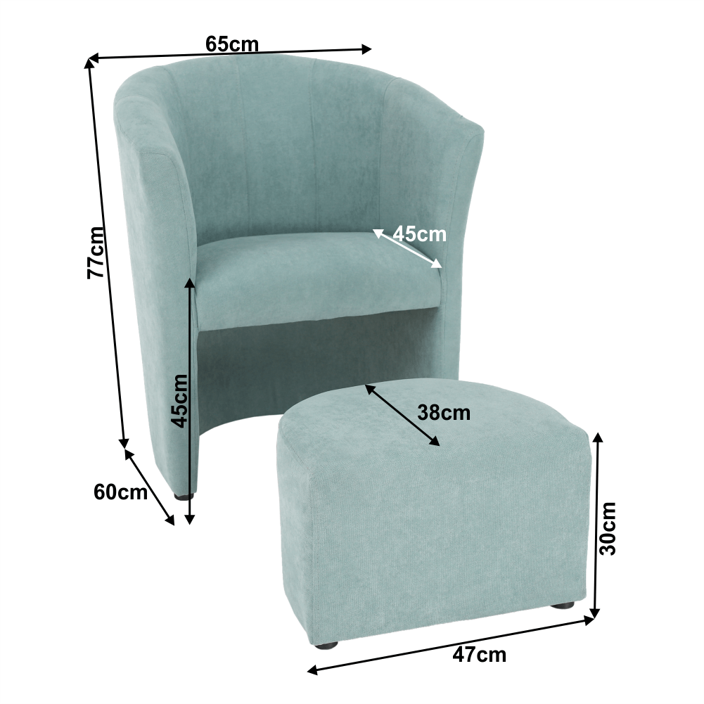 Fotoliu cu taburet ROSE Material: material textil Soro Rezistenţa materialului: 90 000 Martindale Culoare: 34 mentol Dimensiuni fotoliu (lxLxh): 65x60x77 cm Înălţimea şezutului: 45 cm Adâncimea şezutului: 45 cm Dimensiuni taburet (lxLxh): 47x38x30 cm Greutate: 17 kg Susţine: 120 kg Taburet integrat Tapiţat Livrat dezasamblat. Posibilitatea de a cumpăra în materialul textil Soro sau Savana la preţul de 699,-. în microfibră la preţul de 669,-., în piele ecologică sau în materialul textil Kronos la preţul de 699,-. Pentru o comandă individuală, este necesar să plătiţi un avans de 10% din sumă. După achitarea avansului, comanda dvs. va fi dată în producţie. Durata de livrare este între 14-18 săptămâni.