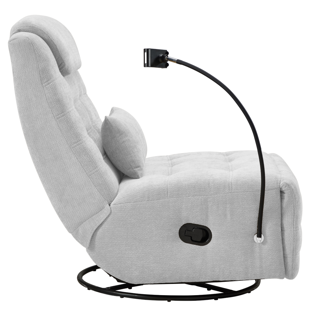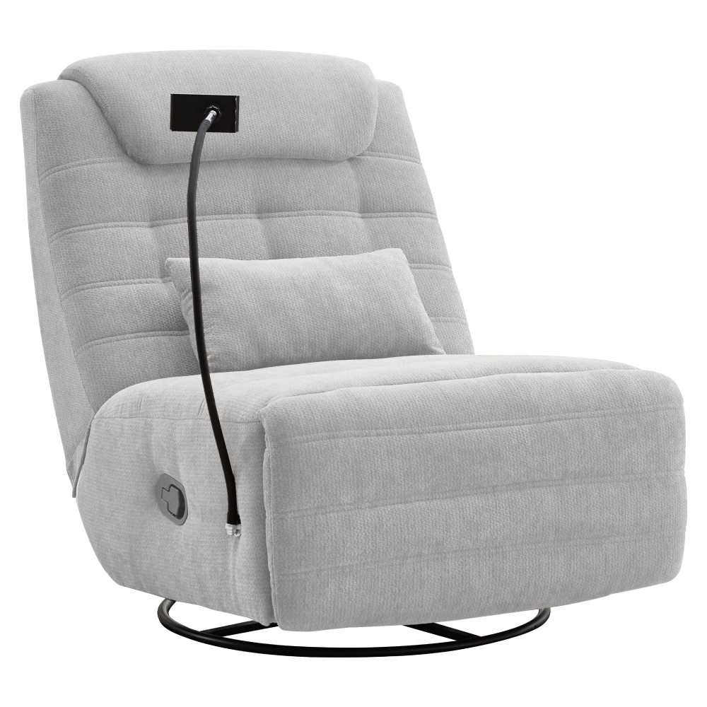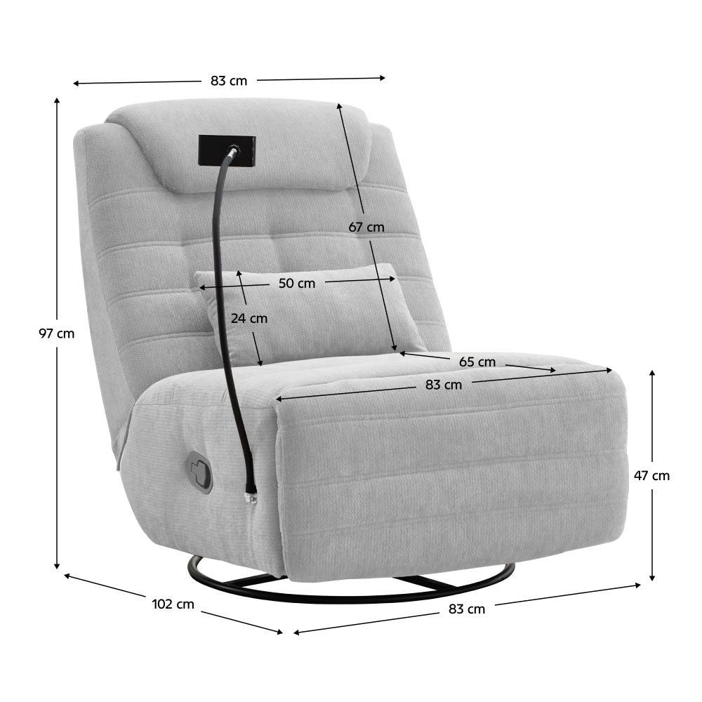 Material: ţesătură Rezistenţa ţesăturii la frecare conform testului Martindale: 75 000 de cicluri de frecare Culoare: gri deschis Dimensiuni fotoliu (lxAxh): 83x97x102 cm Înălţimea părţii de şezut: 47 cm Adâncimea părţii de şezut: 65 cm Lăţimea părţii de şezut: 83 cm Înălţime spătar: 67 cm Lăţime spătar: 83 cm Livrat cu pernă Dimensiuni pernă (lxAxh): 50x11,5x24 cm Portanţă: 120 kg Umplutură: spumă Pivotant Funcţie de balansare Poziţionabil Poziţionare mecanică Cu suport pentru telefon mobil Relaxant De design Confortabil Livrat dezasamblat