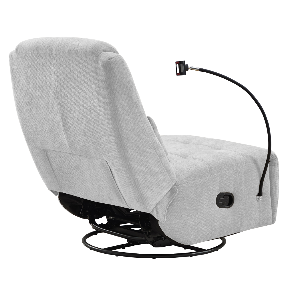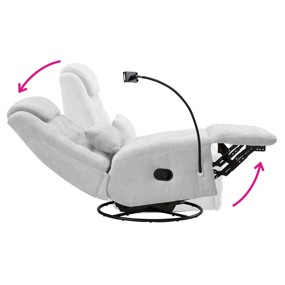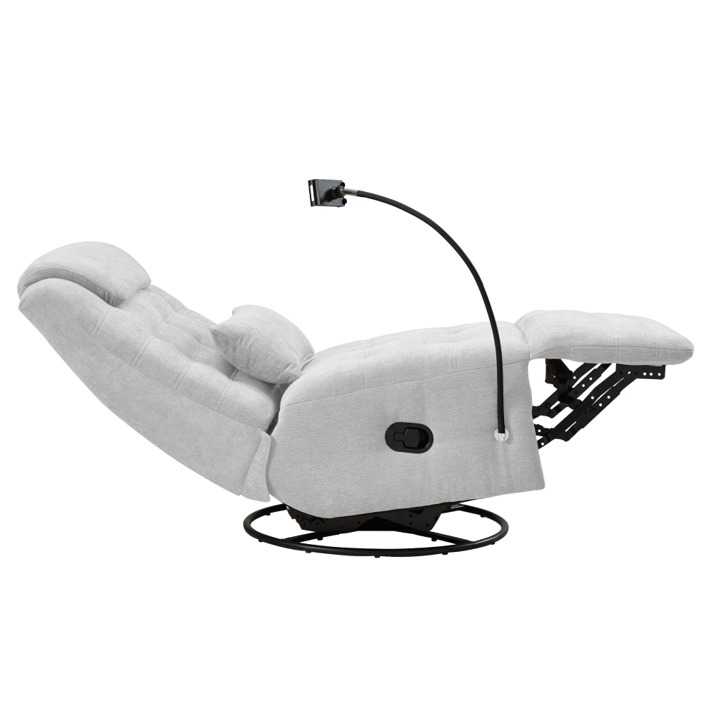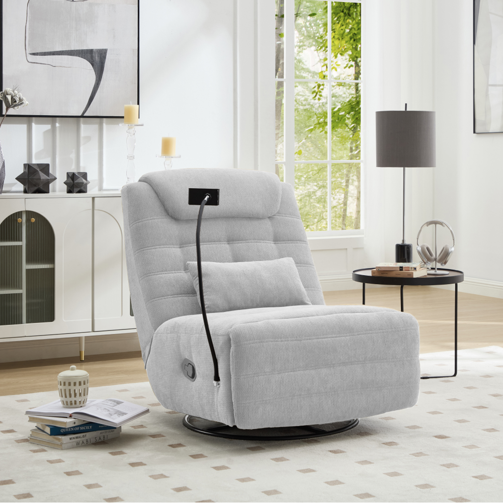 Material: ţesătură Rezistenţa ţesăturii la frecare conform testului Martindale: 75 000 de cicluri de frecare Culoare: gri deschis Dimensiuni fotoliu (lxAxh): 83x97x102 cm Înălţimea părţii de şezut: 47 cm Adâncimea părţii de şezut: 65 cm Lăţimea părţii de şezut: 83 cm Înălţime spătar: 67 cm Lăţime spătar: 83 cm Livrat cu pernă Dimensiuni pernă (lxAxh): 50x11,5x24 cm Portanţă: 120 kg Umplutură: spumă Pivotant Funcţie de balansare Poziţionabil Poziţionare mecanică Cu suport pentru telefon mobil Relaxant De design Confortabil Livrat dezasamblat