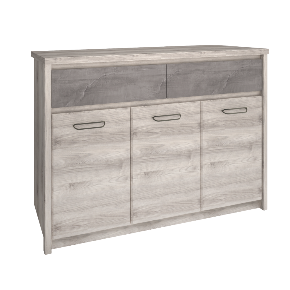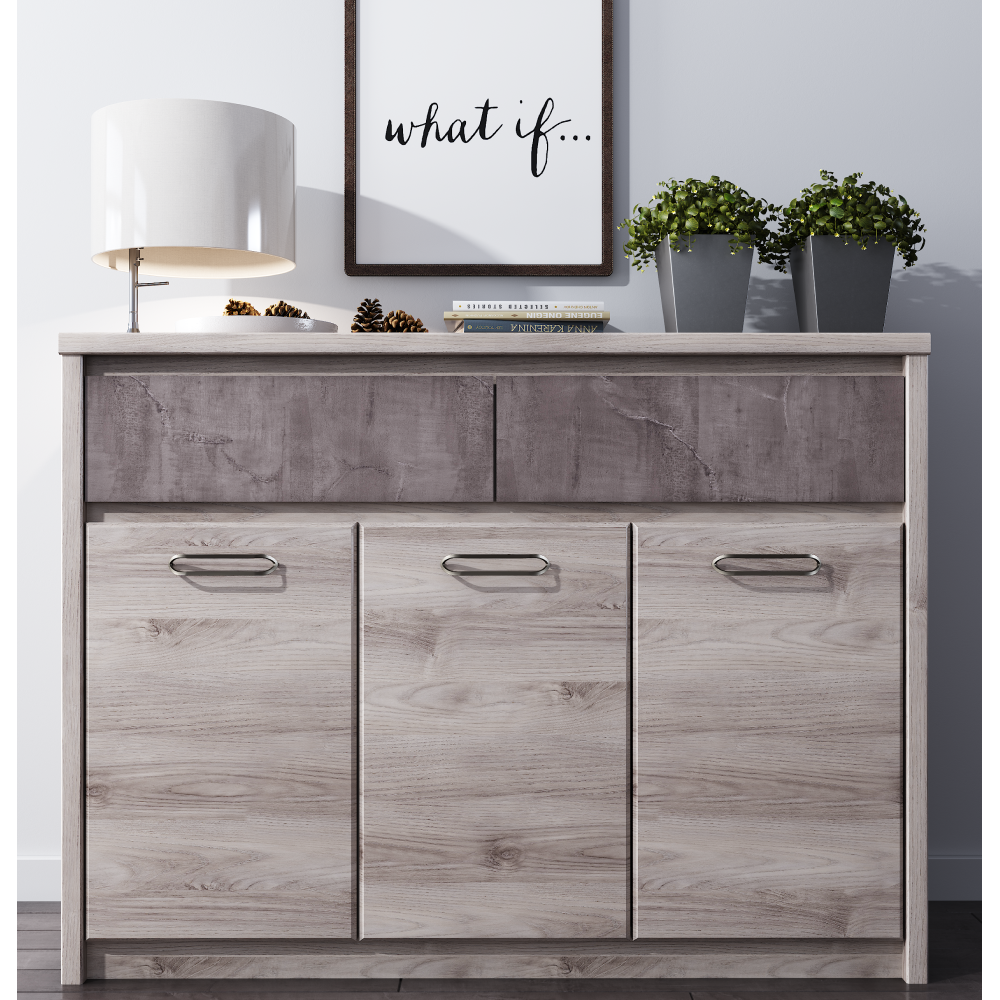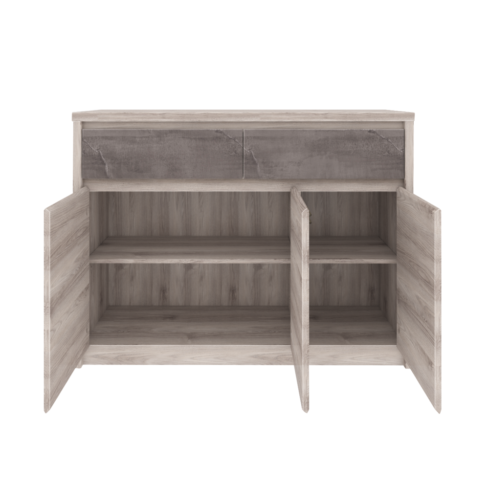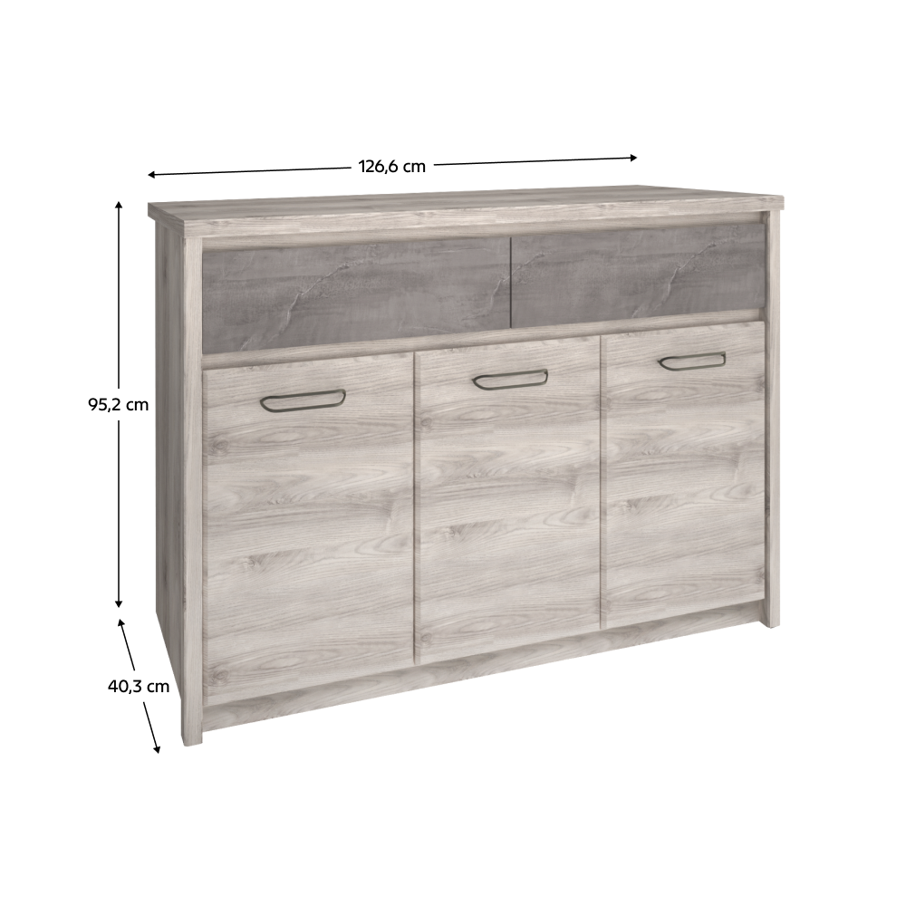 Material: PAL melaminat Culoare: castan Nairobi / onix Dimensiuni (LxAxÎ): 126,6x95,2x40,3 cm Grosimea materialului: 1,6-3,2 cm Picioare din plastic Mânere metalice Culoarea mânerelor: neagră Trei uşi Două sertare Capacitate sertare: 5 kg Design modern Livrată dezasamblată