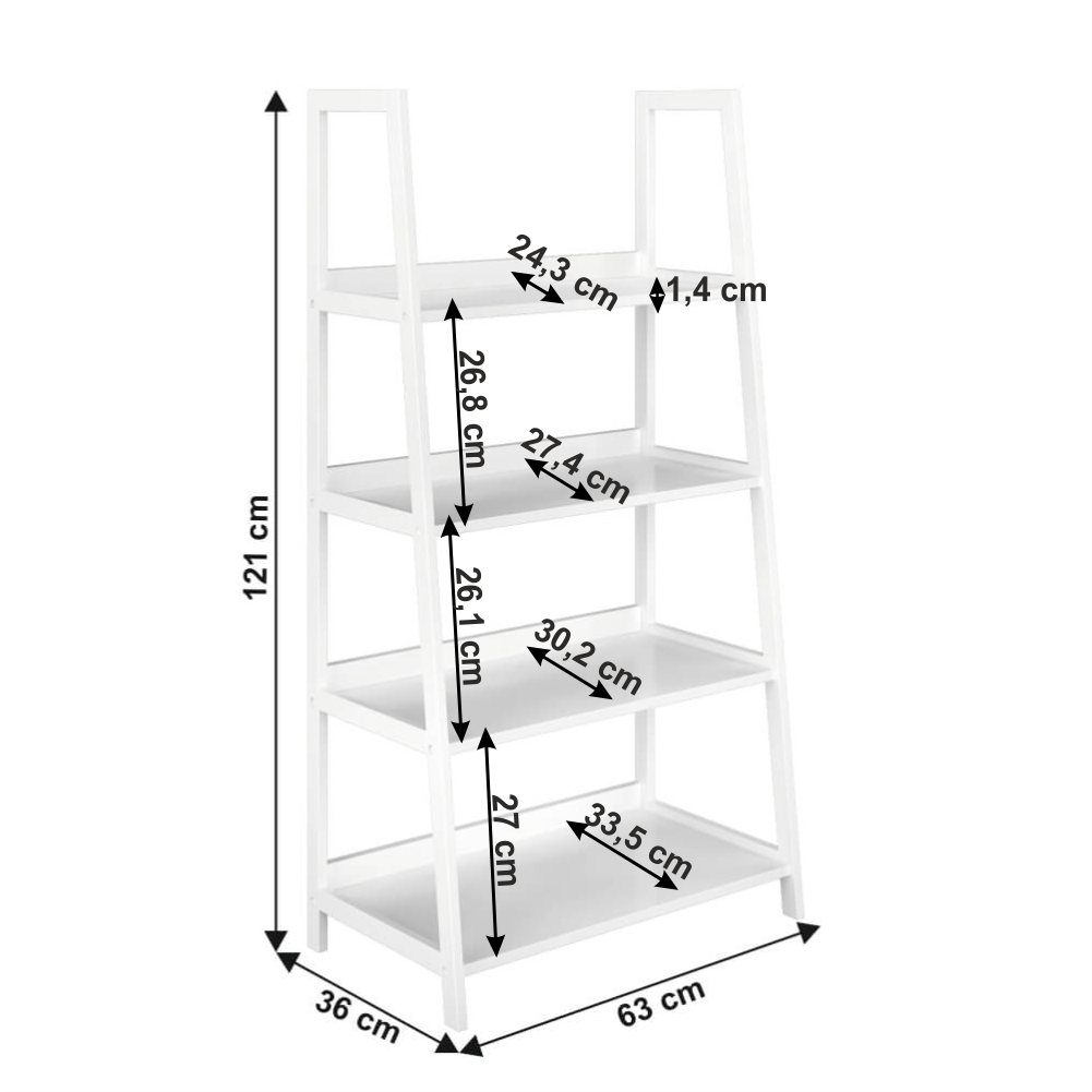 Etajeră multifuncţională ROEN TYP 2, Material: MDF/bambus lăcuit Culoare: alb Dimensiuni (lxhxA): 63x121x36 cm Grosimea materialului suportului: 1,4 cm Grosimea materialului raftului: 1,6 cm Capacitate de încărcare pe raft: 5 kg 4 rafturi Adâncimea raftului superior: 24,3 cm Adâncimea 2. raftului: 27,4 cm Adâncimea 3. raftului: 30,2 cm Adâncimea raftului inferior: 33,2 cm Spaţiu între raftul superior şi 2. raftul: 26,8 cm Spaţiu între 2. raftul şi 3. raftul: 26,1 cm Spaţiu între 3. raftul şi inferior raftul: 27 cm Design modern Practic Livrat demontat.