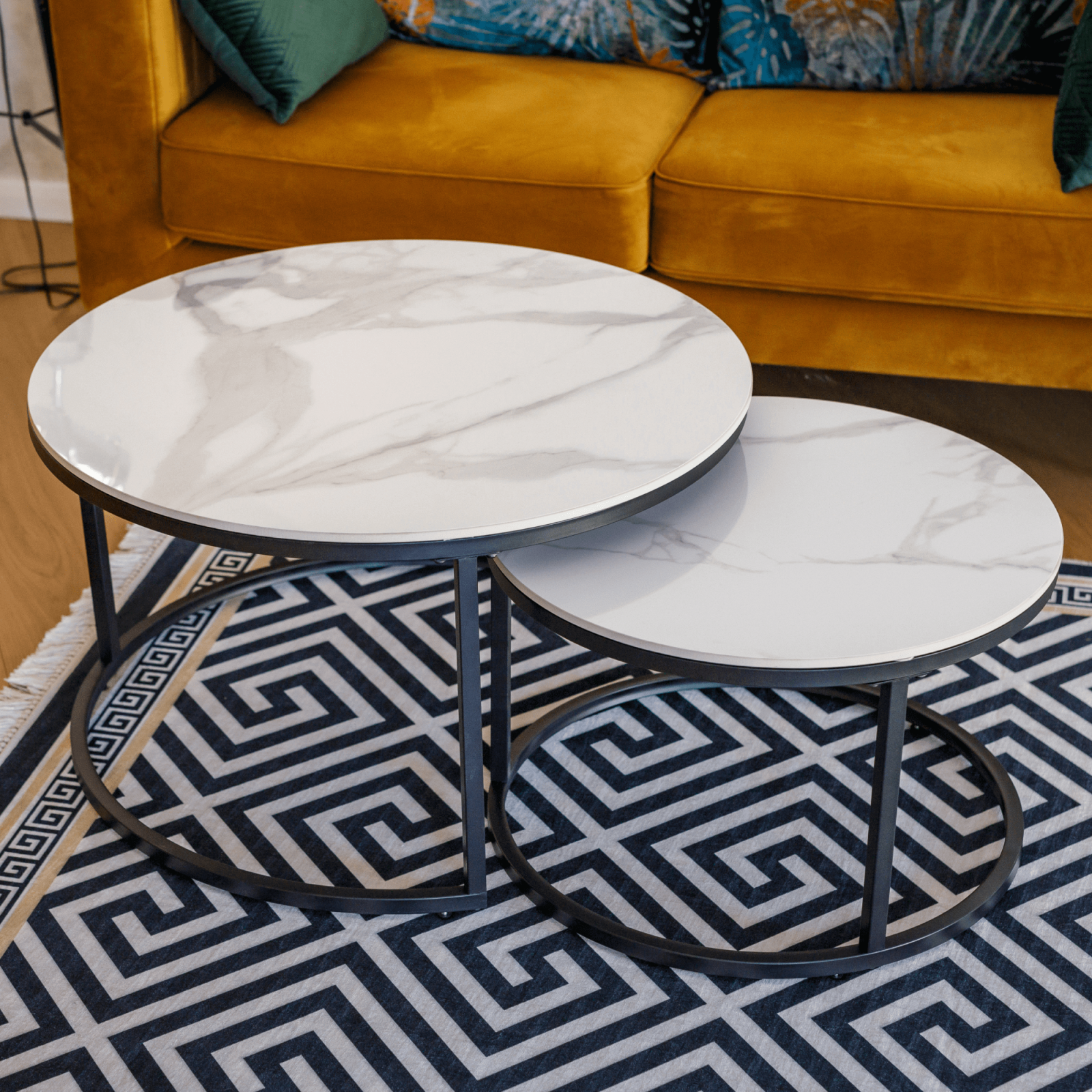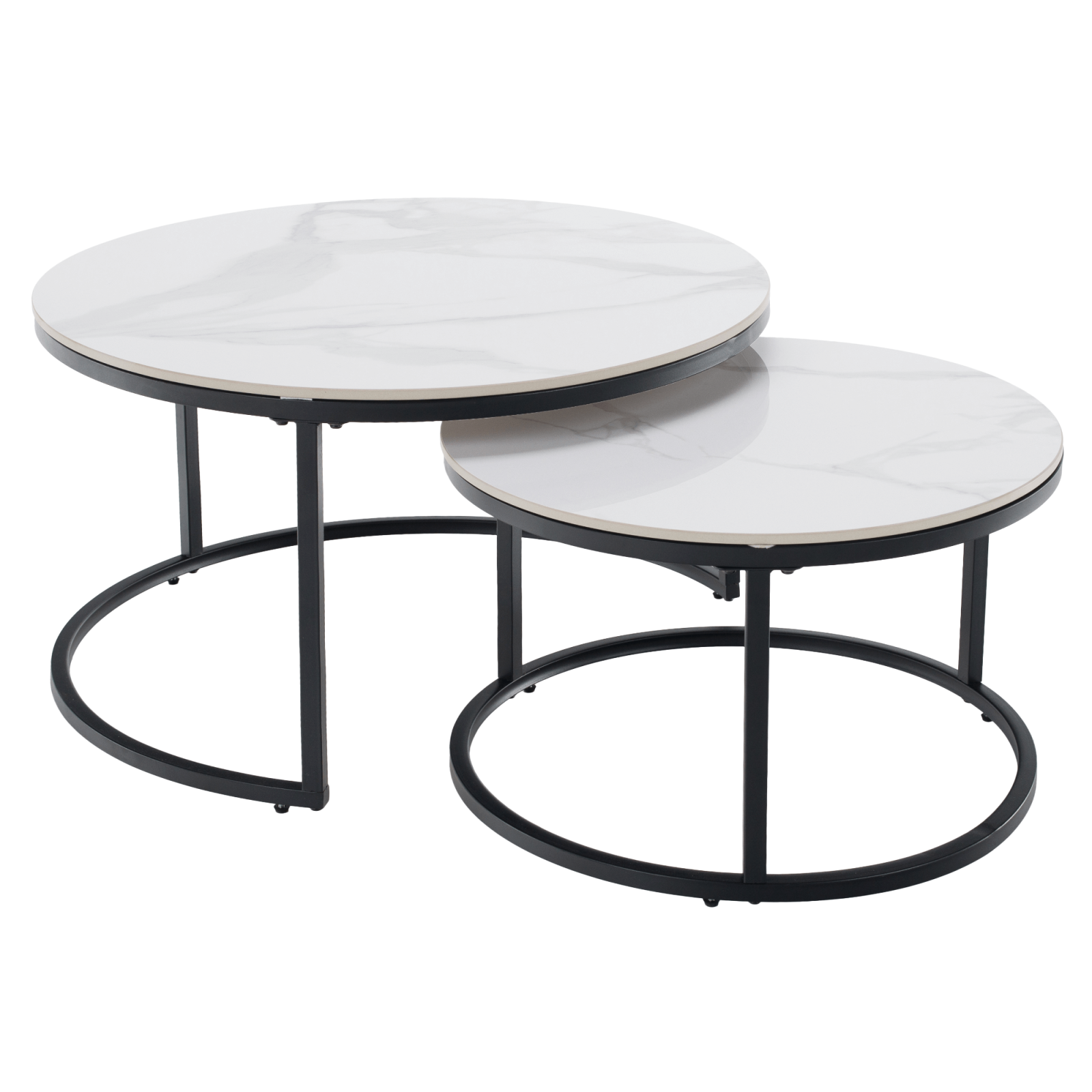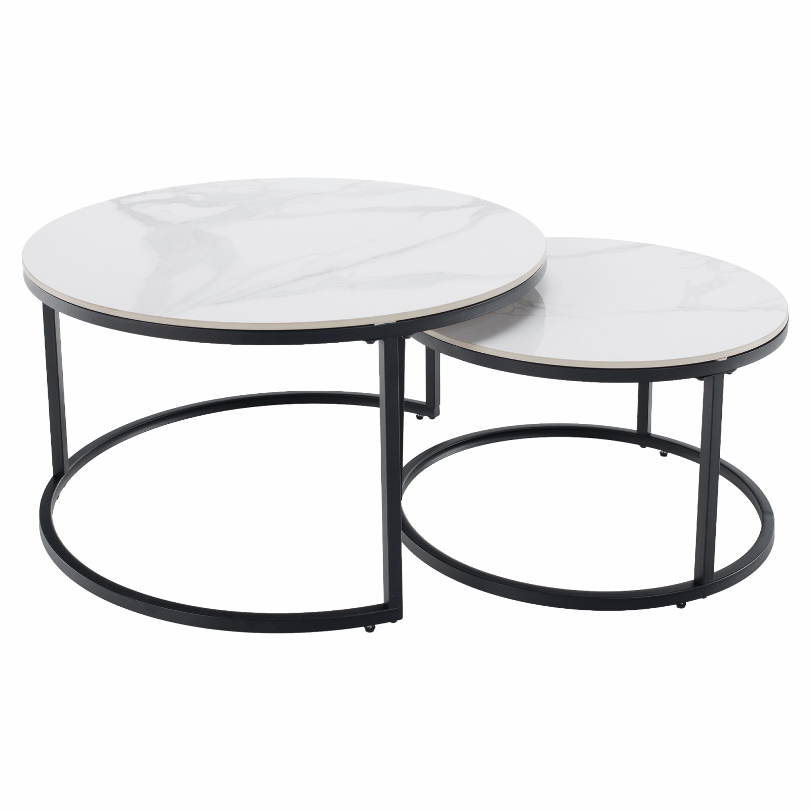 Material blat de masă: blat de piatră Culoare: marmură albă Construcţie picior: metal Culoare: negru Dimensiunile mesei mai mari (Hxl): 80x45 cm Dimensiunile mesei mai mici (Hxl): 60x37 cm Grosimea blatului de masă: 1 cm Set de 2 bucăţi Rotund Modern şi elegant Portanţă 30 kg Livrate dezasamblate