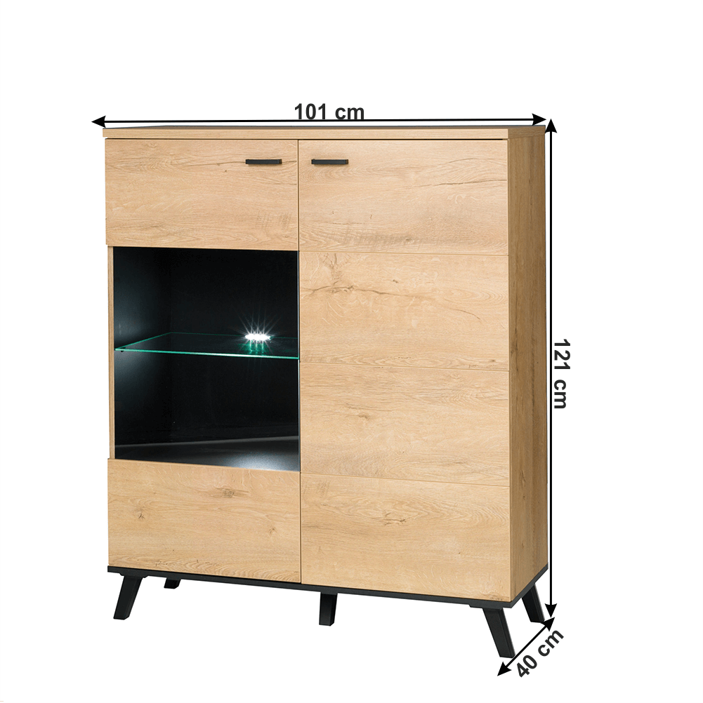 "Material: DTD laminat/plastic Culoare: stejar lefkas/negru Dimensiuni (LxlxÎ): 101x40x121 cm Înălţimea spaţiului inferior de la podea: 12 cm Scrin cu două uşi Posibilitatea de a comanda iluminare LED Muchii ABS Picioare din plastic Furnizat fără iluminare LED Stil modern Furnizat nemontat"