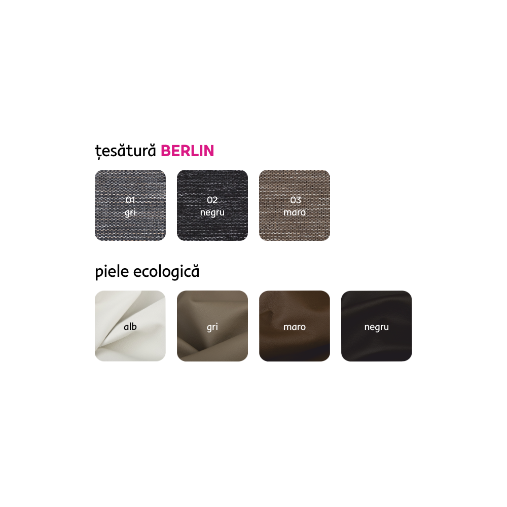 Material: ţesătură Berlin 01/piele ecologică Rezistenţa la frecare a ţesăturii Berlin conform testului Martindale: 55 000 de cicluri de frecare Rezistenţa pielii ecologice la frecare conform testului Martindale: 100 000 de cicluri de frecare Culoare: melir gri Dimensiuni (lxAxh): 298x143x73/83 cm Înălţimea părţii de şezut: 40 cm Adâncimea părţii de şezut: 56/83 cm Suprafaţa extensibilă pentru dormit (lxL): 128x241 cm Lăţimea părţii de şezut: 130 cm Dimensiuni cotieră (lxAxh): 23x77x49 cm Dimensiuni otoman (lxA): 73x102 cm Pe picioare Material picior: plastic Culoare picioare: argintie Umplutură: arc falista/spumă PUR În formă de U Universală Complet tapiţată De colţ Cu spaţiu de depozitare Livrat cu perne Dimensiuni pernă (lxh): 67x50 cm Margine decorativă Livrat dezasamblat Posibilitate de comenzi individuale ale setului de canapele în 4 culori din piele ecologică în combinaţie cu 3 versiuni de culori din ţesătură Berlin la preţul de 5.499 Lei. Pentru comenzi personalizate este necesară plata unui avans de 20% din suma respectivă. După achitarea avansului, comanda dumneavoastră va intra în producţie. Termenul de livrare de 6-8 săptămâni.