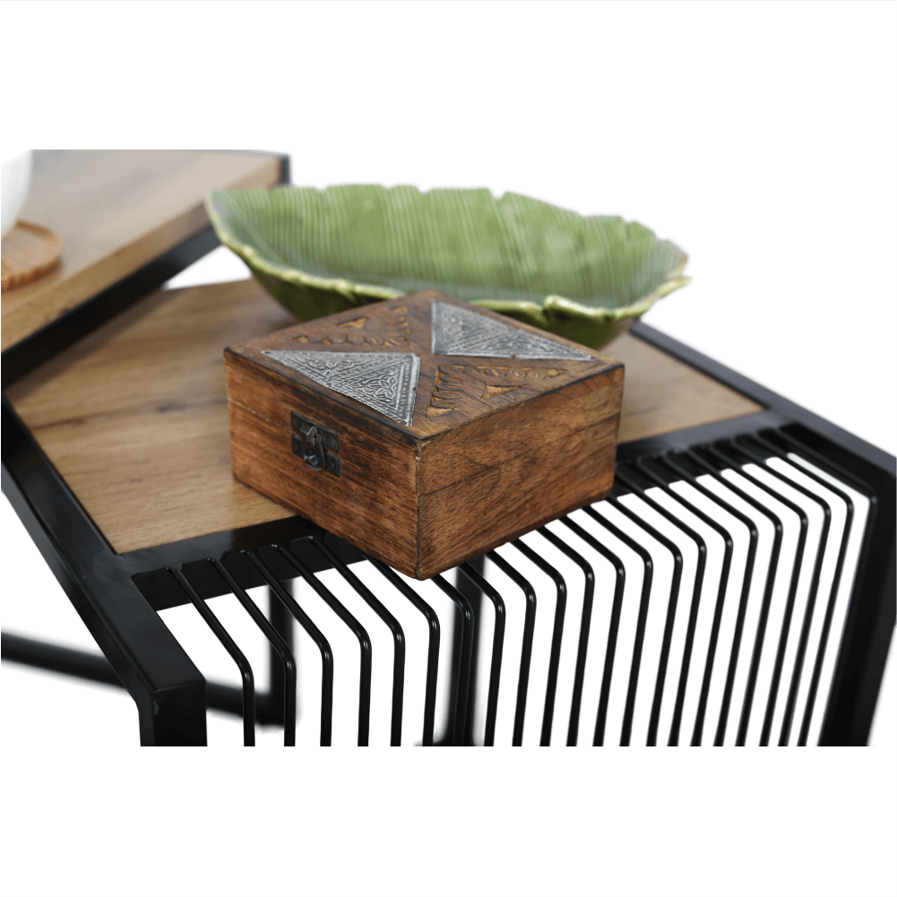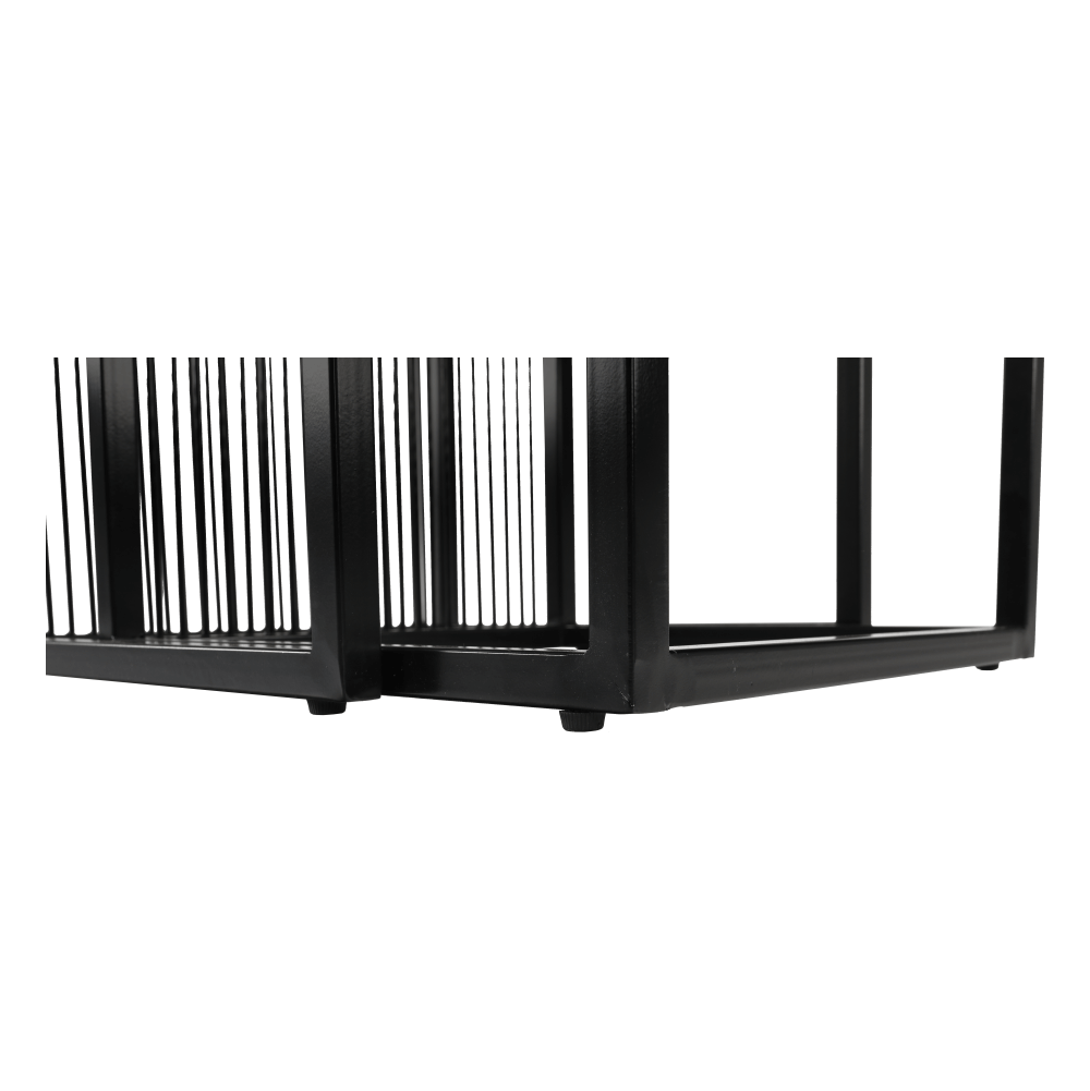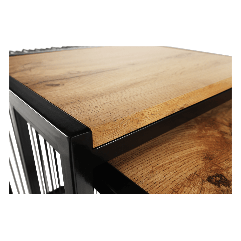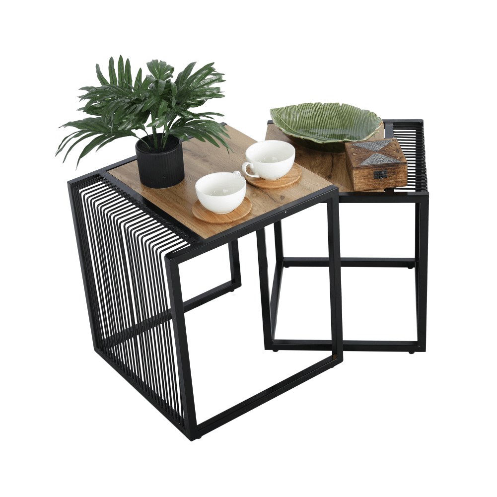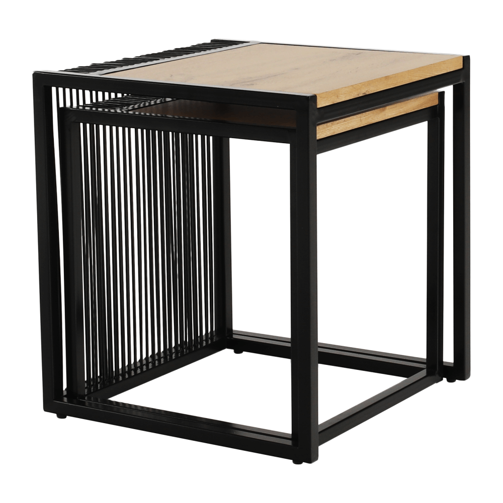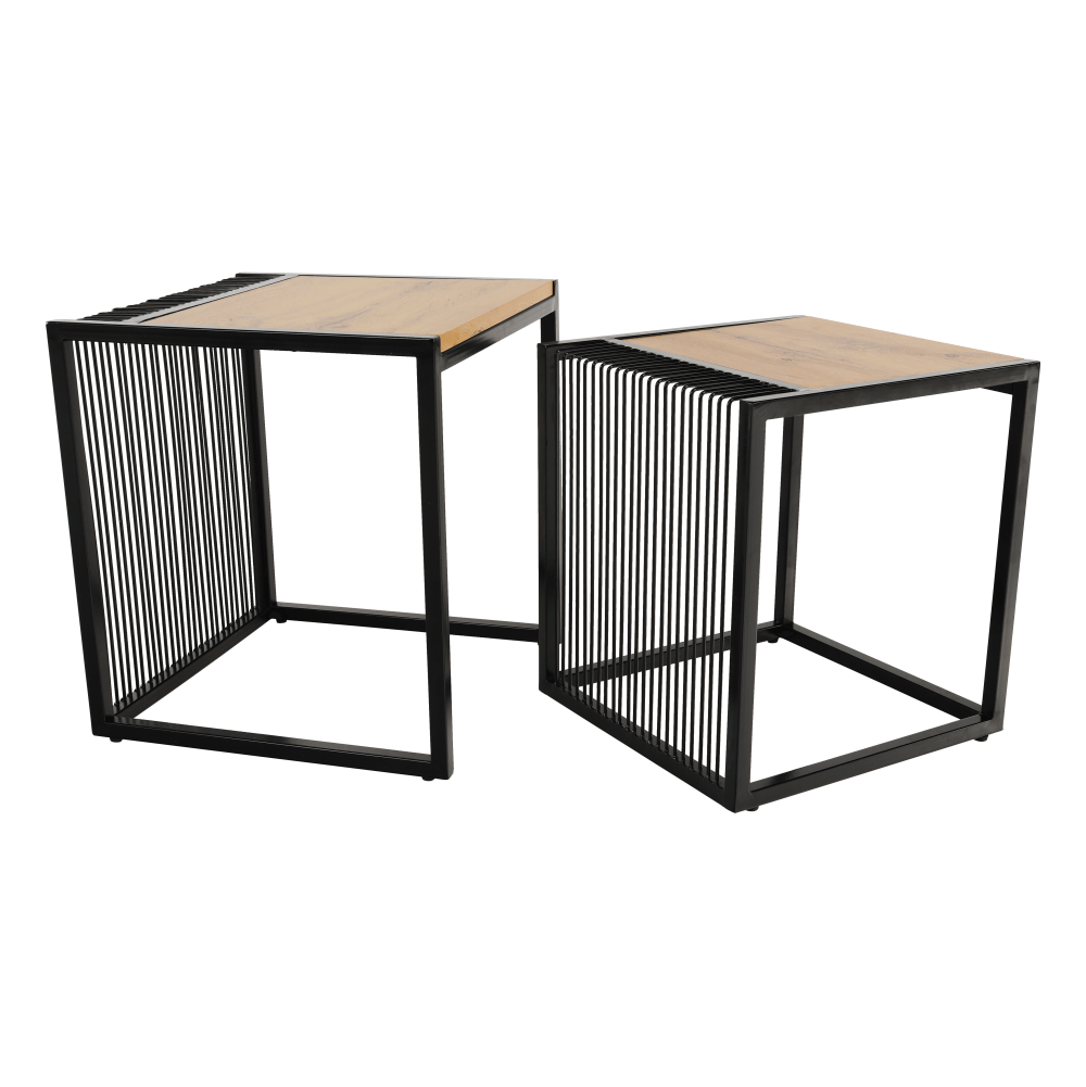 "Set de două mese de cafea RIMBO Material: MDF/metal Culoare: stejar/metal negru Dimensiuni mai mari (LxlxÎ): 45x45x50 cm Dimensiuni mai mici (LxlxÎ): 40x40x45 cm Furnizat nemontat "
