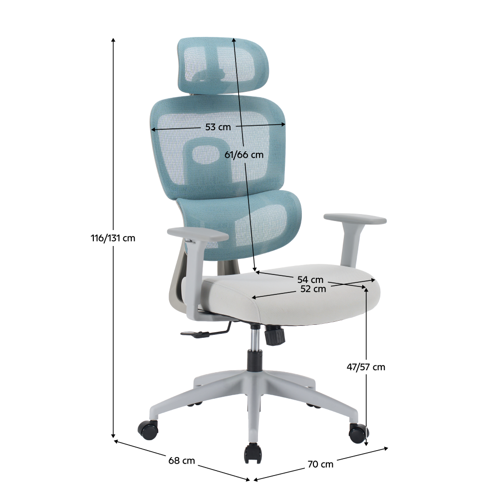 Material: plasă/ţesătură/plastic Rezistenţa plasei conform testului Martindale: 90 000 de cicluri de frecare Rezistenţa ţesăturii conform testului Martindale: 80 000 abraziuni Culoare: neomint/gri deschis/gri Dimensiuni (lxAxh): 70x68x116-121/126-131 cm Înălţimea părţii de şezut: 47-57 cm Adâncimea părţii de şezut: 54 cm Lăţime părţii de şezut: 52 cm Lăţime spătar: 53 cm Înălţime spătar: 61-66 cm Portanţă: 150 kg Scaun rotativ Funcţie de balansare Înălţime reglabilă a părţii de şezut Suport lombar dinamic Înălţime reglabilă a spătarului 3 poziţii de reglare a înălţimii spătarului Unghi reglabil al tetierei Cotiere reglabile pe înălţime şezut confortabil şi moale Roţi universale Roţile sunt potrivite atât pentru podele moi, cât şi dure Practic Caracteristici ergonomice Livrat dezasamblat