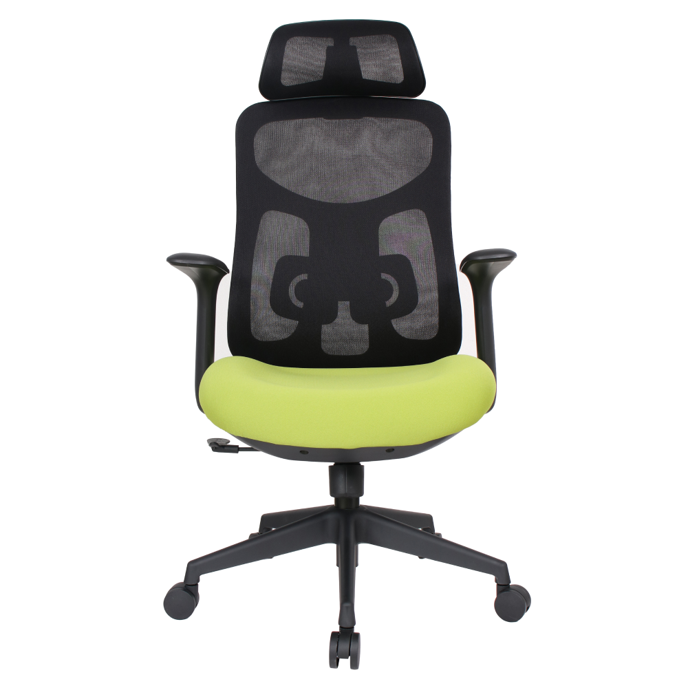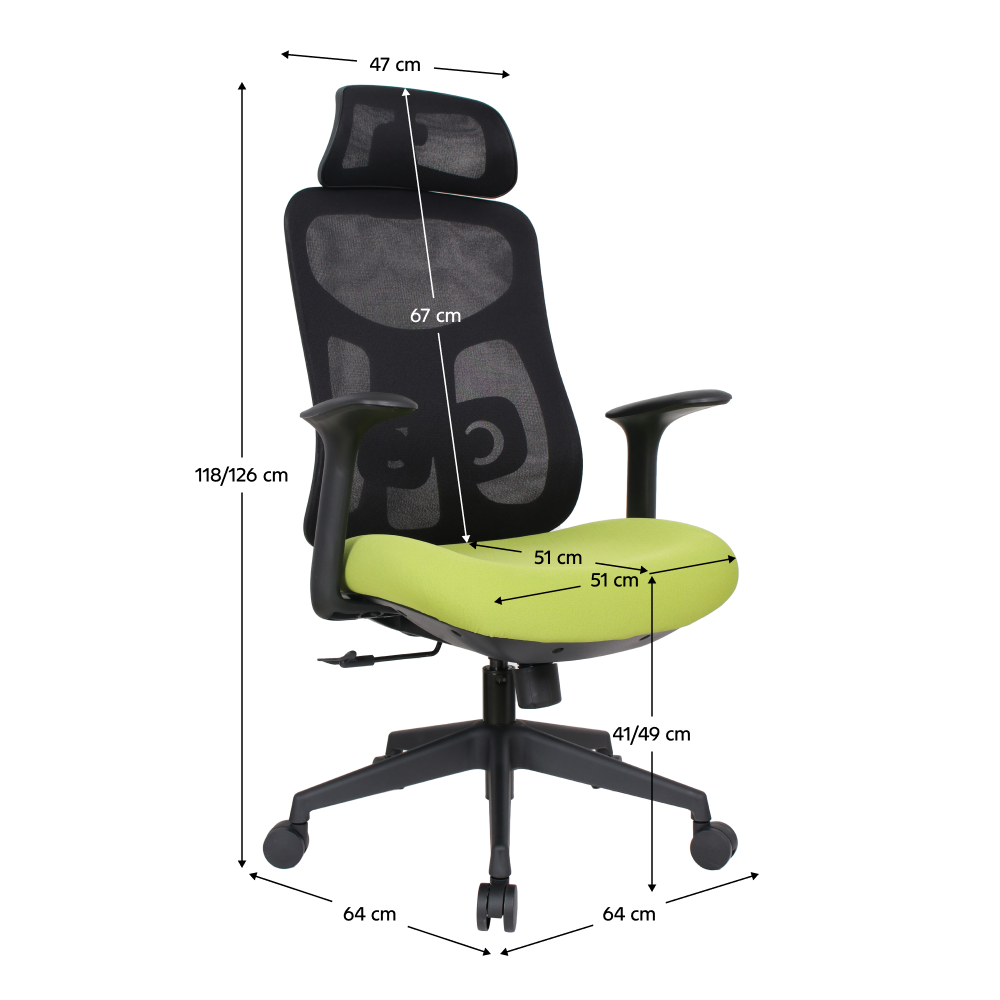 Material: plasă /plastic Rezistenţa ţesăturii la frecare conform testului Martindale: 90 000 de cicluri de frecare Culoare: verde/neagră Dimensiuni (lxAxh): 64x64x118-126 cm, Înălţimea părţii de şezut: 41-49 cm Adâncimea părţii de şezut: 51 cm Lăţimea părţii de şezut: 51 cm Lăţime spătar: 47 cm Înălţime spătar: 67 cm Portanţă: 150 kg Scaun rotativ Mecanism balansare Tetieră reglabilă Înălţime reglabilă părţii de şezut Cu cotiere Suport lombar ergonomic cu posibilitatea de reglare a înălţimii şezut modelat Livrat dezasamblat