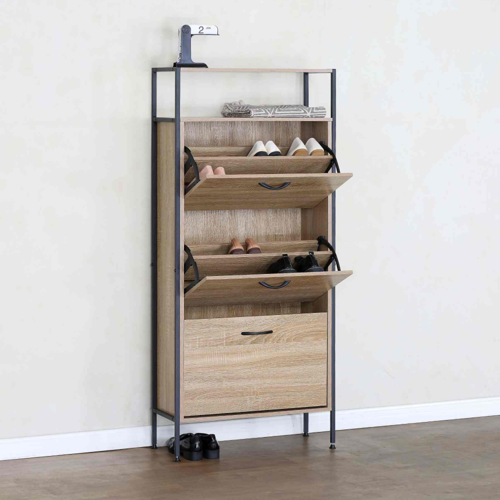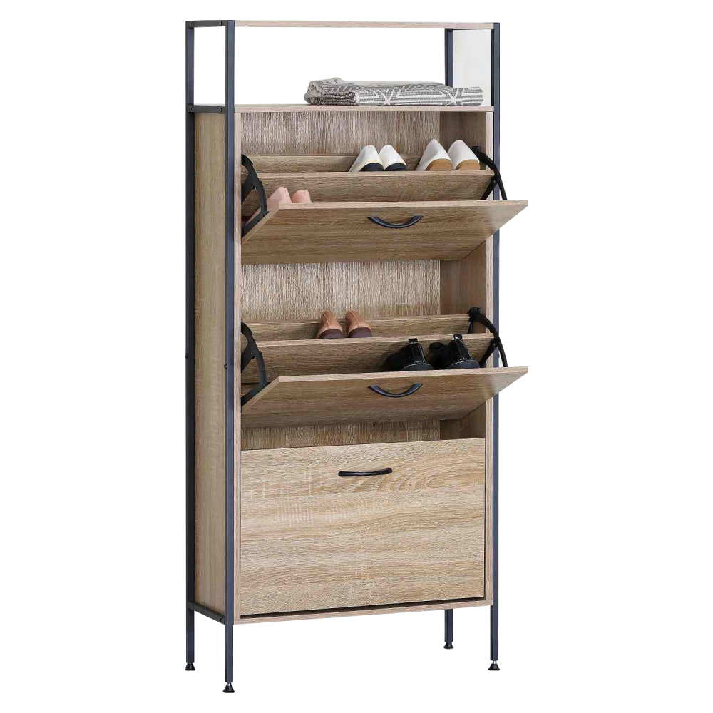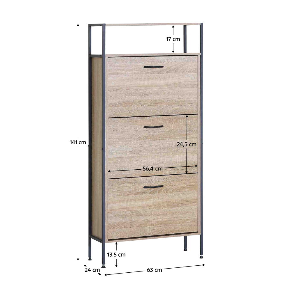 Material: PAL/oţel/plastic Culoare: stejar/negru Dimensiuni (lxAxh): 63x24x141 cm Grosime material: 1,2-1,5 cm Înălţimea compartimentului inferior de la podea: 13,5 cm Pe picioare Trei sertare basculabile Sertar împărţit în 2 părţi Înălţimea compartimentului inferior de la podea:9 cm Dimensiunile sertarului basculabil (lxL): 56,4x34,5 cm Portanţa sertarului basculabil: 6 kg Poliţă Portanţa blatului superior: 10 kg Design modern Practic Livrat dezasamblat