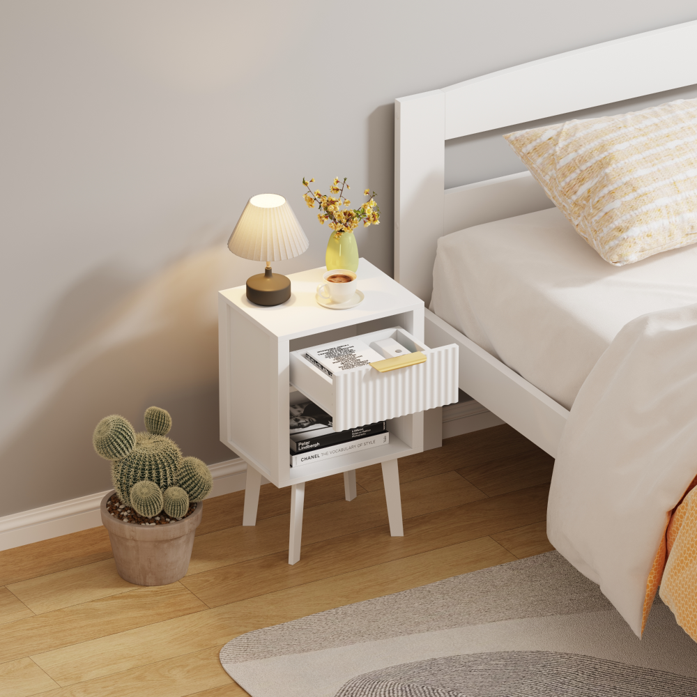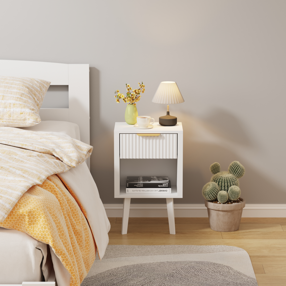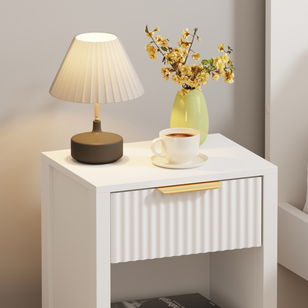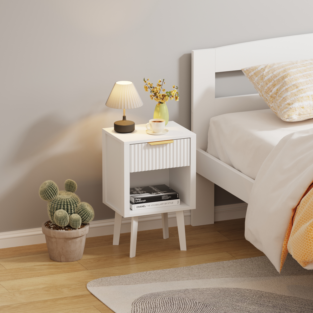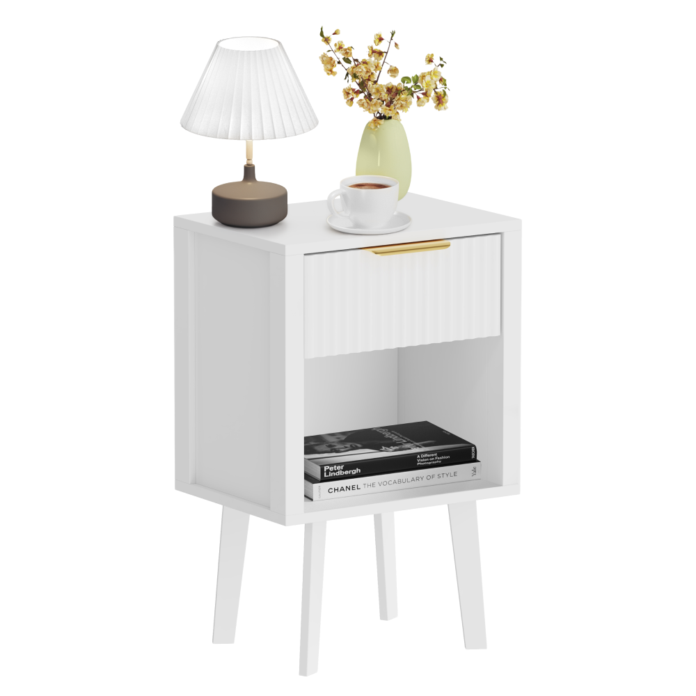 Material: DTD laminat Culoare: albă Dimensiuni (lxAxh): 39x29x60,5 cm Portanţă: 10 kg Compartiment de depozitare deschis Înălţimea compartimentului de depozitare deschis: 21,5 cm Capacitatea spaţiului de depozitare deschis: 10 kg Sertar Portanţă sertar: 5 kg Mânere din plastic Culoarea mânerului: auriu Pe picioare Înălţimea picioarelor: 22 kg Design modern Recomandăm ataşarea de perete Livrat dezasamblat