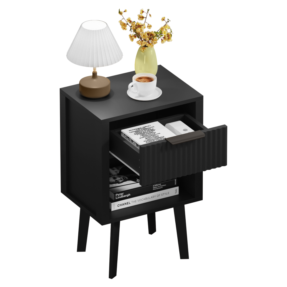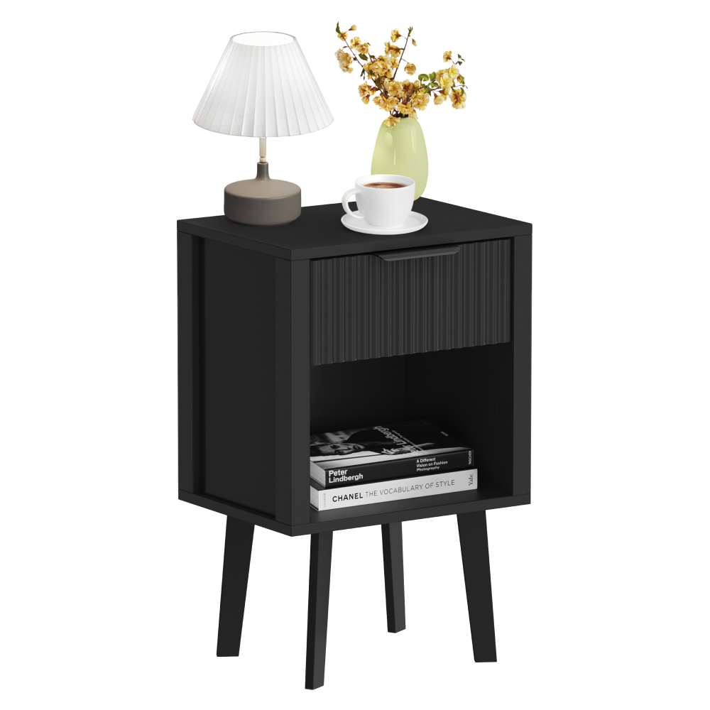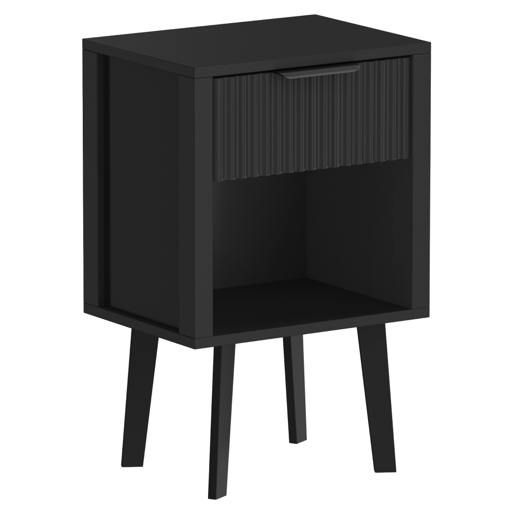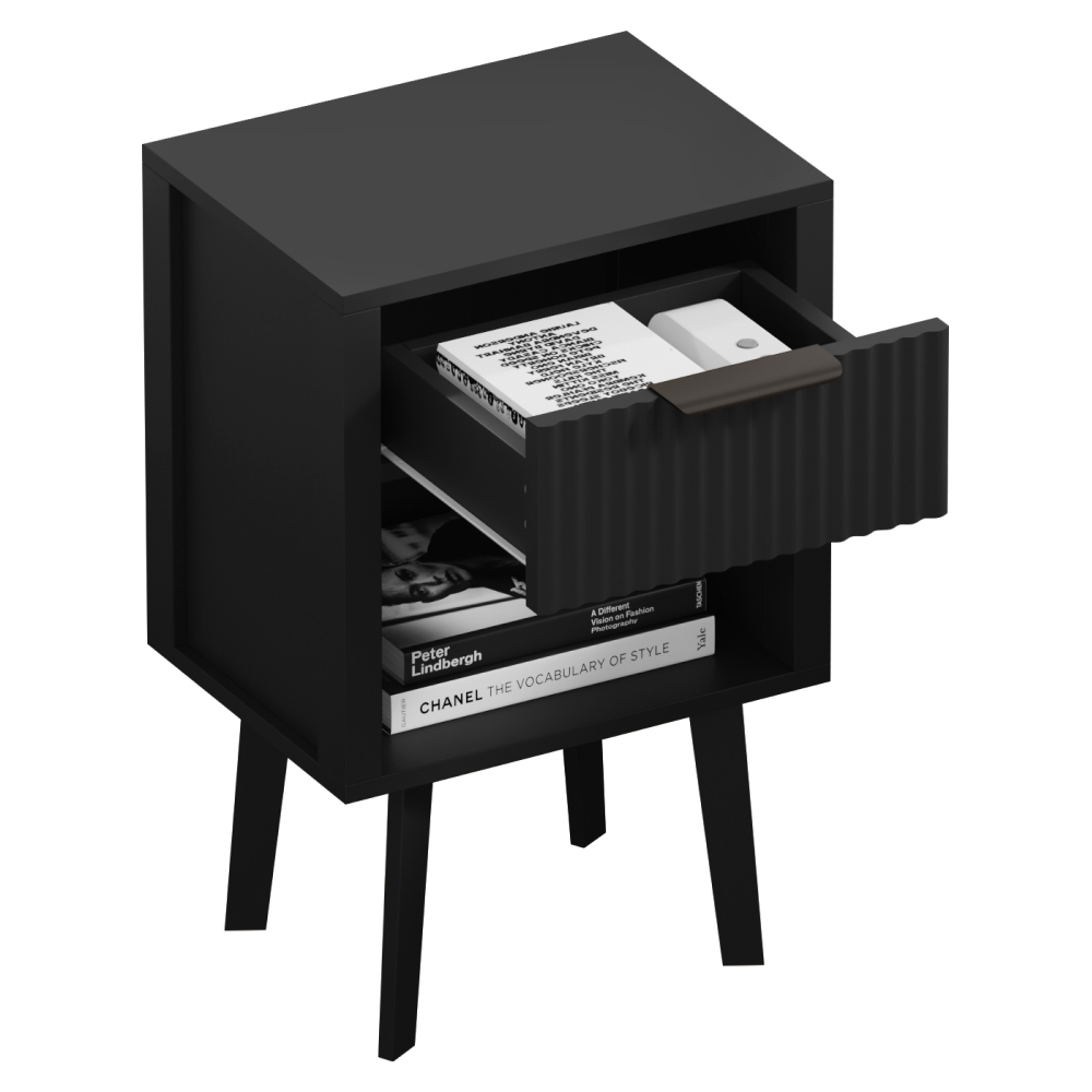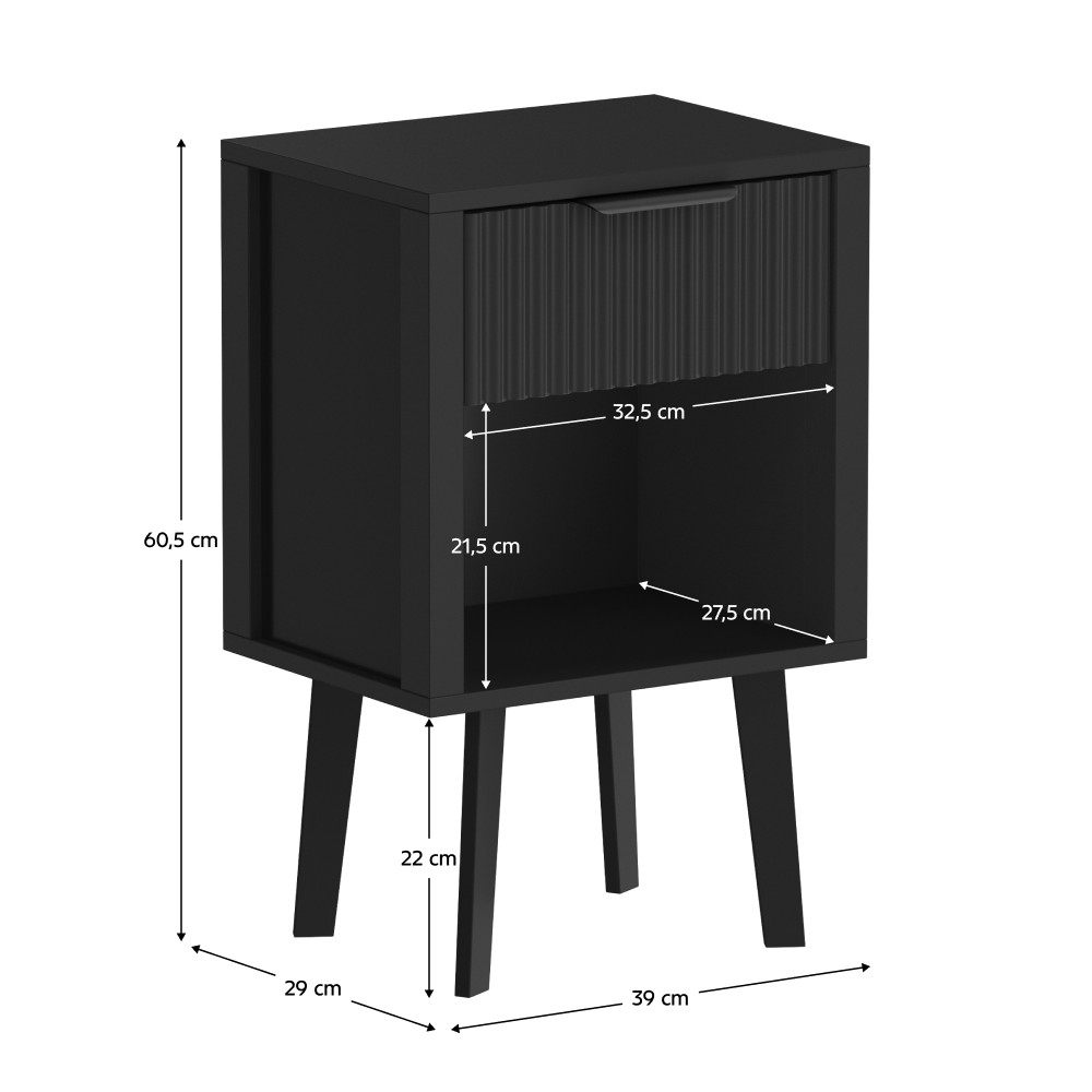 Material: DTD laminat Culoare: neagră Dimensiuni (lxAxh): 39x29x60,5 cm Portanţă: 10 kg Compartiment de depozitare deschis Înălţimea compartimentului de depozitare deschis: 21,5 cm Capacitatea spaţiului de depozitare deschis: 10 kg Sertar Portanţă sertar: 5 kg Mânere din plastic Culoarea mânerului: negru Pe picioare Înălţimea picioarelor: 22 kg Design modern Recomandăm ataşarea de perete Livrat dezasamblat