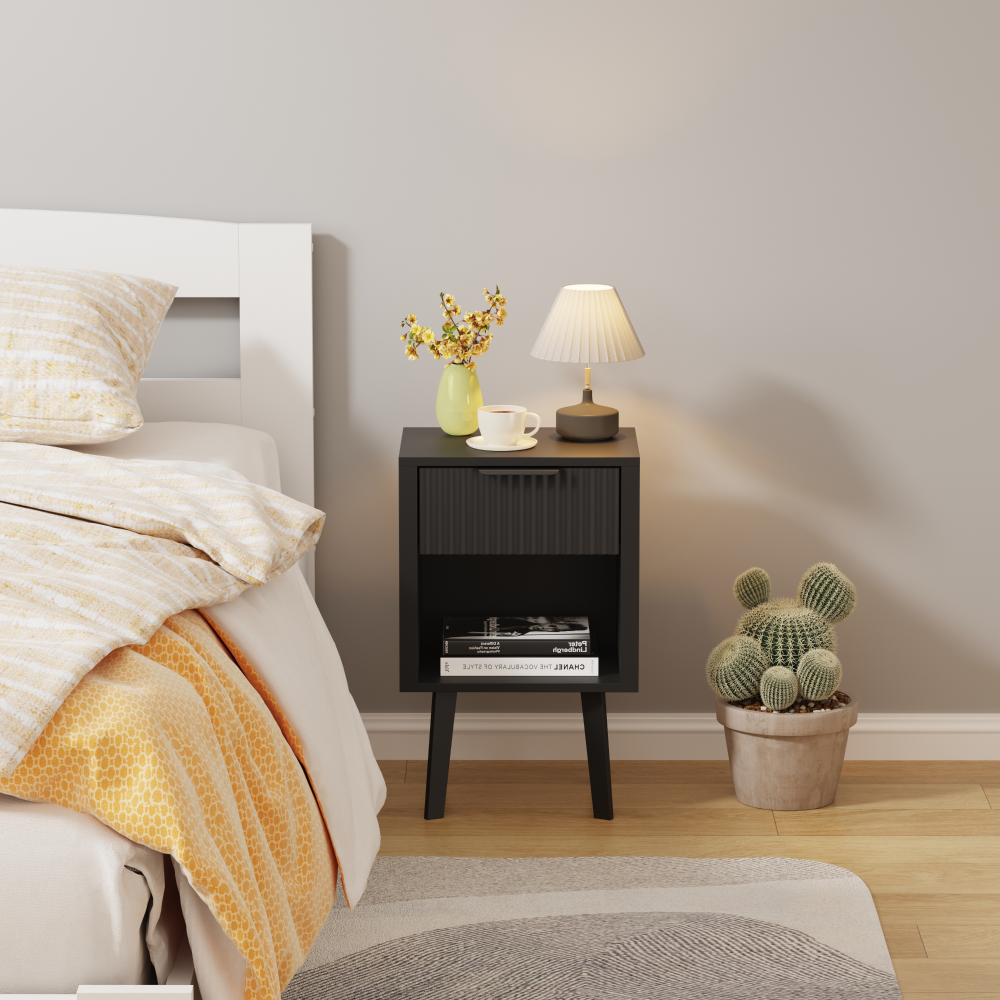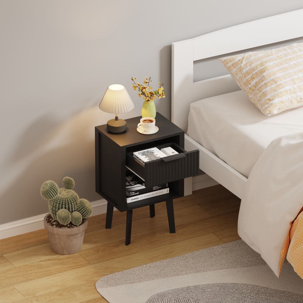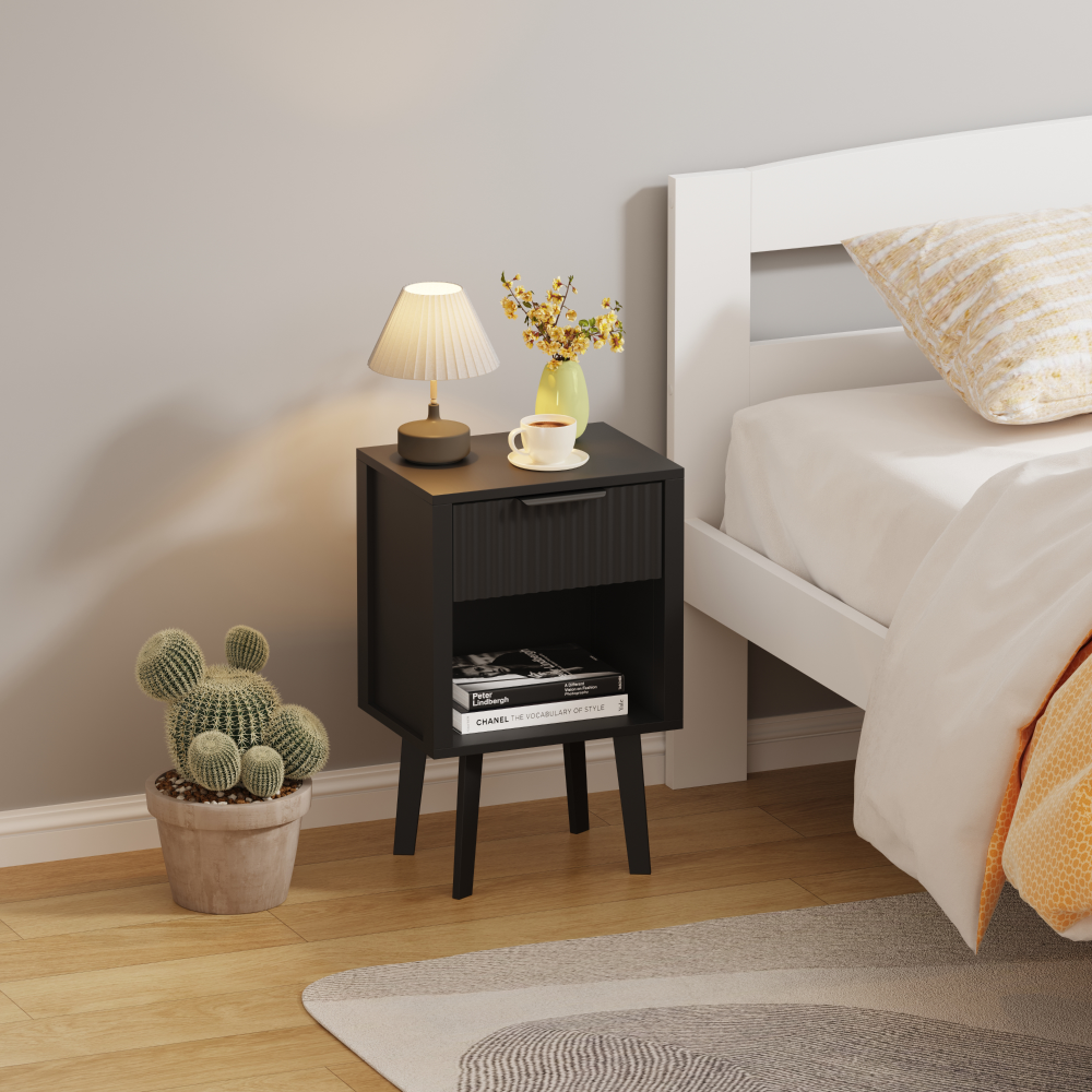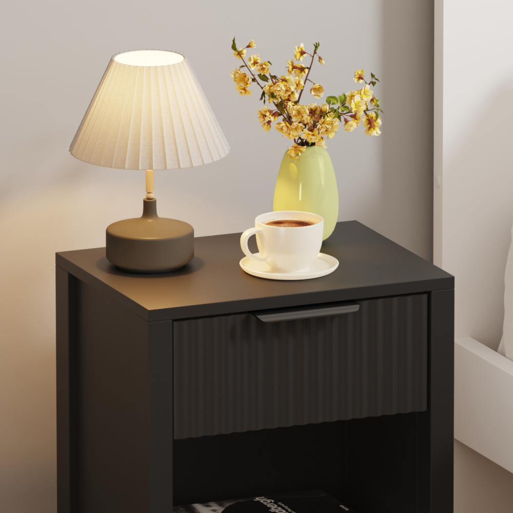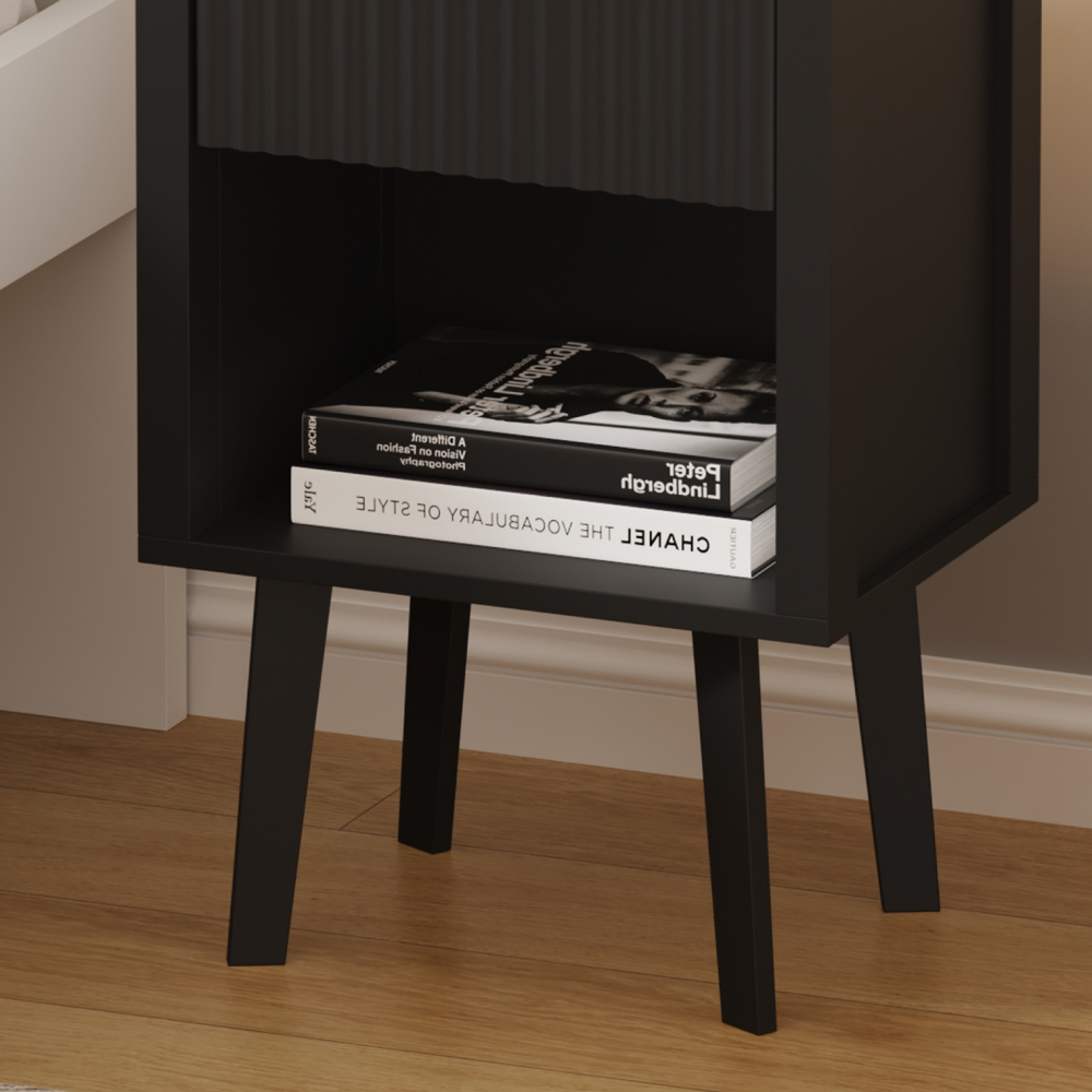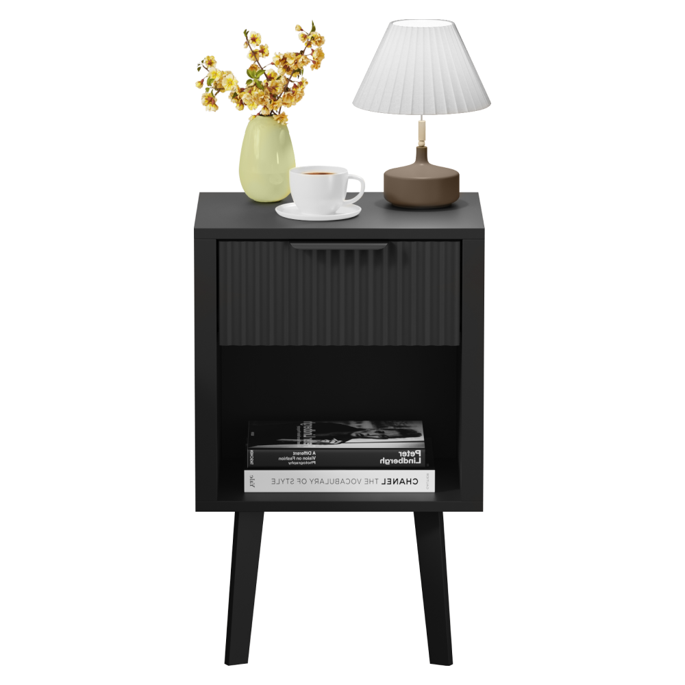 Material: DTD laminat Culoare: neagră Dimensiuni (lxAxh): 39x29x60,5 cm Portanţă: 10 kg Compartiment de depozitare deschis Înălţimea compartimentului de depozitare deschis: 21,5 cm Capacitatea spaţiului de depozitare deschis: 10 kg Sertar Portanţă sertar: 5 kg Mânere din plastic Culoarea mânerului: negru Pe picioare Înălţimea picioarelor: 22 kg Design modern Recomandăm ataşarea de perete Livrat dezasamblat