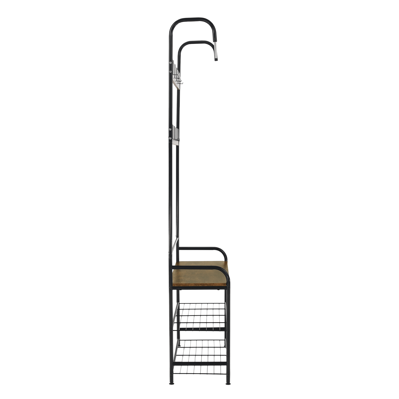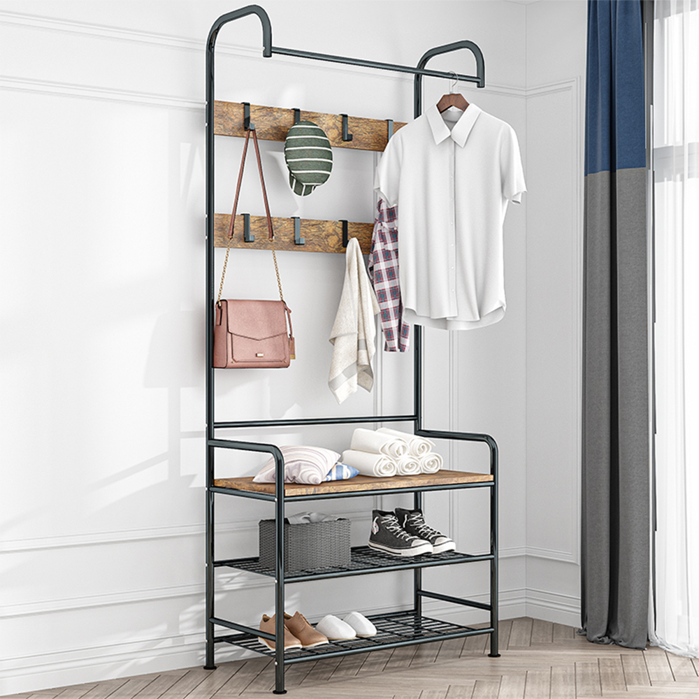 Material: metal / MDF laminat Culoare: negru / rustic lemn Dimensiuni (LxlxH): 79x32x185 cm Înălţimea de la sol la partea de jos a platformei: 4,5 cm Dimensiuni raft (lxH): 75x21.2 cm Grosime: 1,9 / 1,3 cm Capacitate de încărcare pe raft: 5 kg Capacitate de încărcare per umeraş: 2 kg Cu cârlige, tijă de suspendare, bancă de şezut Două rafturi metalice Furnizate nemontat