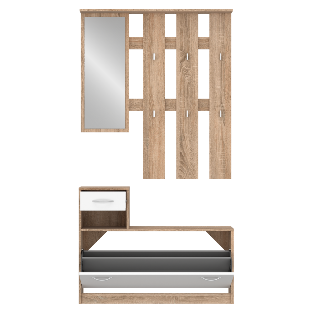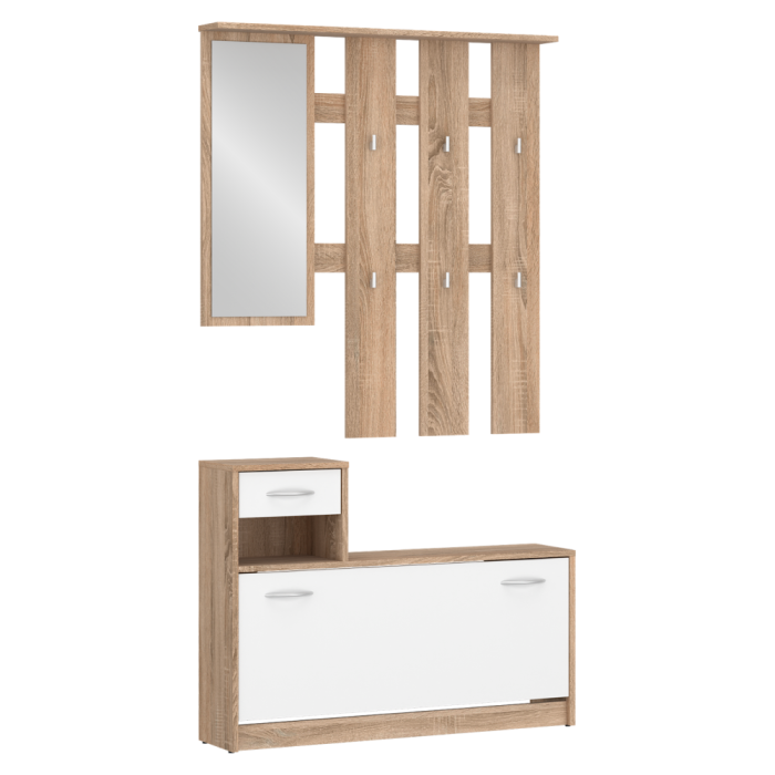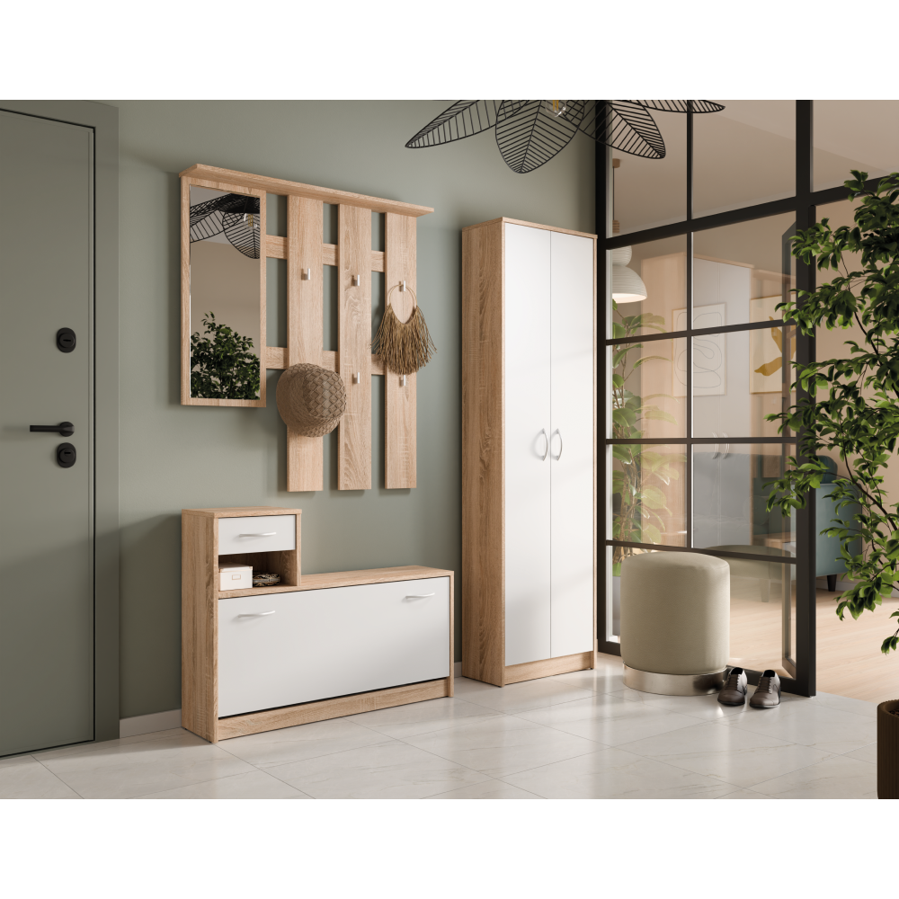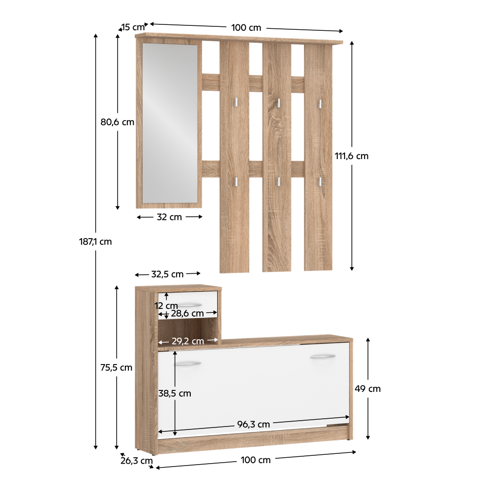 Material: DTD laminat Culoare: stejar sonoma/alb Dimensiuni (lxAxh): 100x26,3x187,1 cm Grosimea materialului: 1,6 cm Pantofar înclinat Portanţa poliţei: 5 kg Portanţa plăcii superioare: 15 kg Spaţiu de depozitare deschis Sertar Portanţa sertarului: 3 kg Portanţa plăcii superioare: 15 kg Oglindă Dimensiunile oglinzii (lxh): 32x80,6 cm Cu cârlige Material cârlige: plastic Culoare cârlige: argintiu Portanţă cârlig: 2 kg Cu mânere Material mâner: plastic Culoare mâner: argintiu Design modern Recomandăm fixarea de perete Setul de bază este fără dulap Livrat dezasamblat