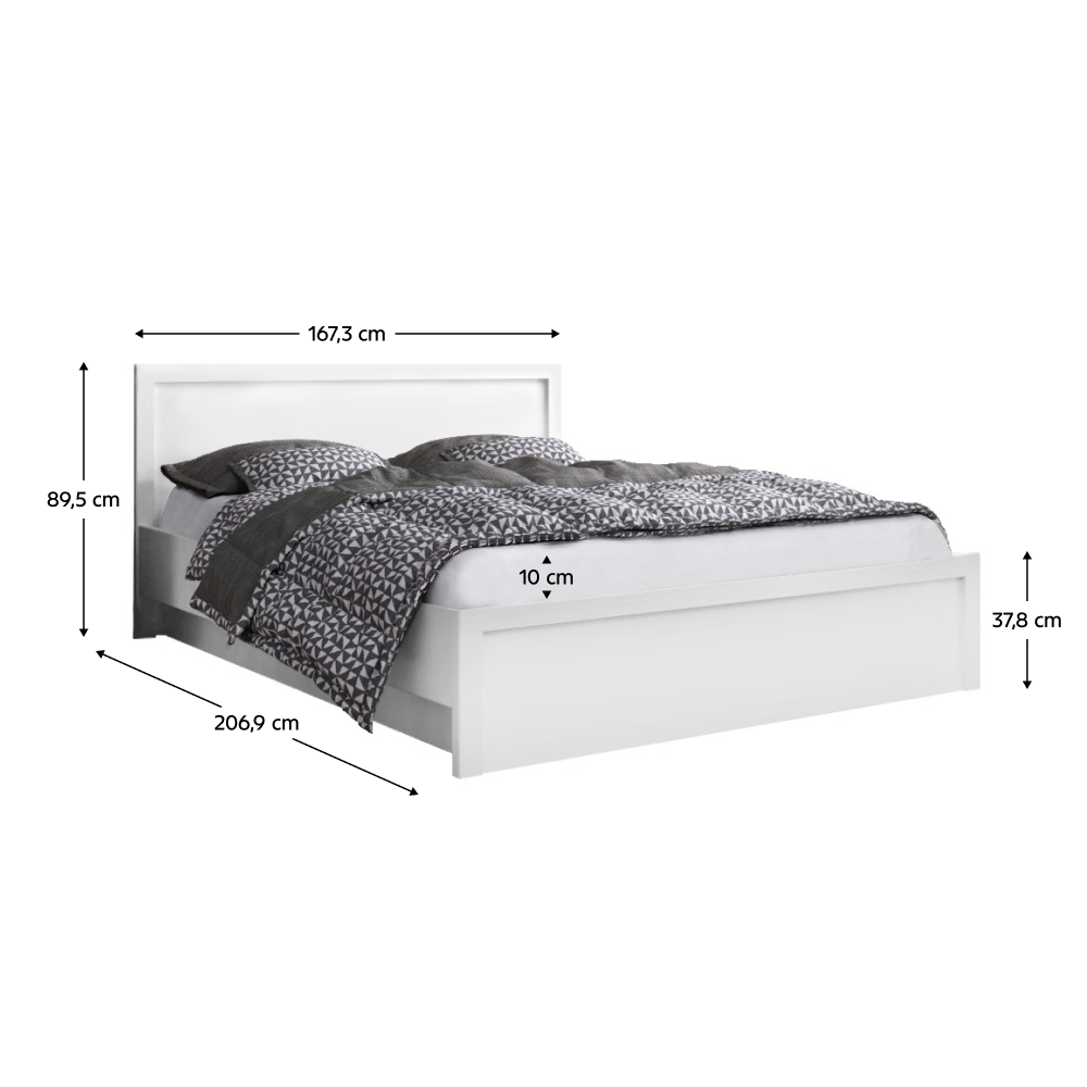 Material: PAL melaminat Culoare: albă Dimensiuni (LxAxÎ): 167,3x206,9x89,5 cm Grosimea materialului: 1,6 cm Suprafaţa pentru dormit (LxL): 160x200 cm Nivelul zonei de dormit: 37,8 cm Capacitate de susţinere per persoană: 100 kg Înălţimea minimă recomandată a saltelei: 10 cm Livrat fără saltea Opţiunea de a cumpăra o saltea din oferta noastră Picioare din plastic Cu spaţiu de depozitare Furnizat cu somieră rabatabilă Cadru metalic şi lamele din lemn Design modern Livrat dezasamblat