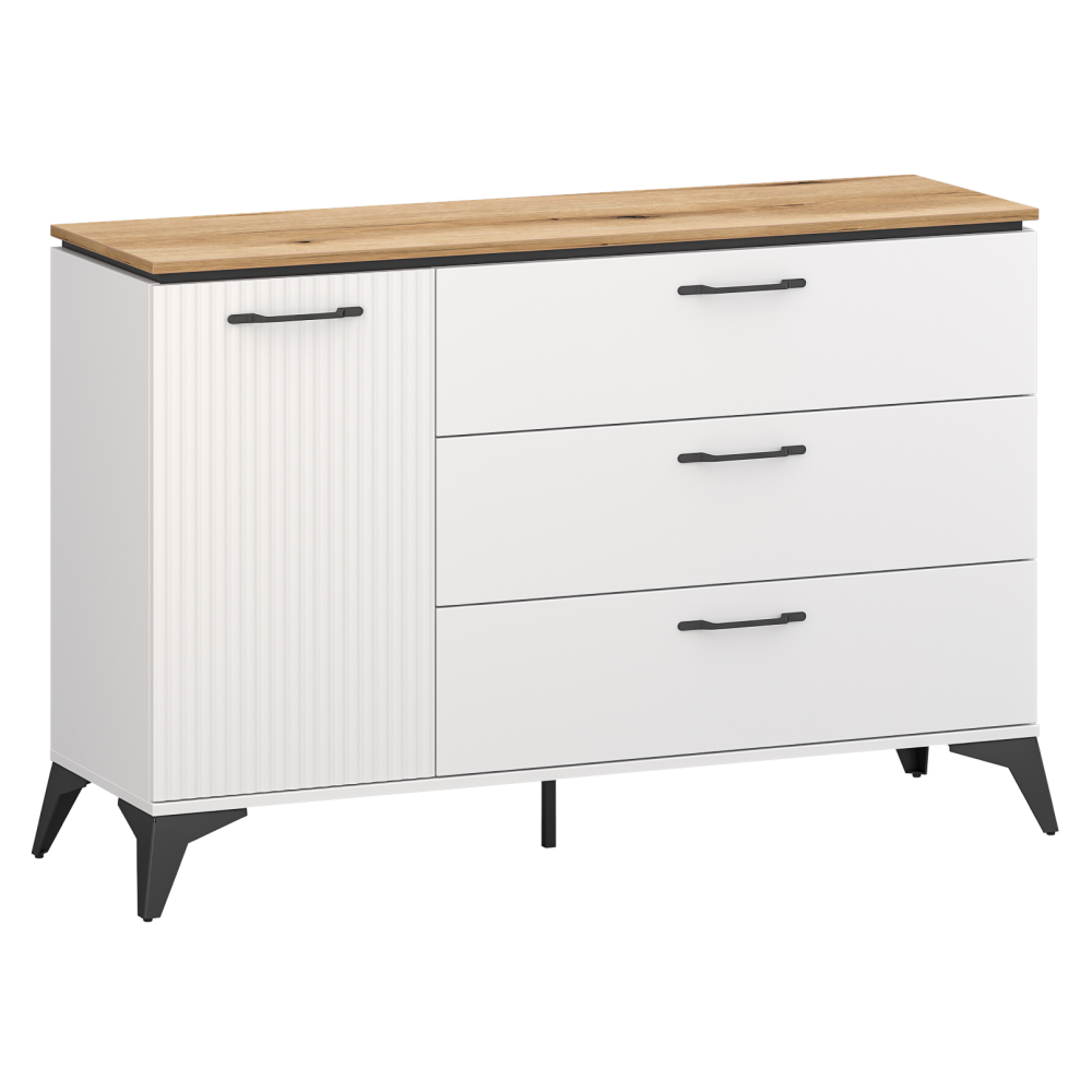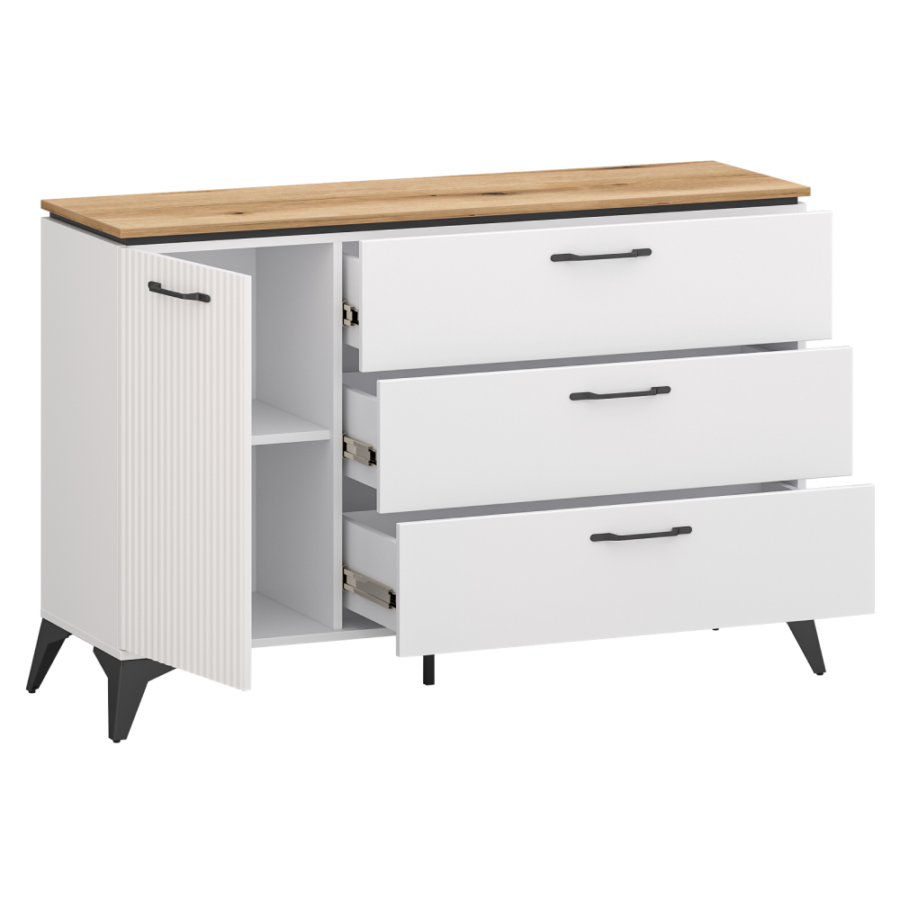 Material: DTD laminat/MDF înfoliat/PVC Culoare: alb/stejar evoke Dimensiuni (lxAxh): 134,7x43,5x86,2 cm Grosimea materialului: 1,6 cm Cu o uşă Poliţă Trei sertare Portanţă sertar: 5 kg Portanţa blatului superior: 30 kg Mânere metalice Culoare mânere: neagră Pe picioare Culoare picioare: negre Înălţime picioare: 14,5 cm Picior de sprijin central Uşă frezată decorativ Design modern Recomandăm fixarea de perete Livrată dezasamblată