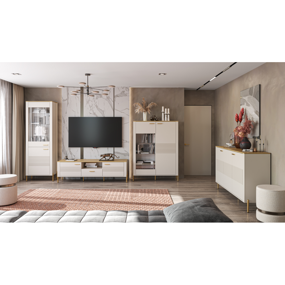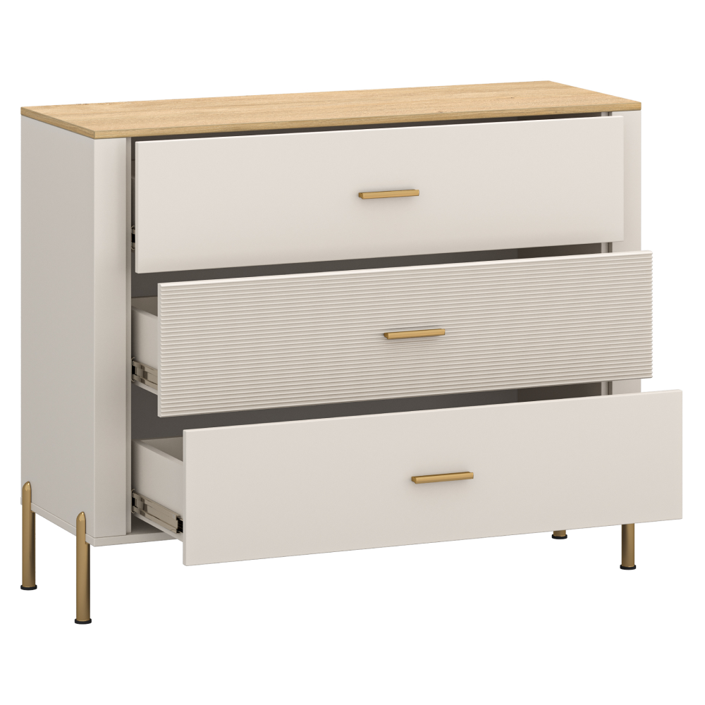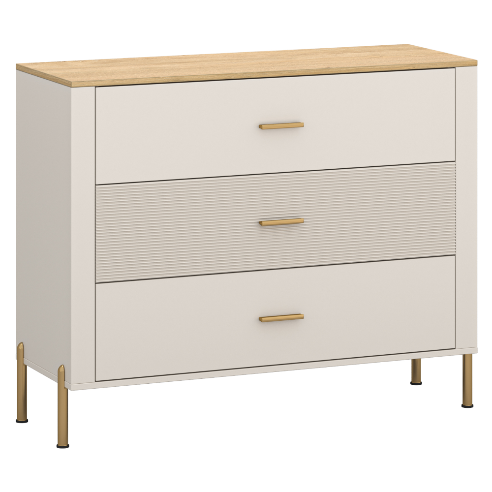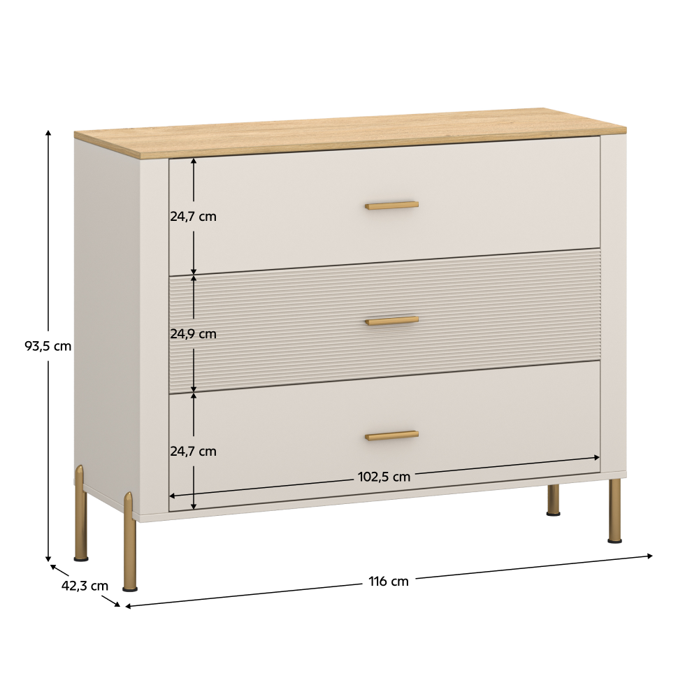 Material: DTD laminat/MDF înfoliat/PVC Culoare: caşmir/stejar de piatră Dimensiuni (lxAxh): 116x42,3x93,5 cm Grosimea materialului: 1,6 cm Trei sertare Portanţă sertar: 3 kg Cu ??mâner Material mâner: metal Culoare mâner: auriu Pe picioare Material picior: metal Culoare picior: aurie Înălţime picior: 15 cm Uşă frezată decorativ Design modern Recomandăm fixarea de perete Livrat dezasamblat