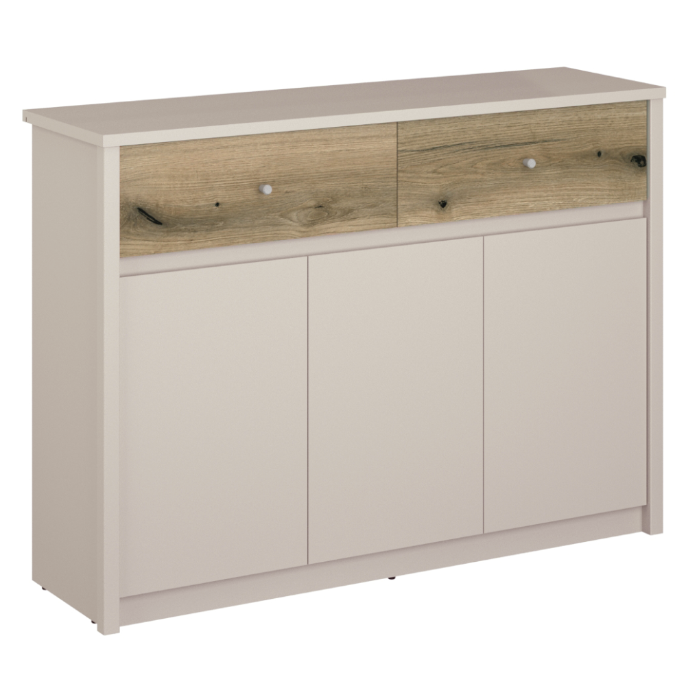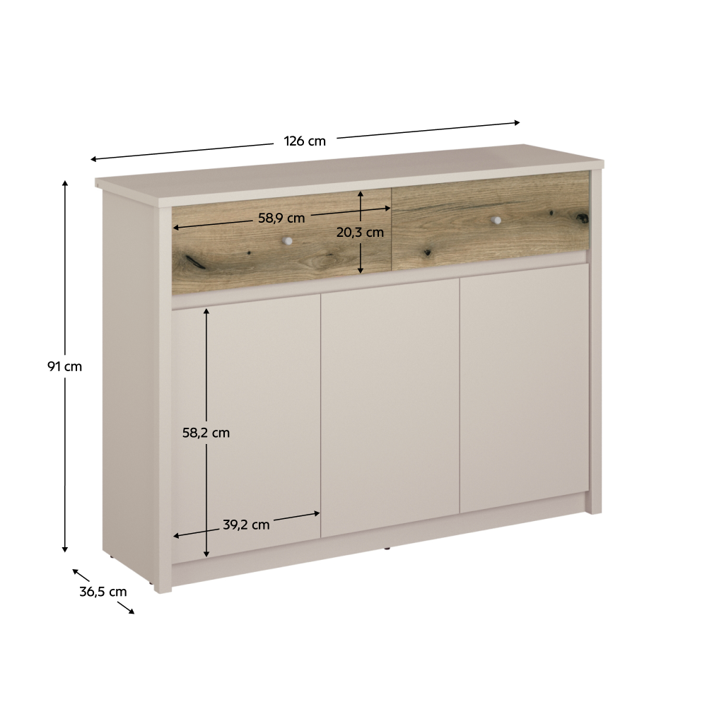 Material: DTD laminat Culoare: caşmir/stejar evoke Dimensiuni (lxAxh): 126x36,5x91 cm Grosimea materialului DTD: 1,6-3,2 cm Cu trei uşi 2x sertar Cu mâner Material mâner: plastic Culoare mâner: caşmir Portanţă sertar: 3 kg Cu poliţe Portanţa poliţei: 5 kg Fără mâner Crestătură oblică Culoarea plăcii dure: alb Glisoare Înălţimea glisoarelor: 0,3 cm Design modern Vă recomandăm să ataşaţi mobilierul de perete Livrat dezasamblat