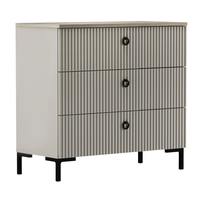 Material: MDF laminat DTD/înfoliat Culoare: gri-maroniu Taupe/stejar silverjack Dimensiuni (lxAxh): 85,2x40,7x80,9 cm Grosimea materialului DTD: 1,6-1,8 cm Grosimea materialului MDF: 1,9 cm Trei sertare Înălţimea sertarului: 20 cm Portanţa plăcii superioare: 10 kg Portanţă sertar: 3 kg Cu mânere Material mâner: metal Culoare mâner: negru mat Pe picioare Înălţimea picioarelor: 12 cm Material picior: plastic Culoare picior: negru mat Uşi decorative frezate Design modern Recomandăm fixarea pe perete Livrat dezasamblat