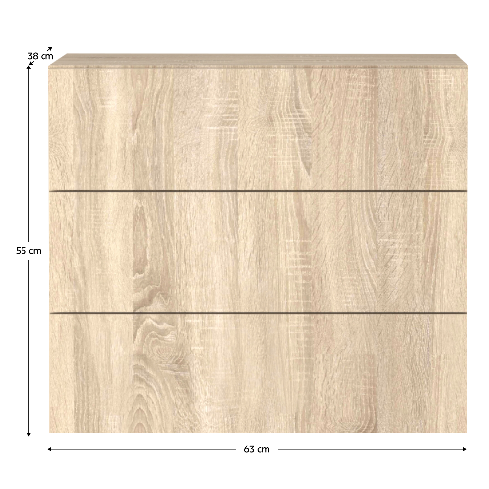 Material: DTD laminat Culoare: stejar sonoma Dimensiuni (lxAxh): 63x38x55 cm Grosimea materialului DTD: 1,6-2,2 cm Portanţa plăcii superioare: 10 kg Trei sertare Portanţă sertar: 3 kg Rulment cu bile extensibil complet Margine: hârtie impregnată cu polimeri termoreactivi Grosime DTD partea din spate/fund sertar: 0,3 cm Culoarea părţii din spate/fund sertar: stejar sonoma Fără mânere Sistem de deschidere tactilă PUSH UP Design modern Recomandăm fixarea de perete Livrat dezasamblat
