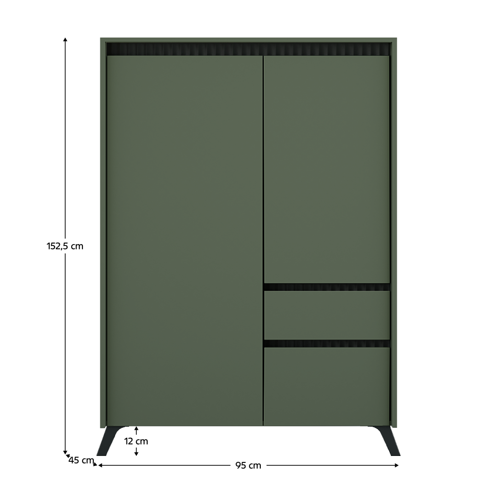 Material: DTD laminat/MDF înfoliat/folia PVC Culoare: verde smoke/negru Dimensiuni (lxAxh): 95x45x152,5 cm Grosimea materialului: 1,6-1,9 cm Cu două uşi Dulap cu basculant Un sertar Poliţă Pe picioare Culoarea piciorului: negru Înălţimea picioarelor: 12 cm Rulmenţi cu bile extensibile complet Balamale Margine: hârtie impregnată cu polimeri termoreactivi/PVC Grosimea materialului ABS: 0,5 mm Grosime placă aglomerată partea din spate/fund sertar: 0,3 cm Culoare partea din spate/fund sertar: stejar închis milano Frezare decorativă Fără mânere Design modern Livrat dezasamblat