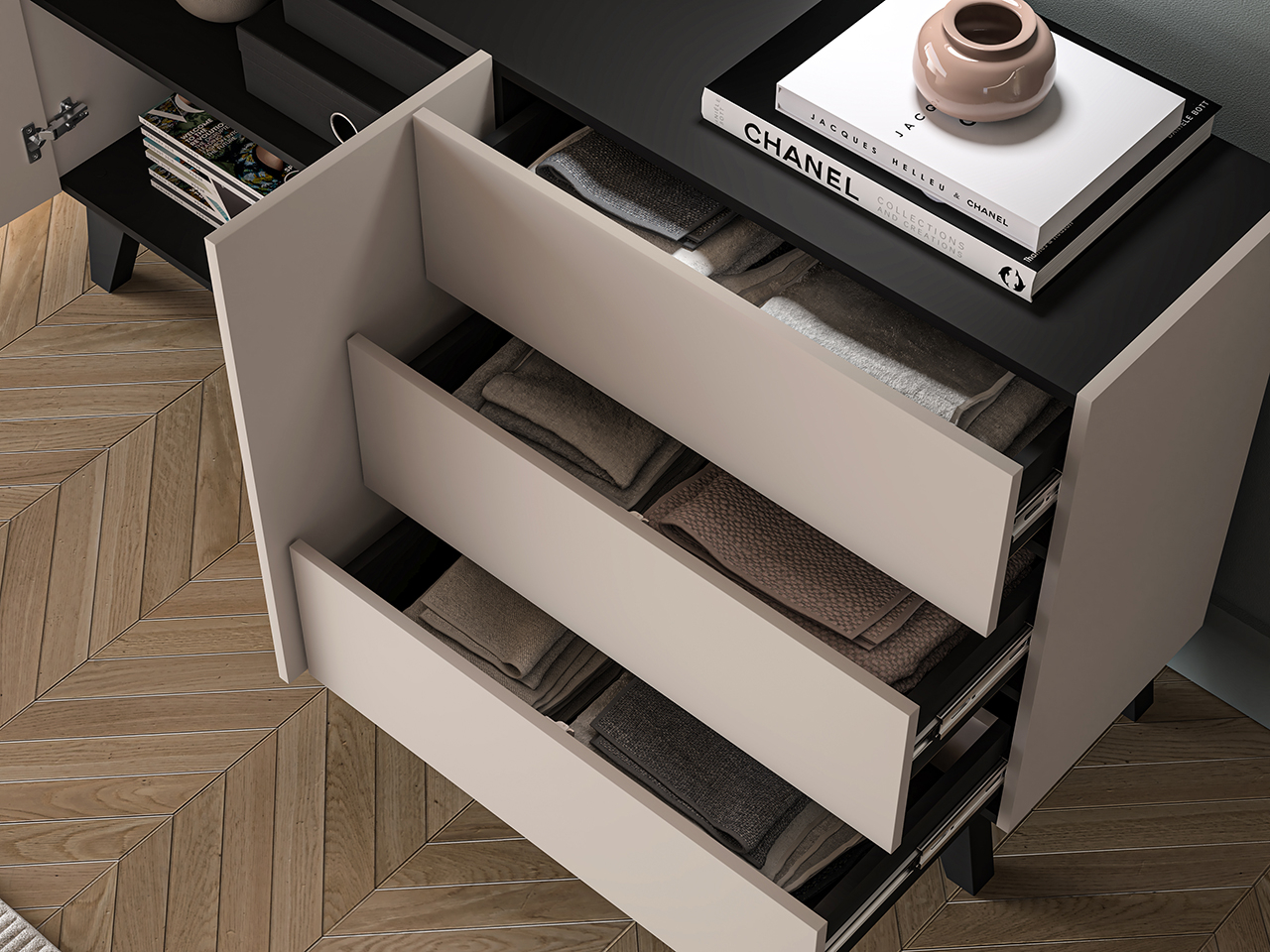 Comoda cu 2 usi si 3 sertare , pal casmir/negru, pe picioare, 160cm lungime x 40cm adancime x 85 cm inaltime, deschidere push open, canturi abs, inchidere usi silentioasa