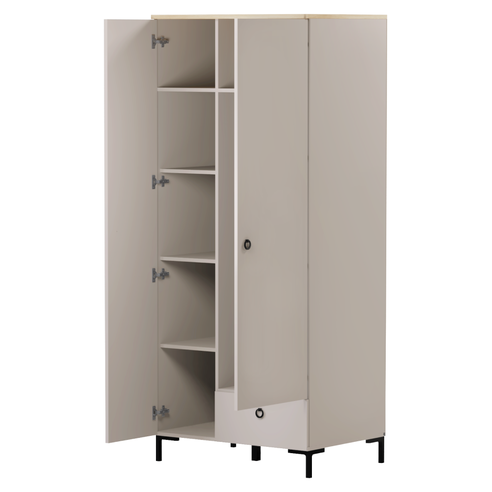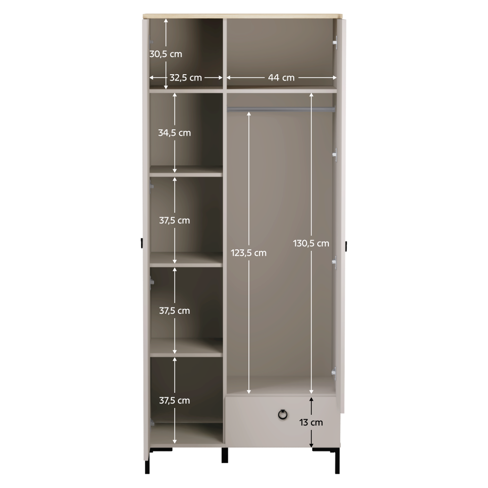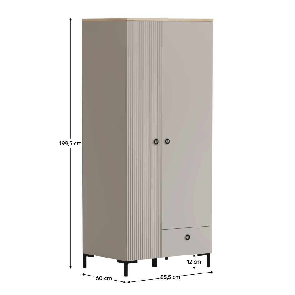 Material: MDF laminat DTD/înfoliat Culoare: gri-maroniu Taupe/stejar silverjack Dimensiuni (lxAxh): 85,5x60x199,5 cm Grosimea materialului DTD: 1,6-1,8 cm Grosimea materialului MDF: 1,9 cm Cu două uşi, Cu poliţe, Bară de umeraşe, Un sertar, Portanţa blatului superior: 10 kg Portanţa poliţei: 5 kg Portanţă sertar: 3 kg Cu mânere Material mâner: metal Culoare mâner: negru mat Pe picioare Înălţimea picioarelor: 12 cm Material picior: plastic Culoare picior: negru mat Uşi decorative frezate Design modern Recomandăm fixarea pe perete Livrat dezasamblat