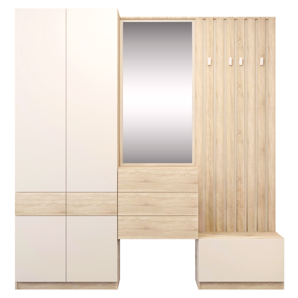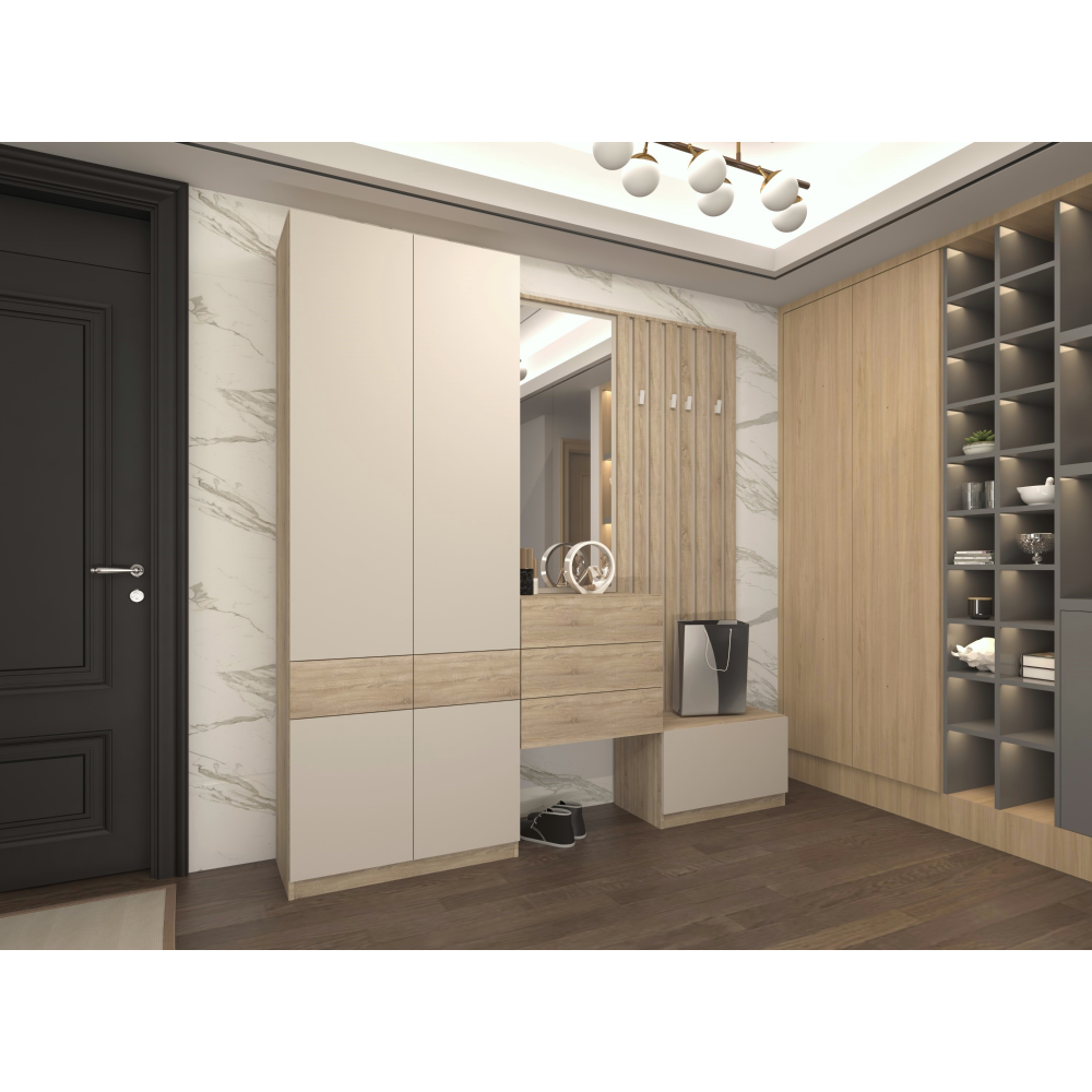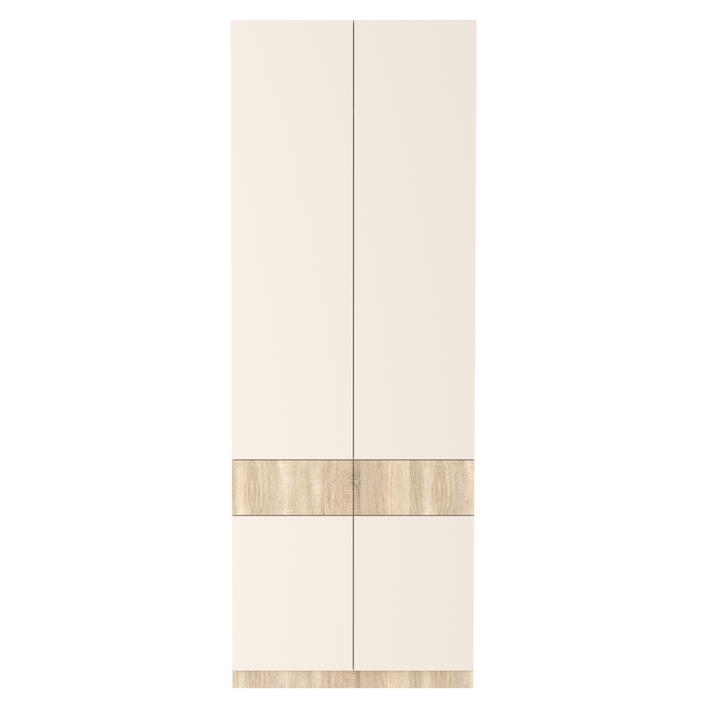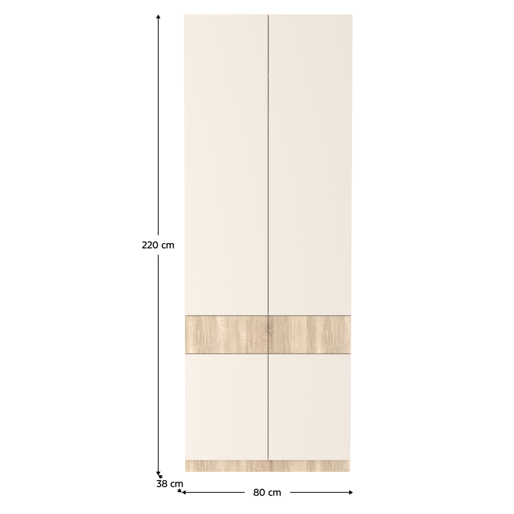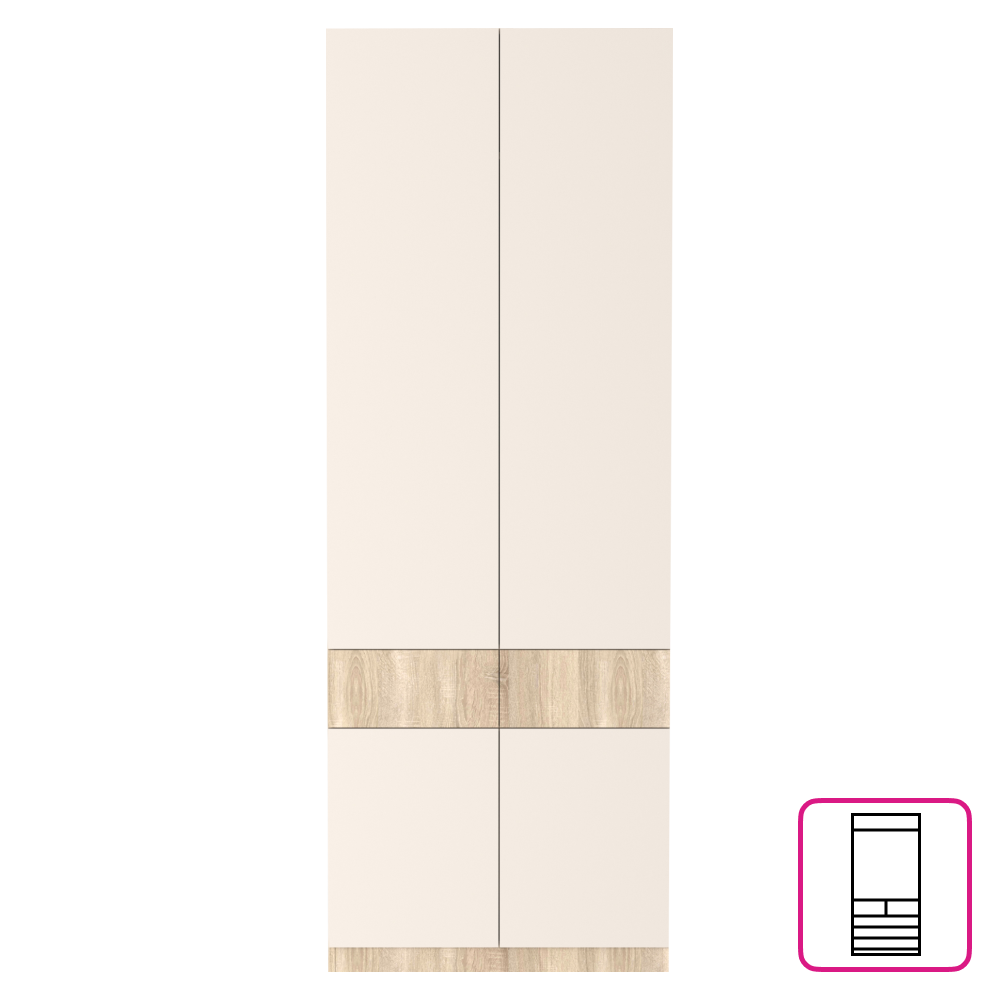 Material: DTD laminat Culoare: stejar sonoma/caşmir Dimensiuni (lxAxh): 80x38x220 cm Grosimea materialului DTD: 1,6-2,2 cm Cu patru uşi Bară pentru umeraşe Portanţa barei de umeraşe extensibile: 8 cm Cu poliţe Portanţa poliţei: 7 kg Două sertare Portanţă sertar: 3 kg Rulment cu bile extensibil complet Balamale Margine: hârtie impregnată cu polimeri termoreactivi DTD grosime spate/fundul sertarului: 0,3 cm Culoarea părţii din spate/fund sertar: stejar sonoma Fără mânere Sistem de deschidere tactilă PUSH UP Glisiere din plastic Design modern Recomandăm fixarea de perete Livrat dezasamblat