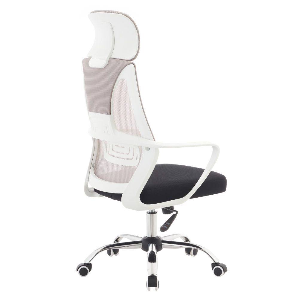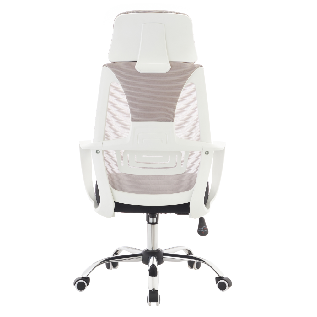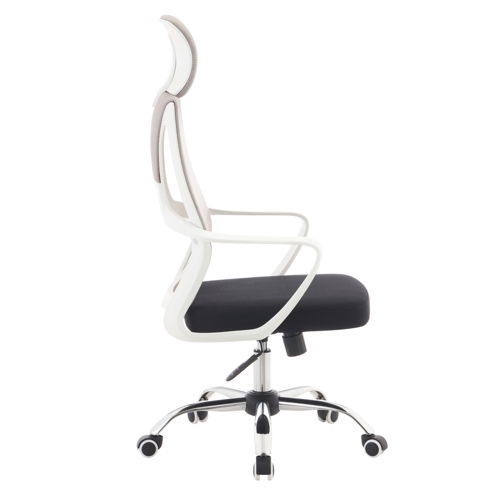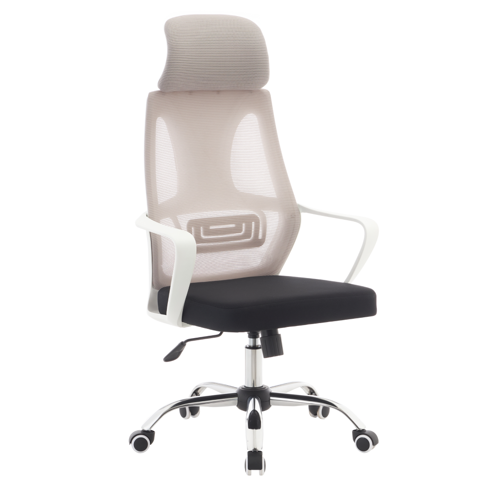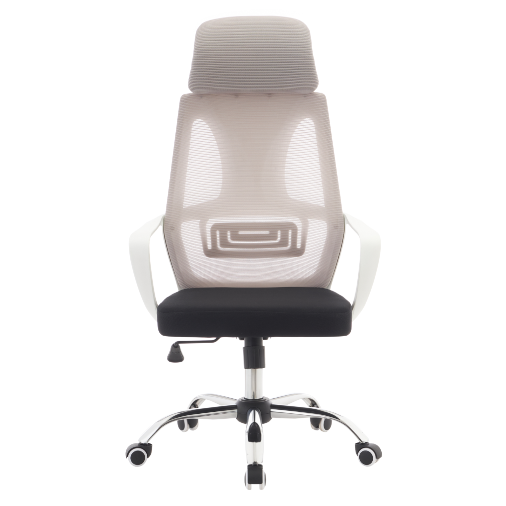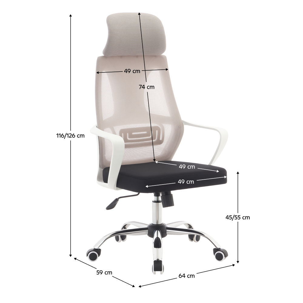 Material: plasă/ţesătură/plastic/metal Rezistenţa plasă: 90 000 Martindale Rezistenţa ţesătură: 80 000 Martindale Culoare: gri/negru/alb Dimensiuni (lxAxh):64x59x116-126 cm Înălţimea reglabilă a şezutului:45-55 cm Adâncime şezut: 49 cm Lăţime şezut: 49 cm Înălţime spătar: 74 cm Lăţime spătar: 49 cm Greutate susţinută 110 kg Cu tetieră Cu mânere Mecanism de balansare Baza stea de crom Roţi universale Potrivite pentru orice tip de podele Se livrează demontat