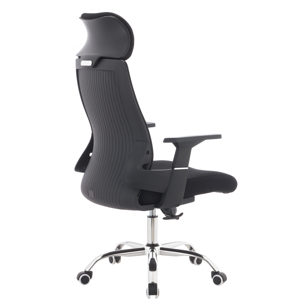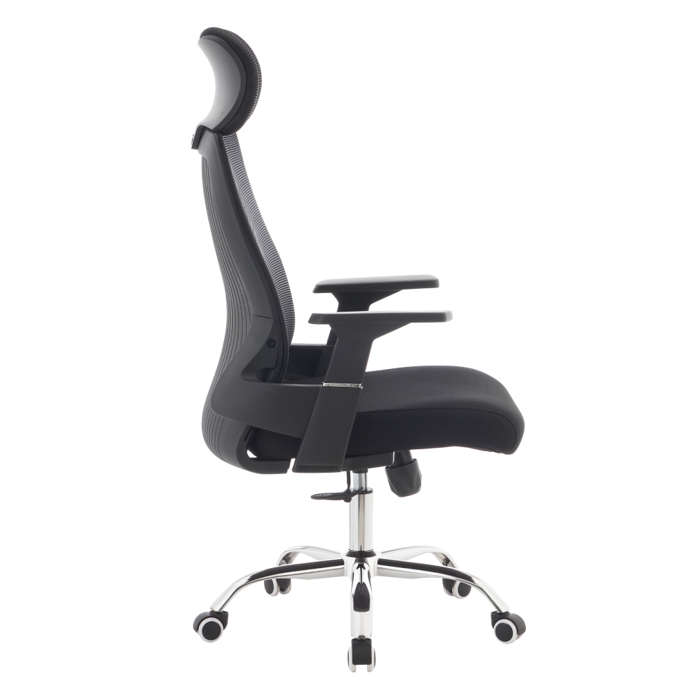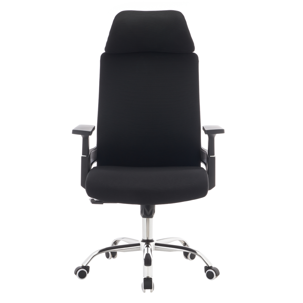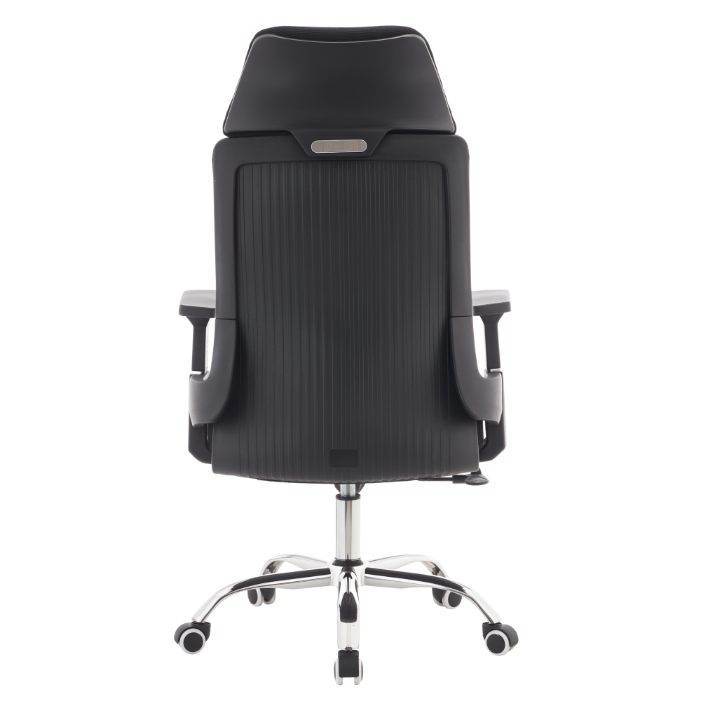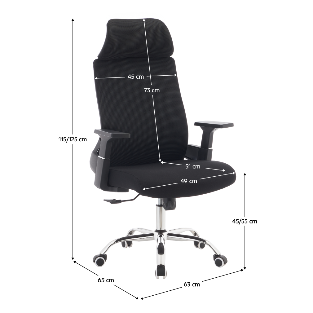 Material: plasă/ţesătură/plastic/metal Rezistenţa plasei conform testului Martindale: 90 000 de cicluri de frecare Rezistenţa ţesăturii la frecare conform testului Martindale: 80 000 de cicluri de frecare Culoare: neagră/crom Dimensiuni (lxAxh): 63x65x115-125 cm Înălţime părţii de şezut: 45-55 cm Adâncimea părţii de şezut: 51 cm Lăţimea părţii de şezut: 49 cm Lăţime spătar: 45 cm Înălţime spătar: 73 cm Portanţă: 150 kg Scaun pivotant Mecanism de legănare Înălţime reglabilă a scaunului Cu cotiere Cu tetieră Roţi universale Potrivit atât pentru podele moi, cât şi pentru podele dure Livrat dezasamblat