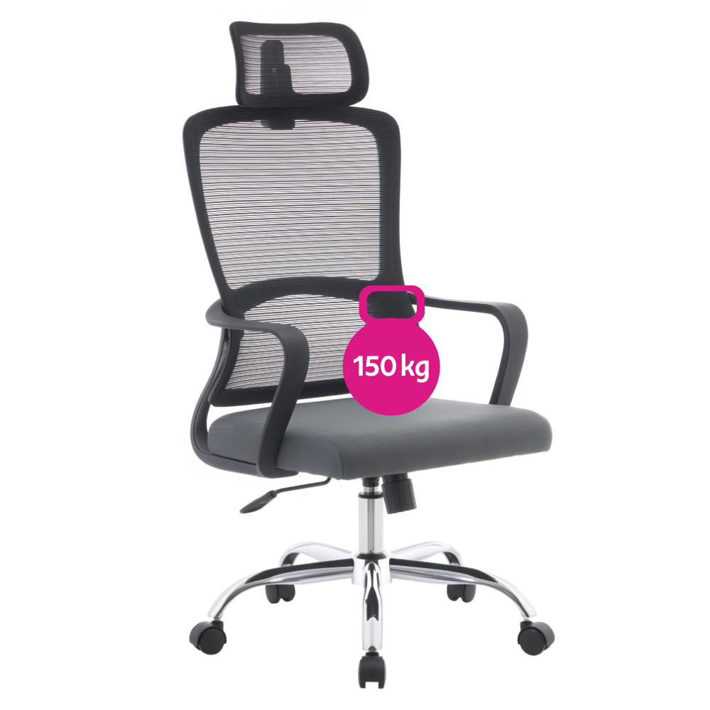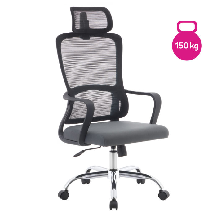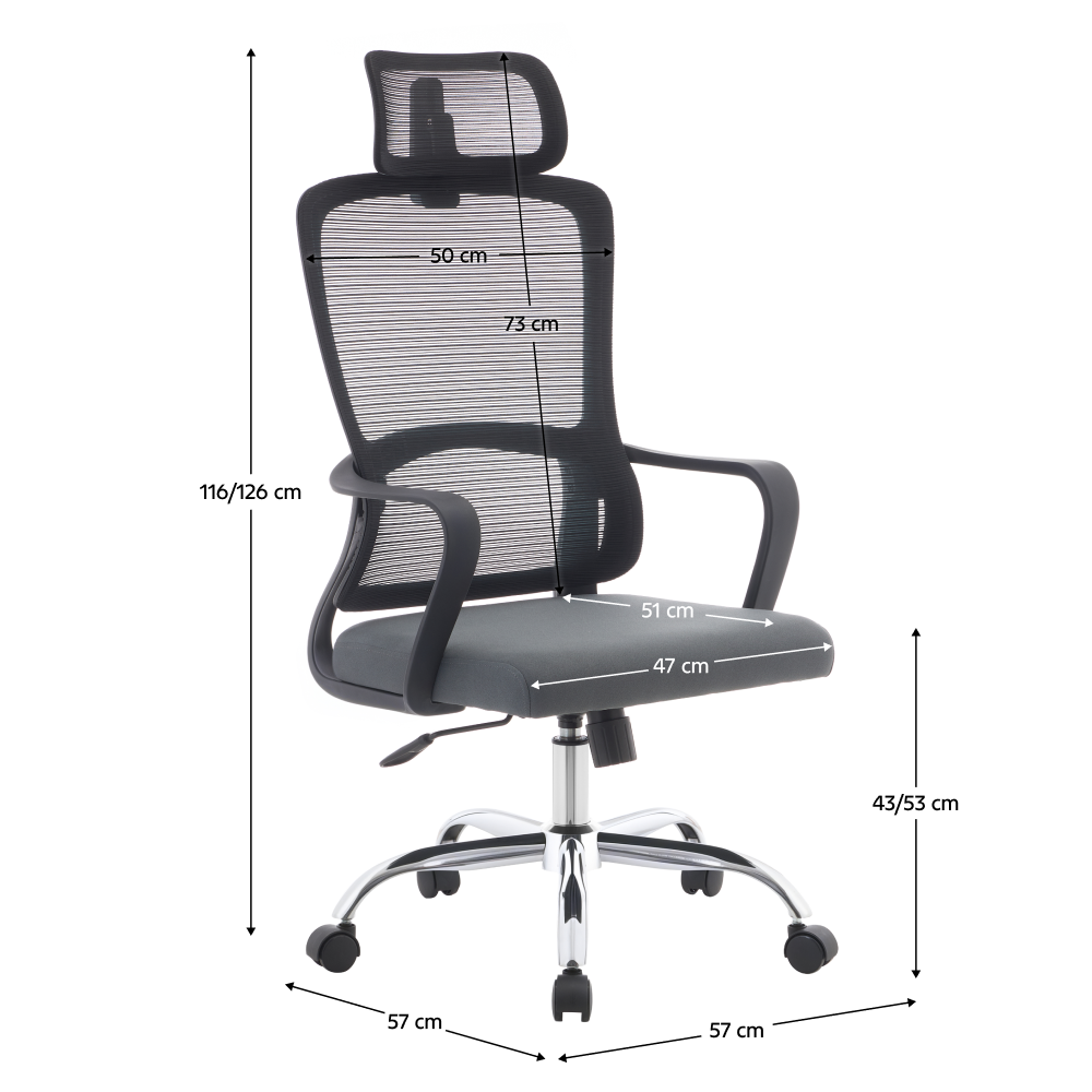Material: plasă/ţesătură/plastic/metal Rezistenţa plasei conform testului Martindale: 90 000 de cicluri de frecare Rezistenţa ţesăturii la frecare conform testului Martindale: 80 000 de cicluri de frecare Culoare: neagră/gri/crom Dimensiuni (lxAxh): 57x57x116-126 cm Înălţimea părţii de şezut: 43-53 cm Adâncimea părţii de şezut: 51 cm Lăţimea părţii de şezut: 47 cm Lăţime spătar: 50 cm Înălţime spătar: 73 cm Portanţă: 150 kg Scaun pivotant Mecanism de legănare Înălţime reglabilă a scaunului Cu cotiere Cu tetieră Roţi universale Potrivit atât pentru podele moi, cât şi pentru podele dure Livrat dezasamblat