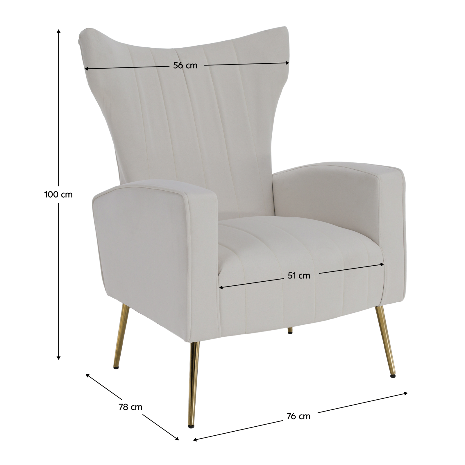 Material: ţesătură Velvet/pin/placaj/metal Rezistenţa ţesăturii la frecare conform testului Martindale: 75 000 de cicluri de frecare Culoare: bej Dimensiuni (lxAxh): 76x78x100 cm Înălţimea părţii de şedere: 44 cm Adâncimea părţii de şezut: 53 cm Lăţimea părţii de şezut: 51 cm Înălţime spătar: 56 cm Lăţime spătar: 71 cm Portanţă: 120 kg Umplutură: spumă standard (24kg/m3) Cusături decorative Complet tapiţat Design relaxant Confortabil Livrat dezasamblat