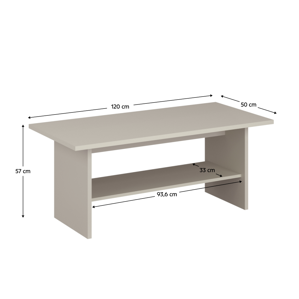 Material: DTD laminat Culoare: caşmir Dimensiuni (lxAxh): 120x50x57 cm Grosime material DTD: 1,6-3,2 cm Spaţiu de depozitare deschis Dimensiuni spaţiu de depozitare (lxA): Portanţa a spaţiului de depozitare 93,6x33 cm: 5 kg Portanţă placă superioară: 10 kg Design modern Livrată dezasamblată