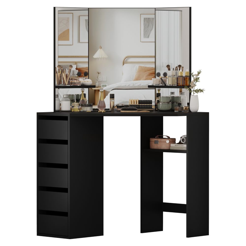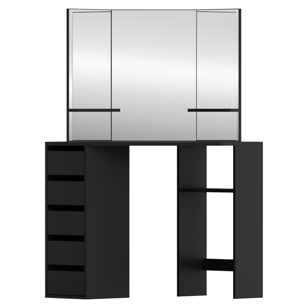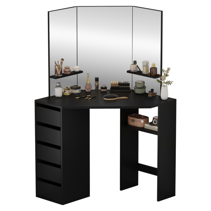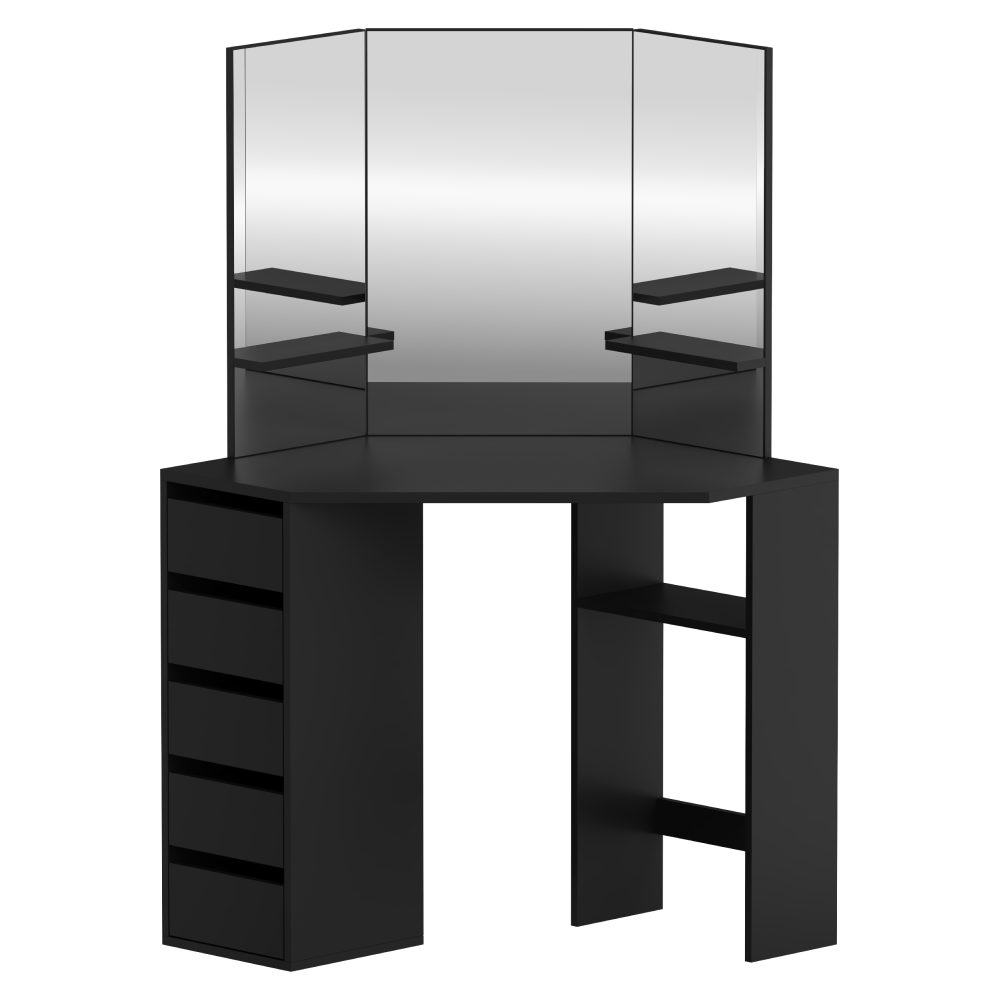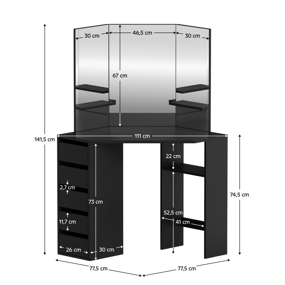 Material: MDF laminat Culoare: neagră Dimensiuni (lxAxh): 111x54x141,5 cm Adâncimea blatului de masă la mijloc: 54 cm Grosime material: 1,6 cm Colţ Cu sertar de depozitare Dimensiunile sertarului (Lxh): 26x11,7 cm Portanţă sertar: 15 kg Capacitatea de încărcare a poliţei: 10 kg Oglindă de 3 piese Design modern Recomandăm ataşarea de perete Livrat dezasamblat