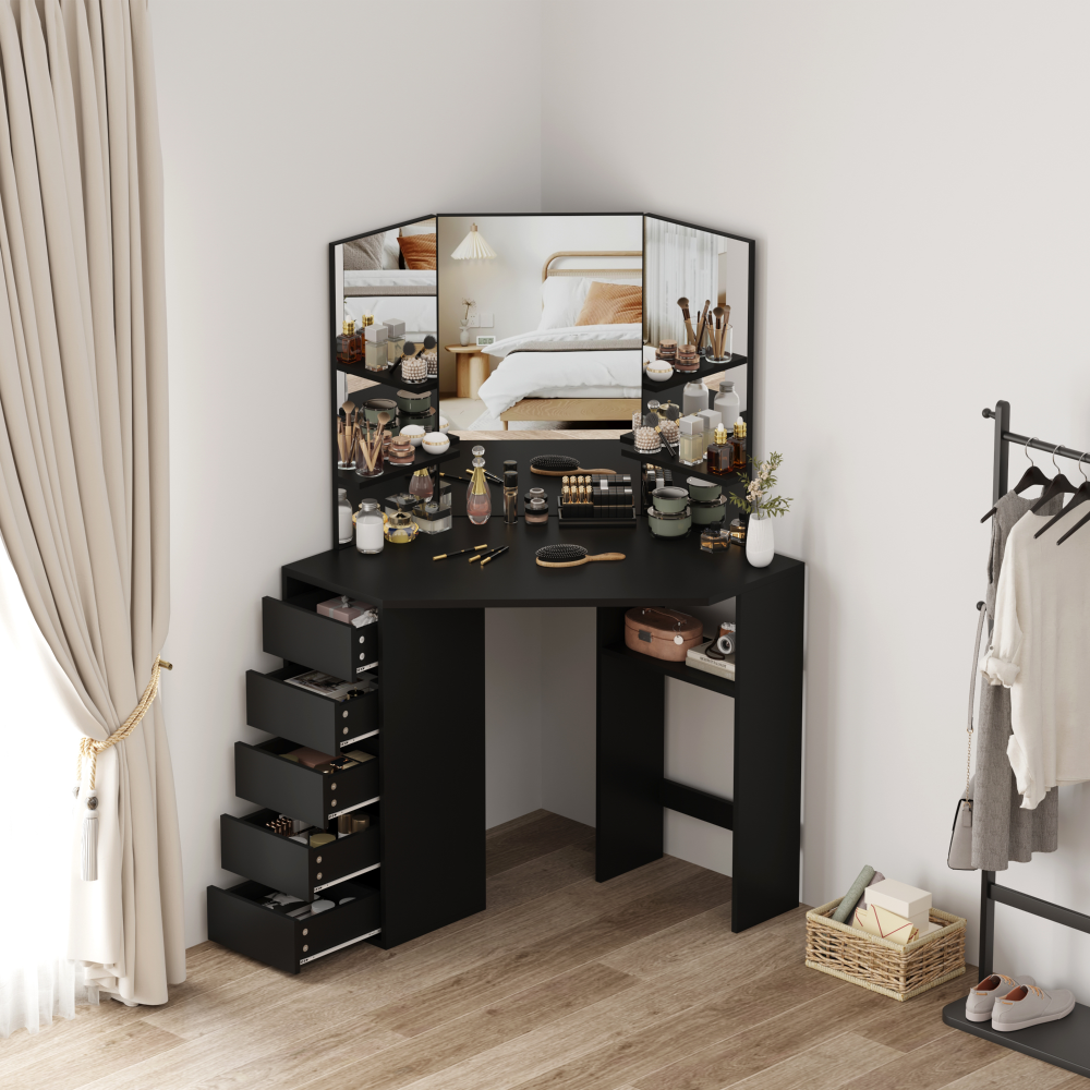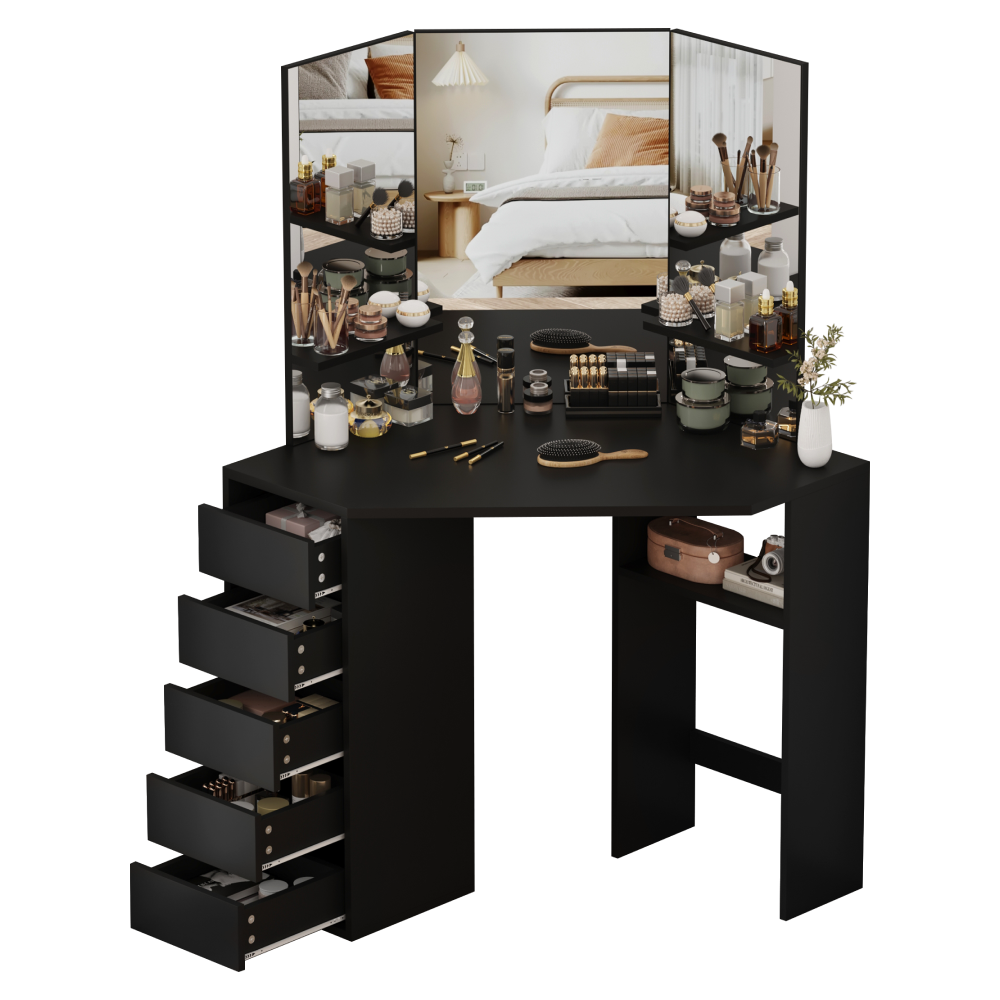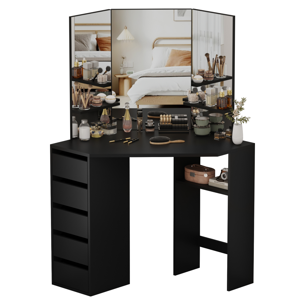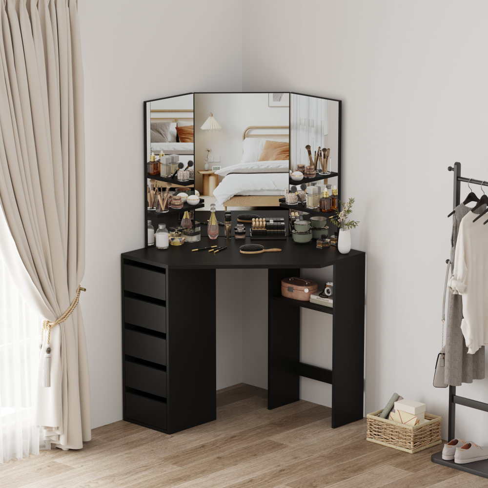 Material: MDF laminat Culoare: neagră Dimensiuni (lxAxh): 111x54x141,5 cm Adâncimea blatului de masă la mijloc: 54 cm Grosime material: 1,6 cm Colţ Cu sertar de depozitare Dimensiunile sertarului (Lxh): 26x11,7 cm Portanţă sertar: 15 kg Capacitatea de încărcare a poliţei: 10 kg Oglindă de 3 piese Design modern Recomandăm ataşarea de perete Livrat dezasamblat