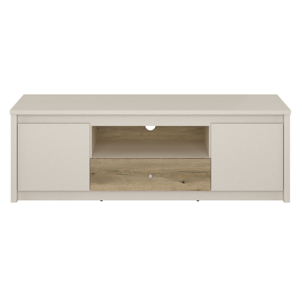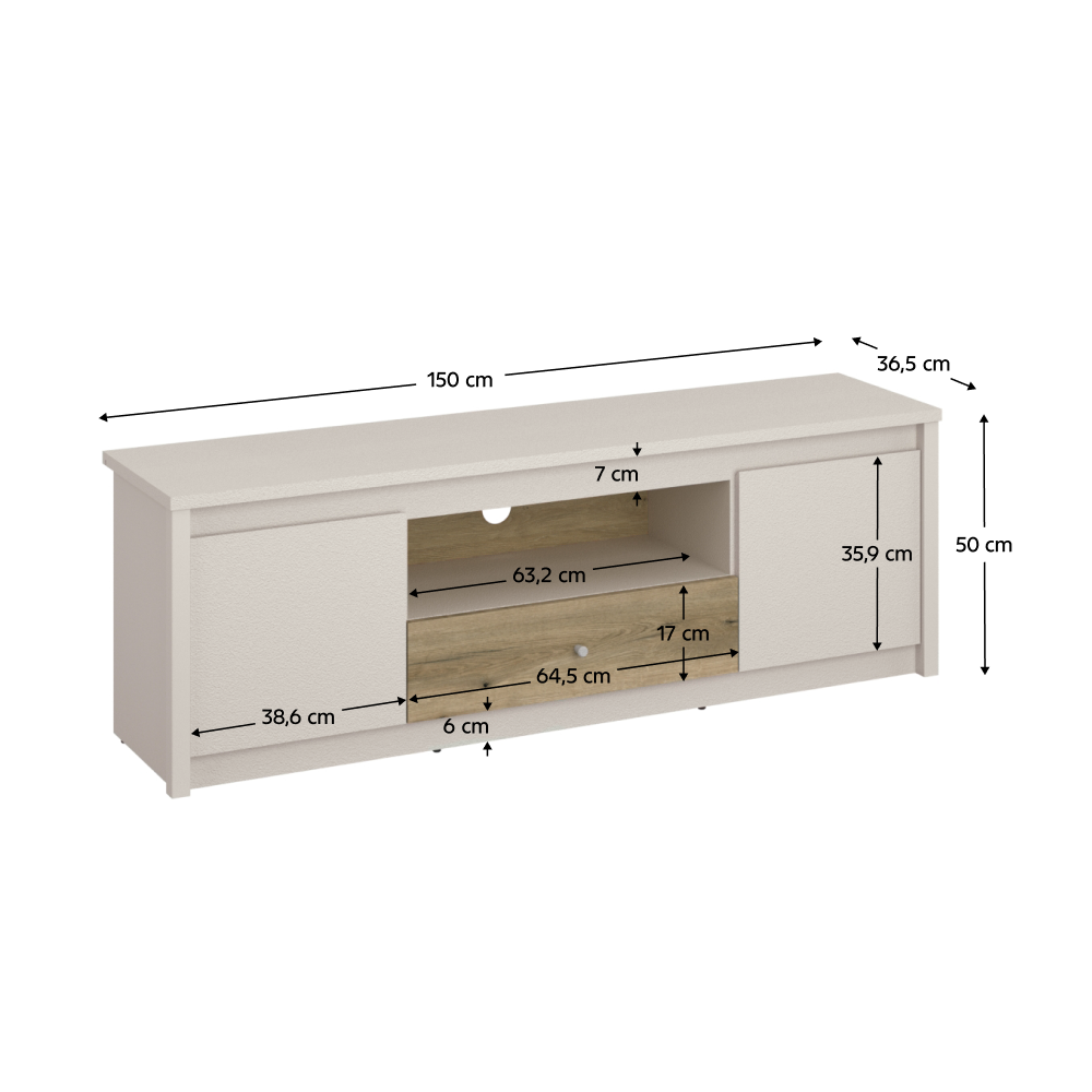 Material: DTD laminat Culoare: caşmir/stejar evoke Dimensiuni (lxAxh): 150x36,5x50 cm Grosime material DTD: 1,6-3,2 cm, Cu două uşi Cu spaţiu de depozitare deschis Cu sertar Cu mâner, Material mâner: plastic, Culoare mâner: caşmir, Portanţă sertar: 3 kg 2x dulap Fără mâner Crestătură oblică Culoarea plăcii de placă fibrolemnoasă: stejar evoke Portanţa plăcii superioare: 10 kg Glisoare Înălţimea glisoarelor: 0,3 cm Orificiu pentru trecerea cablurilor Design modern Recomandăm ataşarea pe perete Livrată dezasamblată